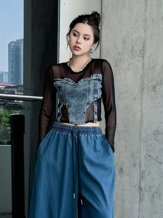 10%OFFMesh stitch denim top