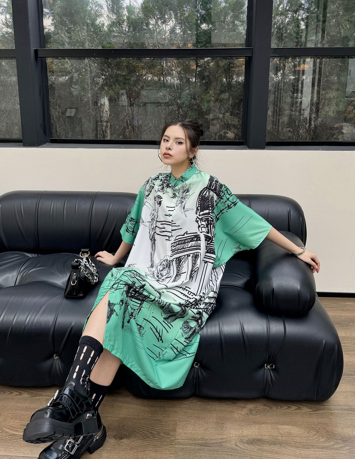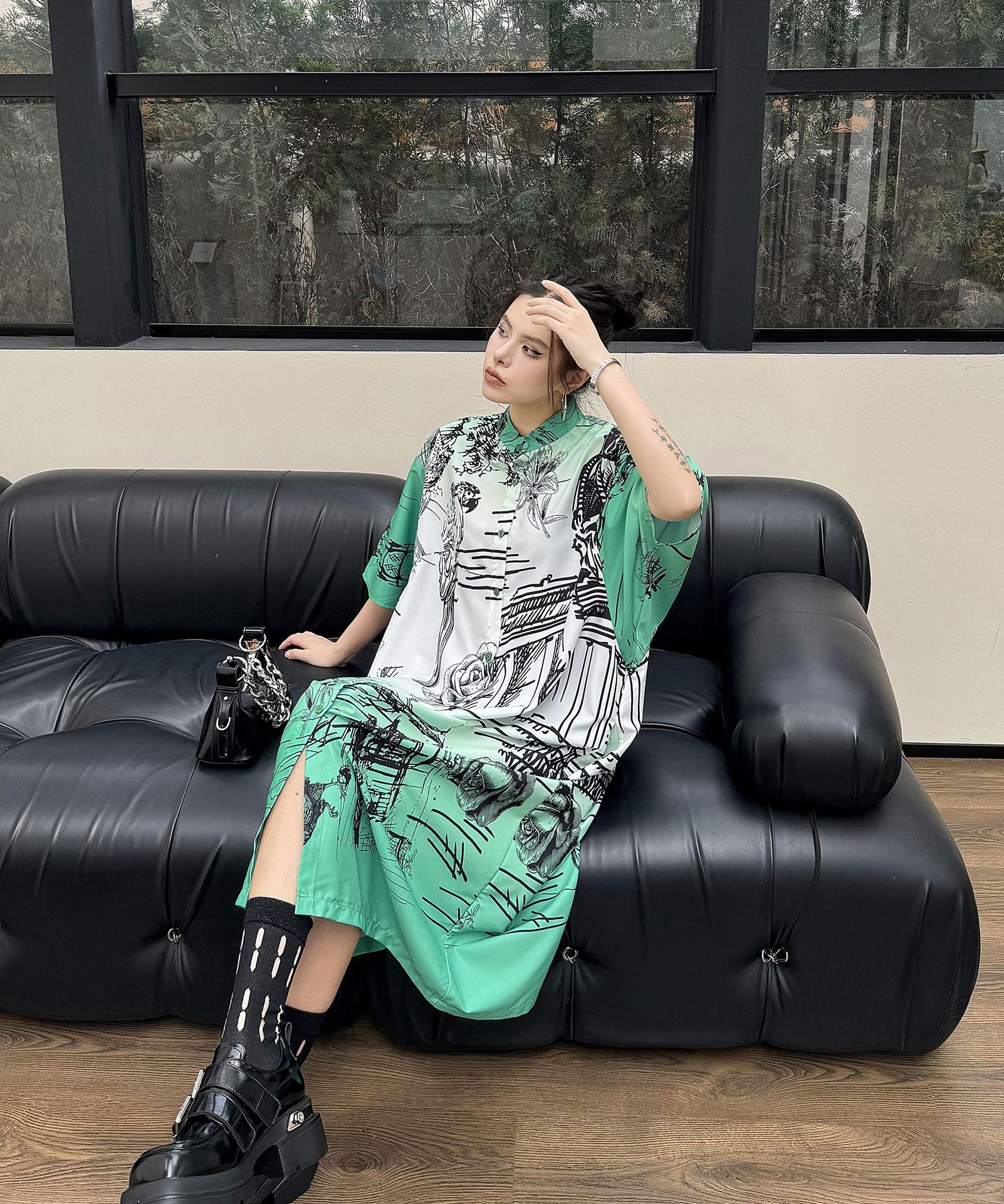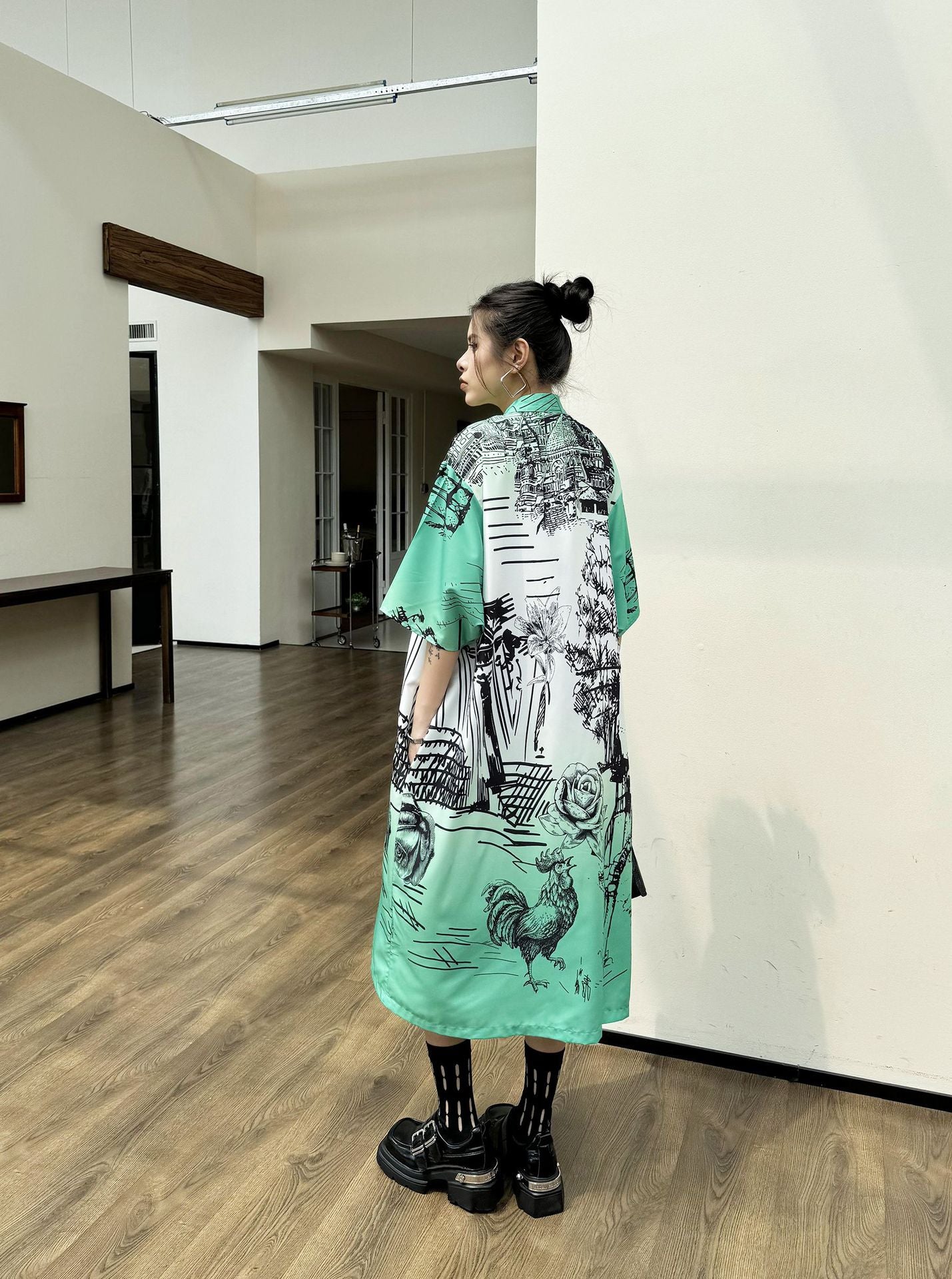 This set consists of a blouse with an impressive scarf tie and wide pants with a belt of the same pattern. The blouse has a relaxed silhouette with a draped feel, and the scarf flowing from the neck accentuates the vertical line. The cuffs are gathered for a soft finish, adding just the right amount of volume. The pants have an elastic waistband for a comfortable fit, and the loose material creates a leg-lengthening effect. The overall lightweight construction allows you to enjoy an elegant look as they sway gracefully with every movement.