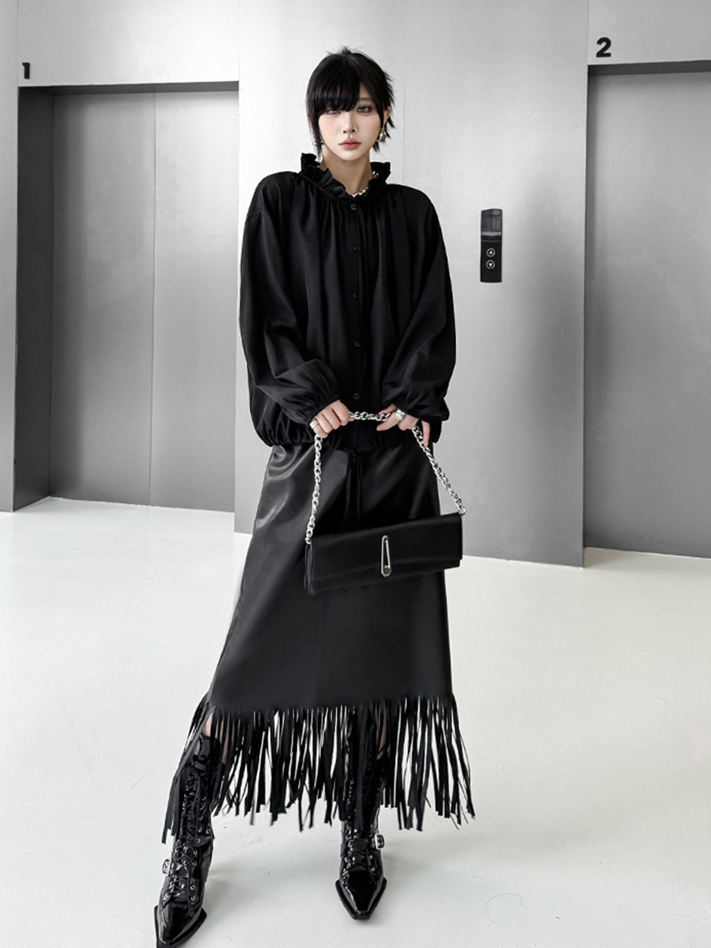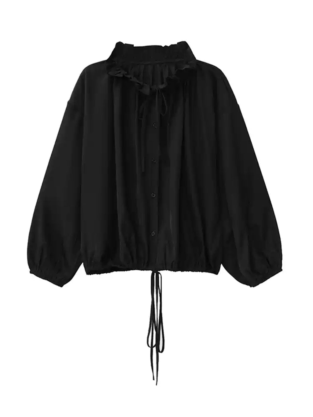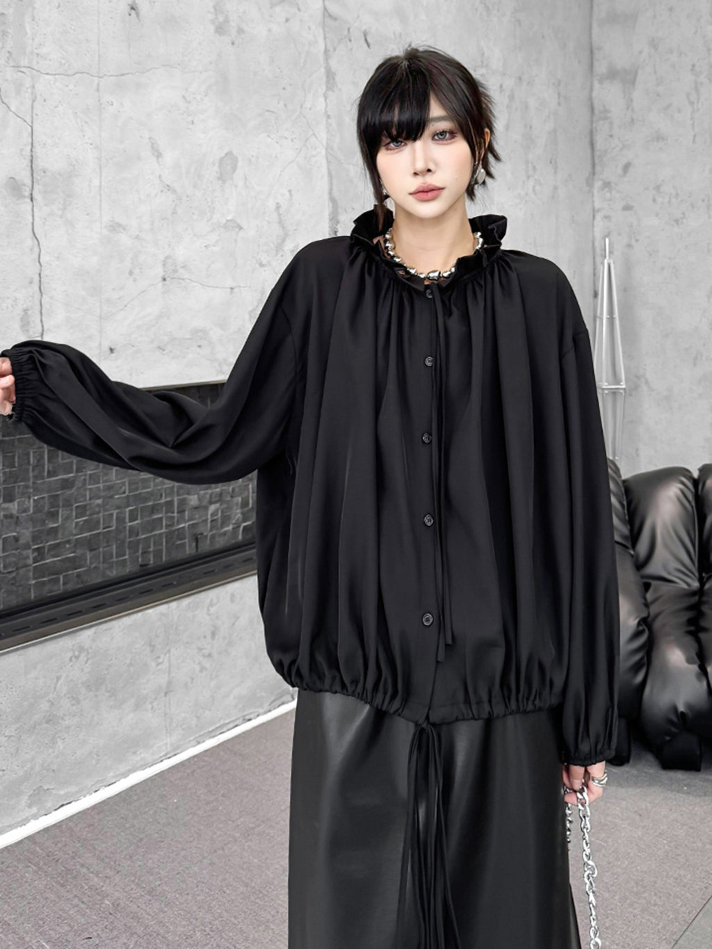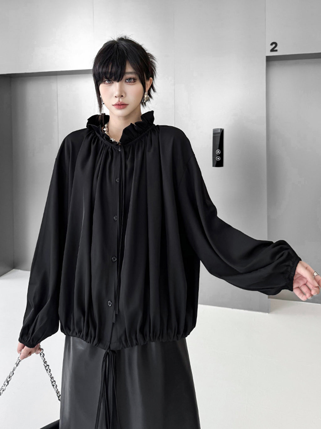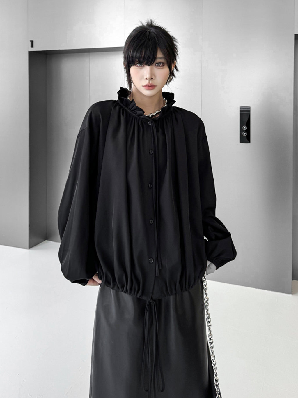 This set consists of a blouse with an impressive scarf tie and wide pants with a belt of the same pattern. The blouse has a relaxed silhouette with a draped feel, and the scarf flowing from the neck accentuates the vertical line. The cuffs are gathered for a soft finish, adding just the right amount of volume. The pants have an elastic waistband for a comfortable fit, and the loose material creates a leg-lengthening effect. The overall lightweight construction allows you to enjoy an elegant look as they sway gracefully with every movement.