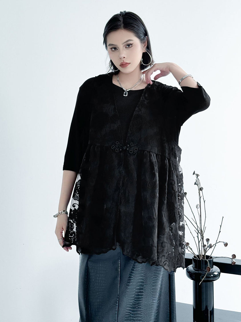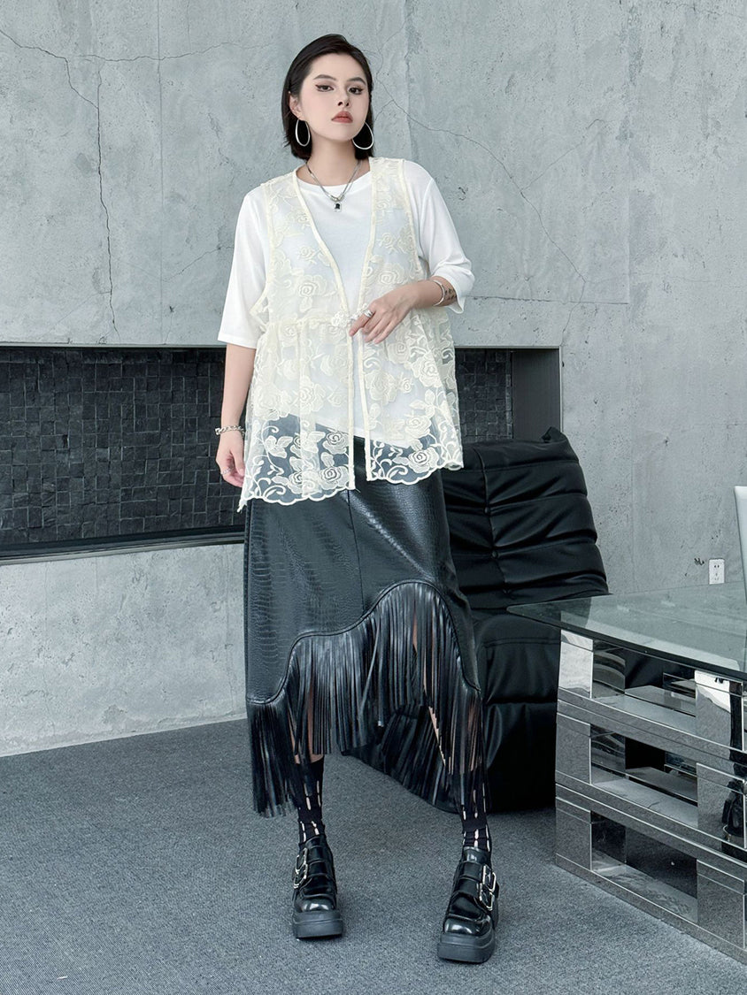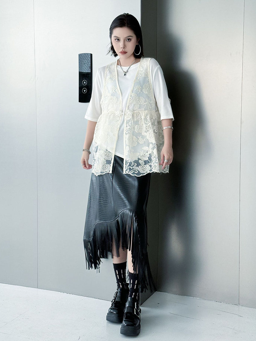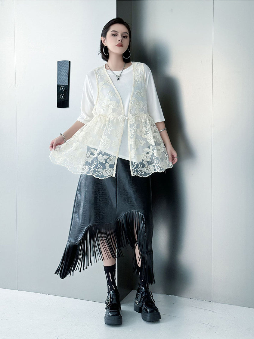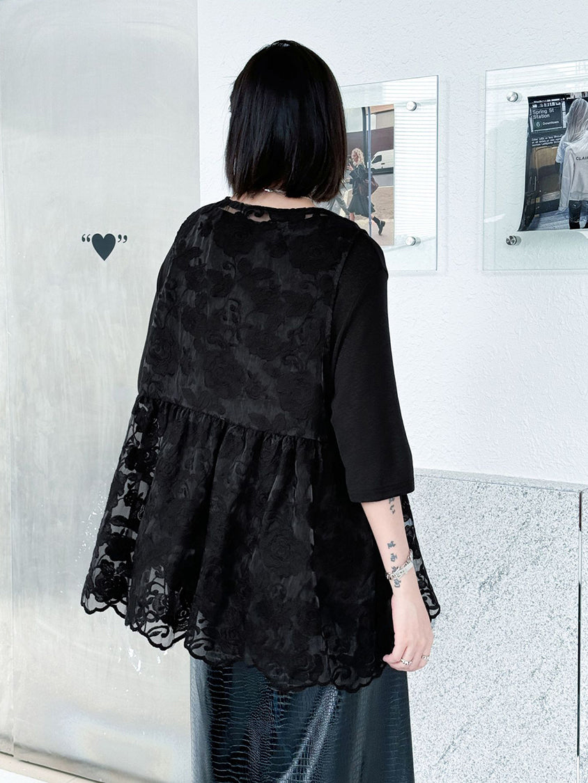 An all-lace vest with a delicate rose pattern.