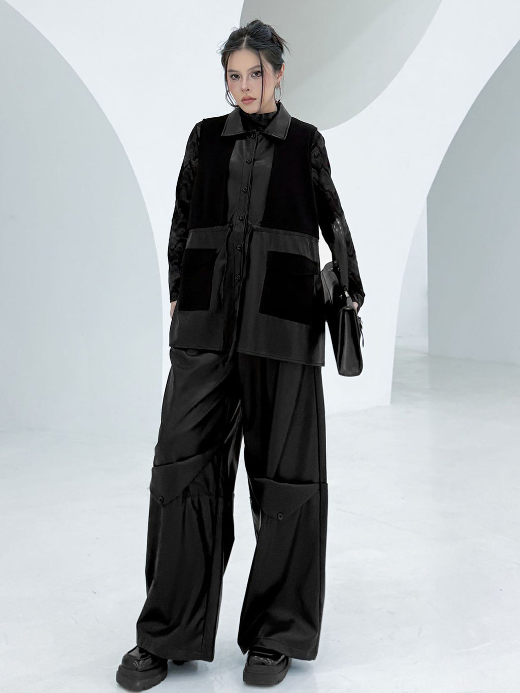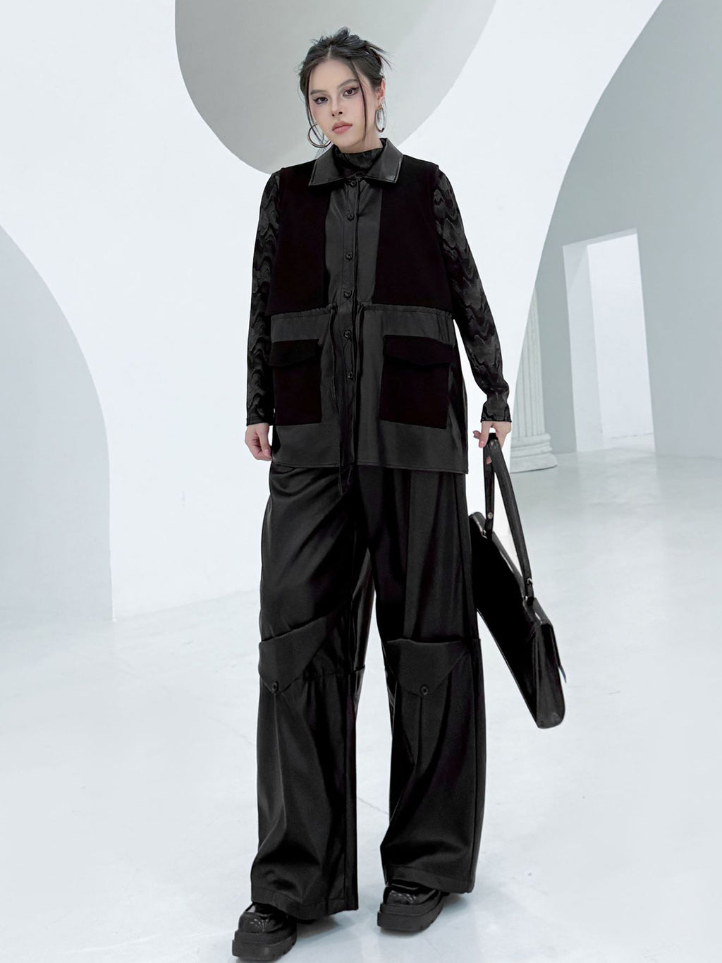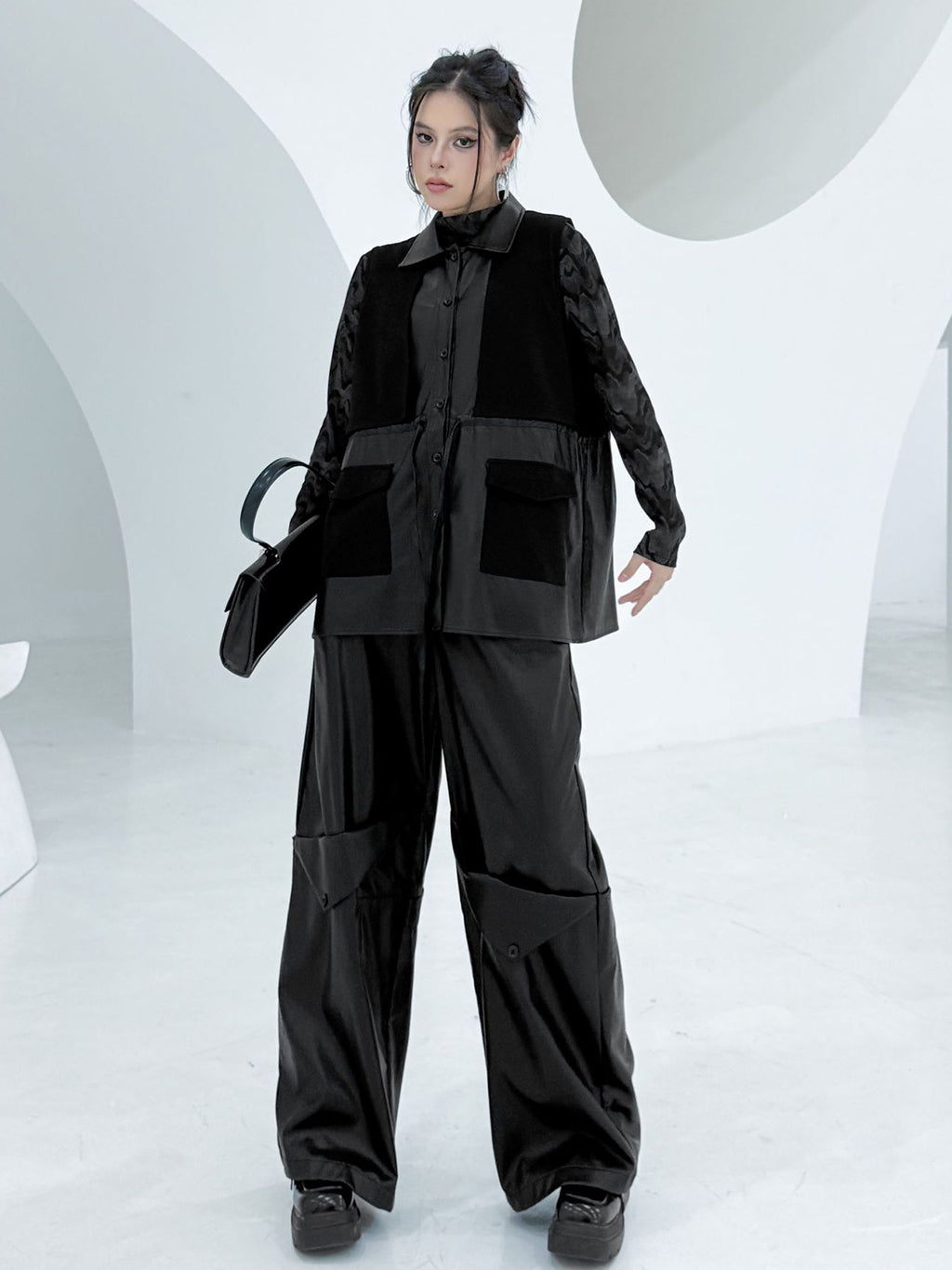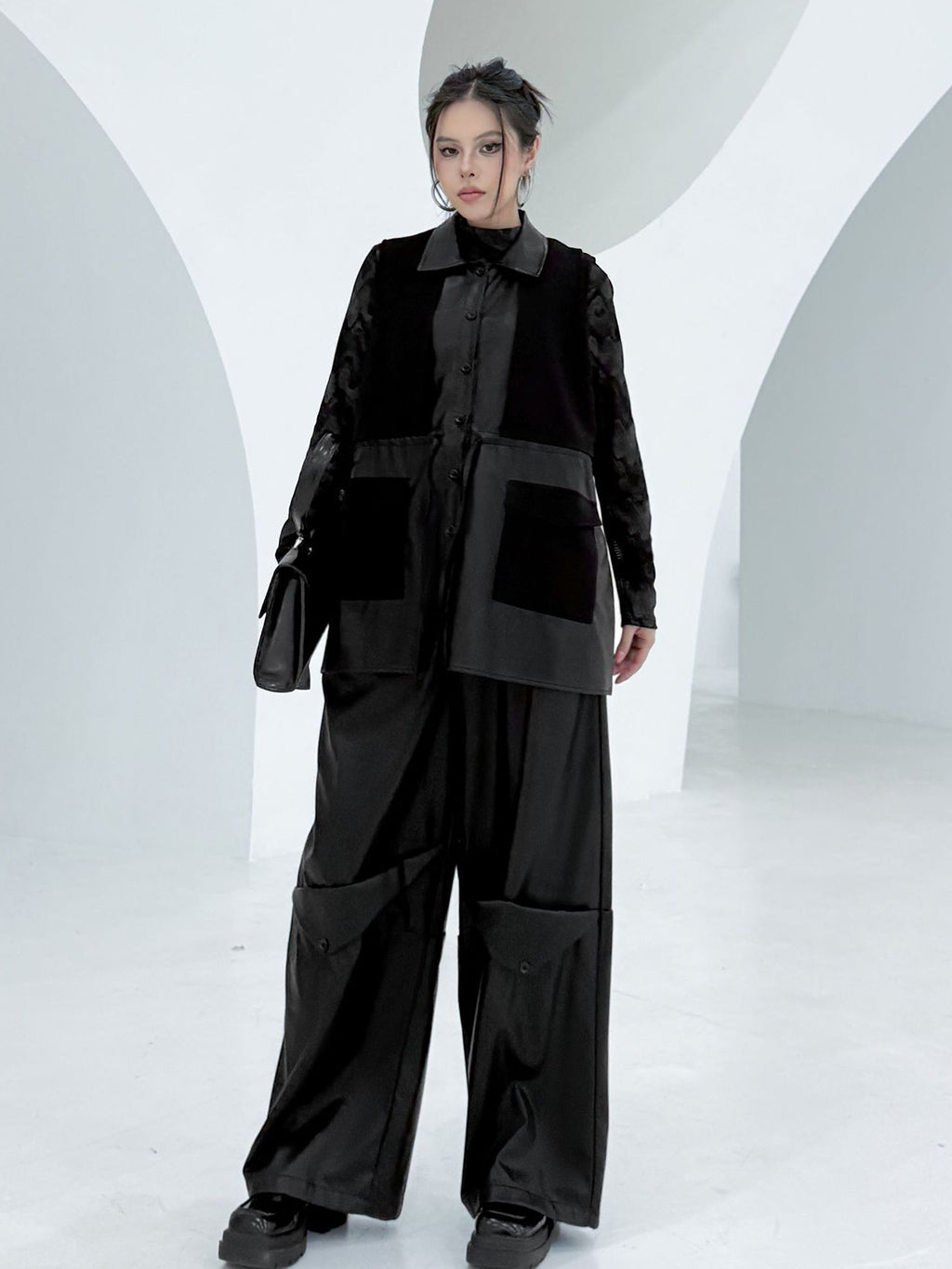 This set consists of a blouse with an impressive scarf tie and wide pants with a belt of the same pattern. The blouse has a relaxed silhouette with a draped feel, and the scarf flowing from the neck accentuates the vertical line. The cuffs are gathered for a soft finish, adding just the right amount of volume. The pants have an elastic waistband for a comfortable fit, and the loose material creates a leg-lengthening effect. The overall lightweight construction allows you to enjoy an elegant look as they sway gracefully with every movement.