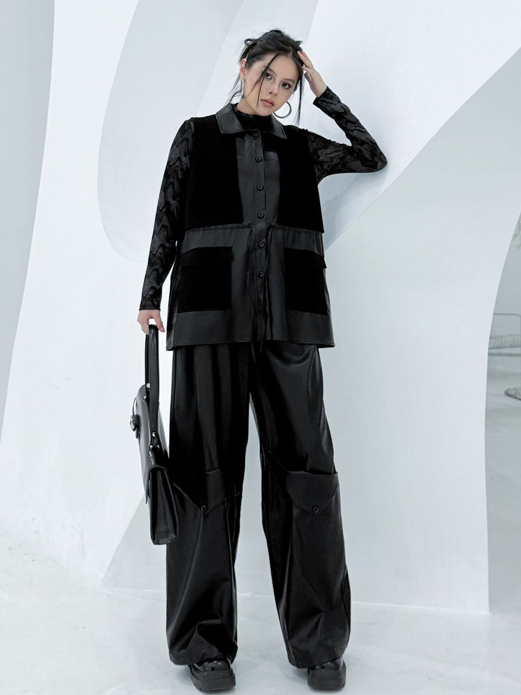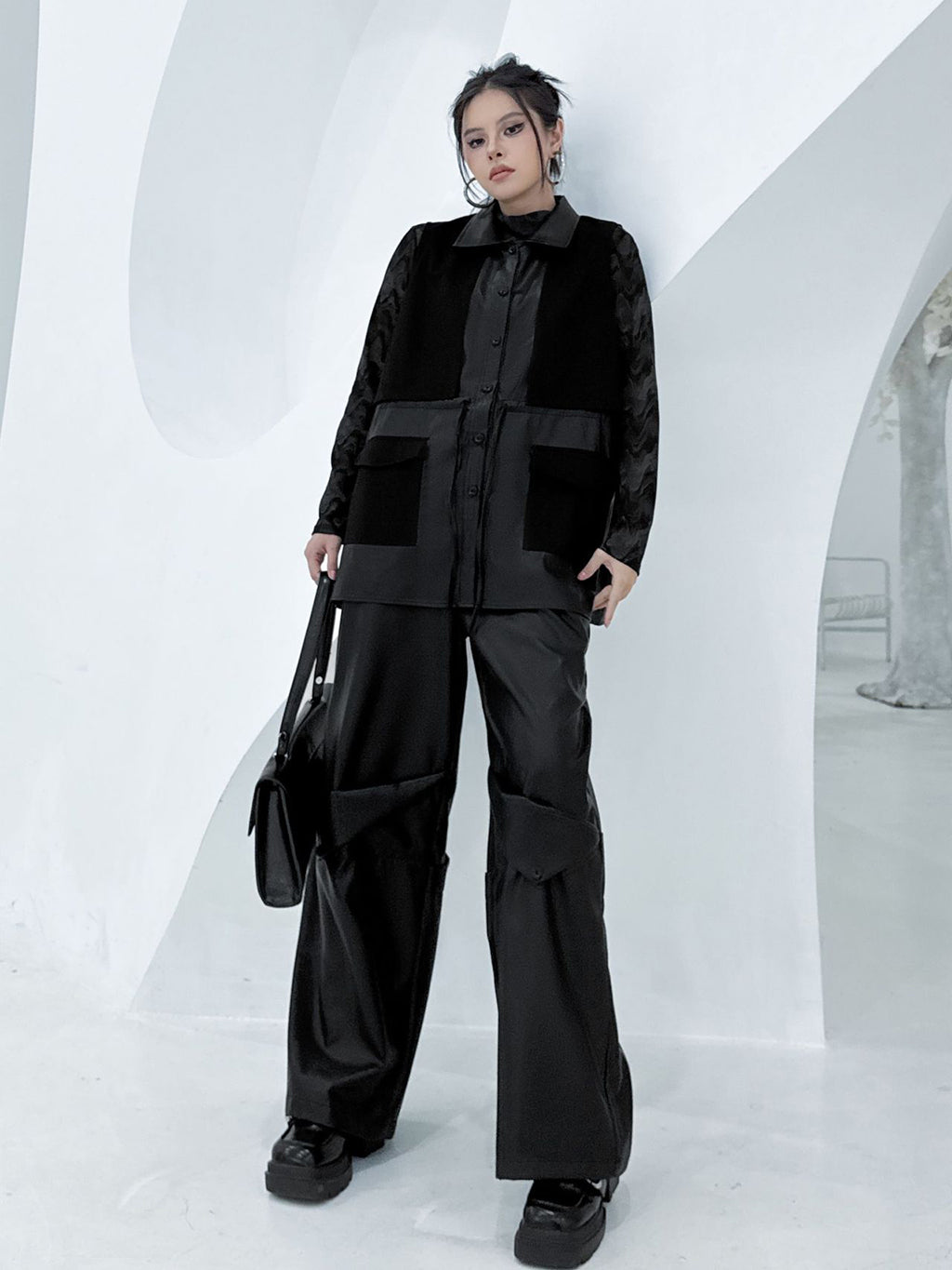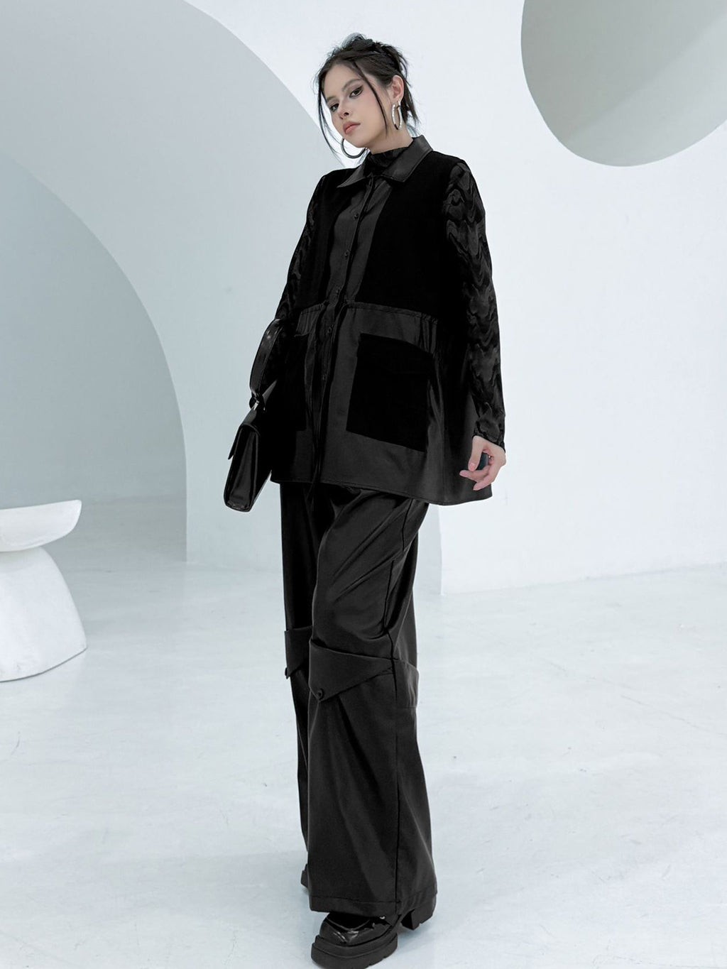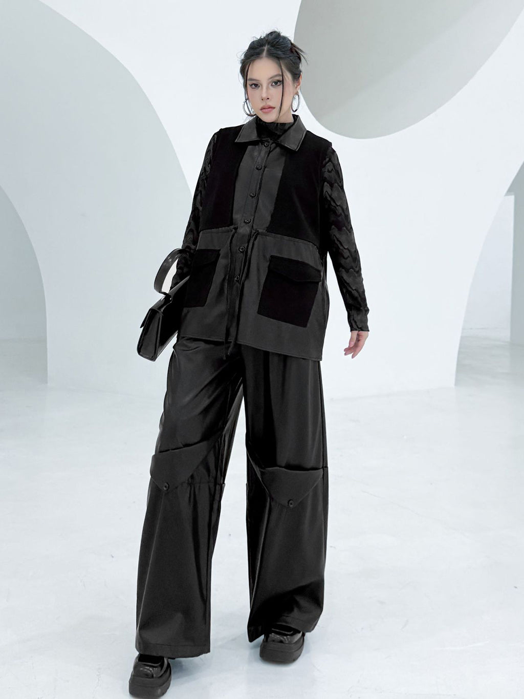 This set consists of a blouse with an impressive scarf tie and wide pants with a belt of the same pattern. The blouse has a relaxed silhouette with a draped feel, and the scarf flowing from the neck accentuates the vertical line. The cuffs are gathered for a soft finish, adding just the right amount of volume. The pants have an elastic waistband for a comfortable fit, and the loose material creates a leg-lengthening effect. The overall lightweight construction allows you to enjoy an elegant look as they sway gracefully with every movement.