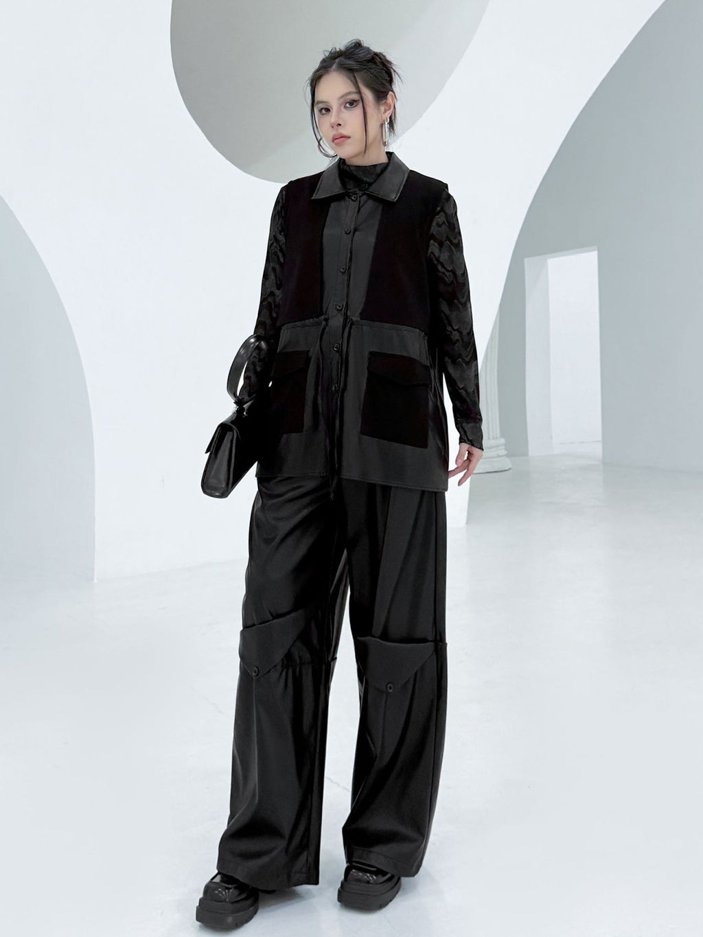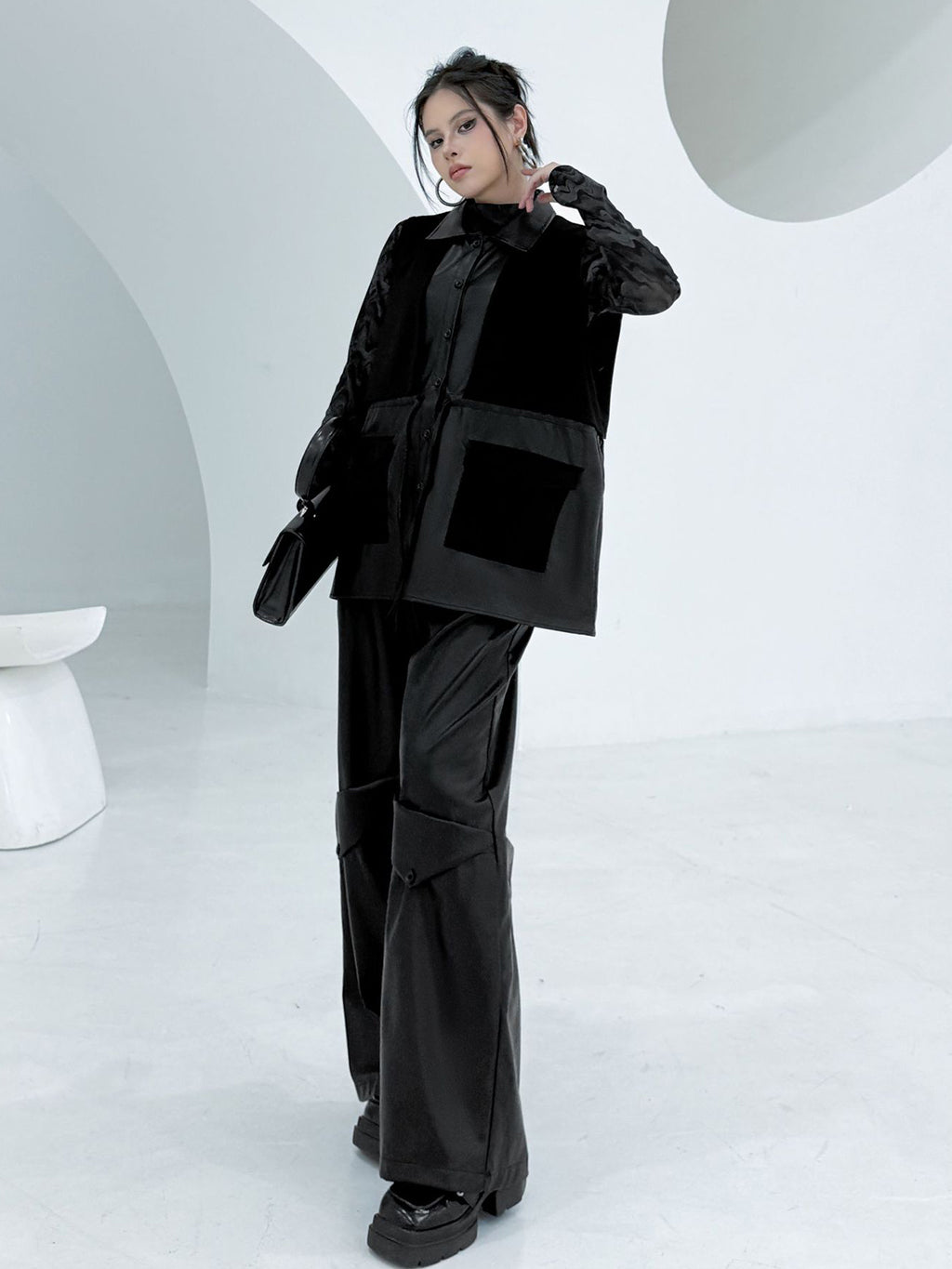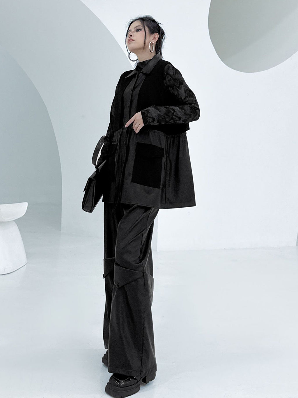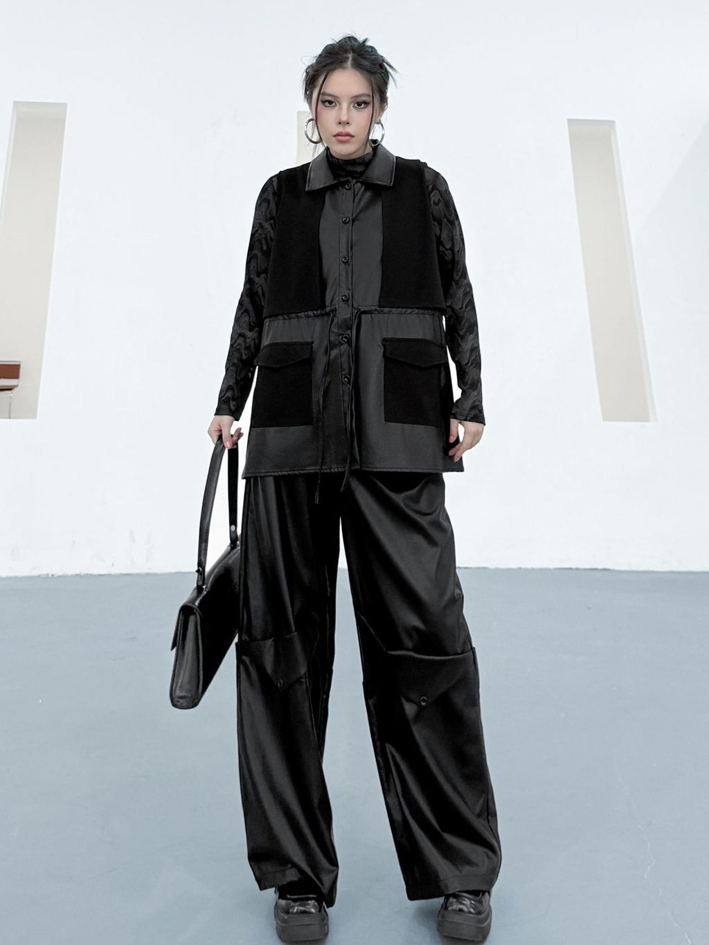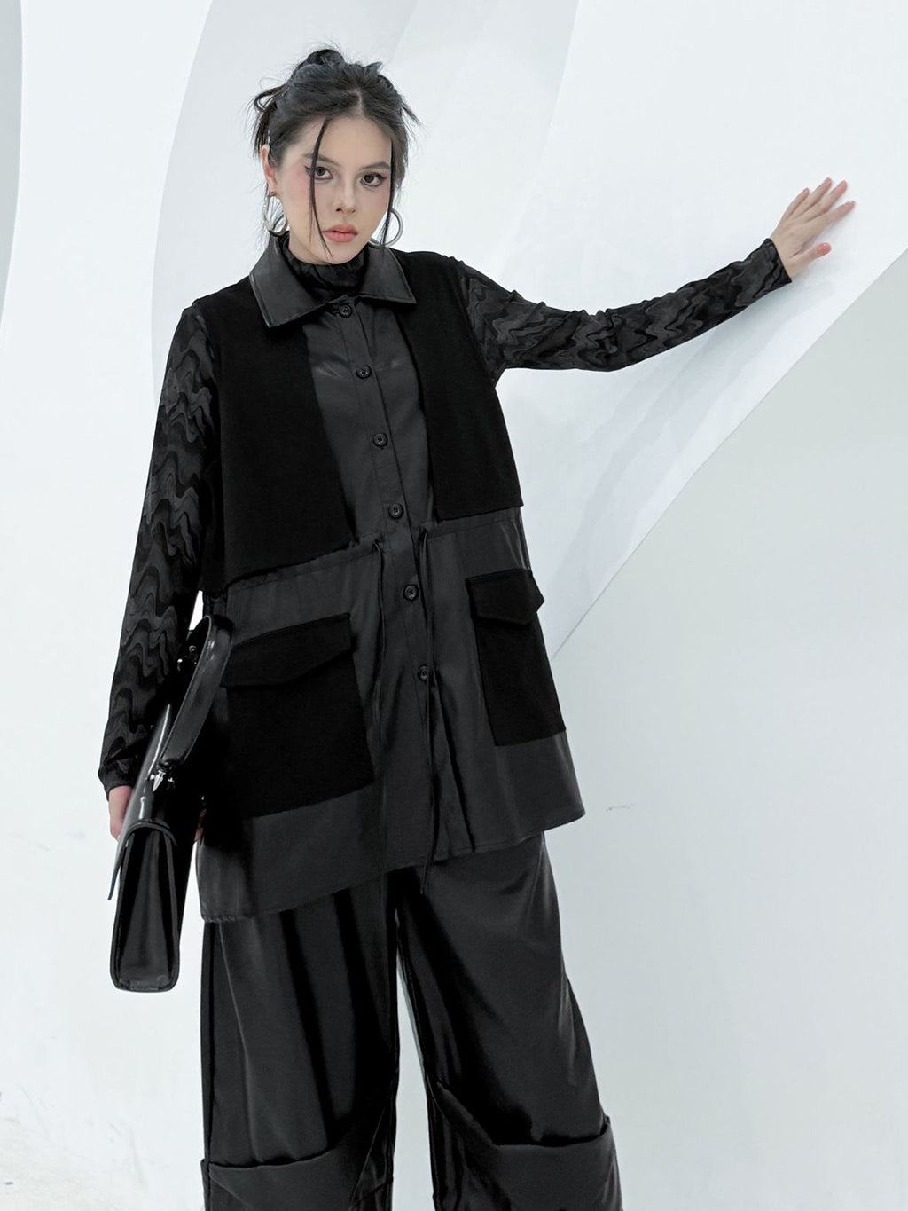 This set consists of a blouse with an impressive scarf tie and wide pants with a belt of the same pattern. The blouse has a relaxed silhouette with a draped feel, and the scarf flowing from the neck accentuates the vertical line. The cuffs are gathered for a soft finish, adding just the right amount of volume. The pants have an elastic waistband for a comfortable fit, and the loose material creates a leg-lengthening effect. The overall lightweight construction allows you to enjoy an elegant look as they sway gracefully with every movement.