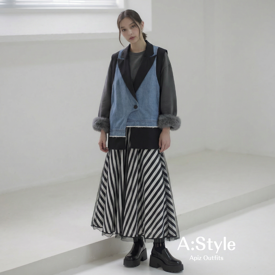 チャコールグレーのファーカフス付きスウェットに、ブラック×ホワイトのストライプチュールスカートをレイヤード。上からデニム切替のロングベストを重ねることで、素材のコントラストを際立たせたスタイリング。
