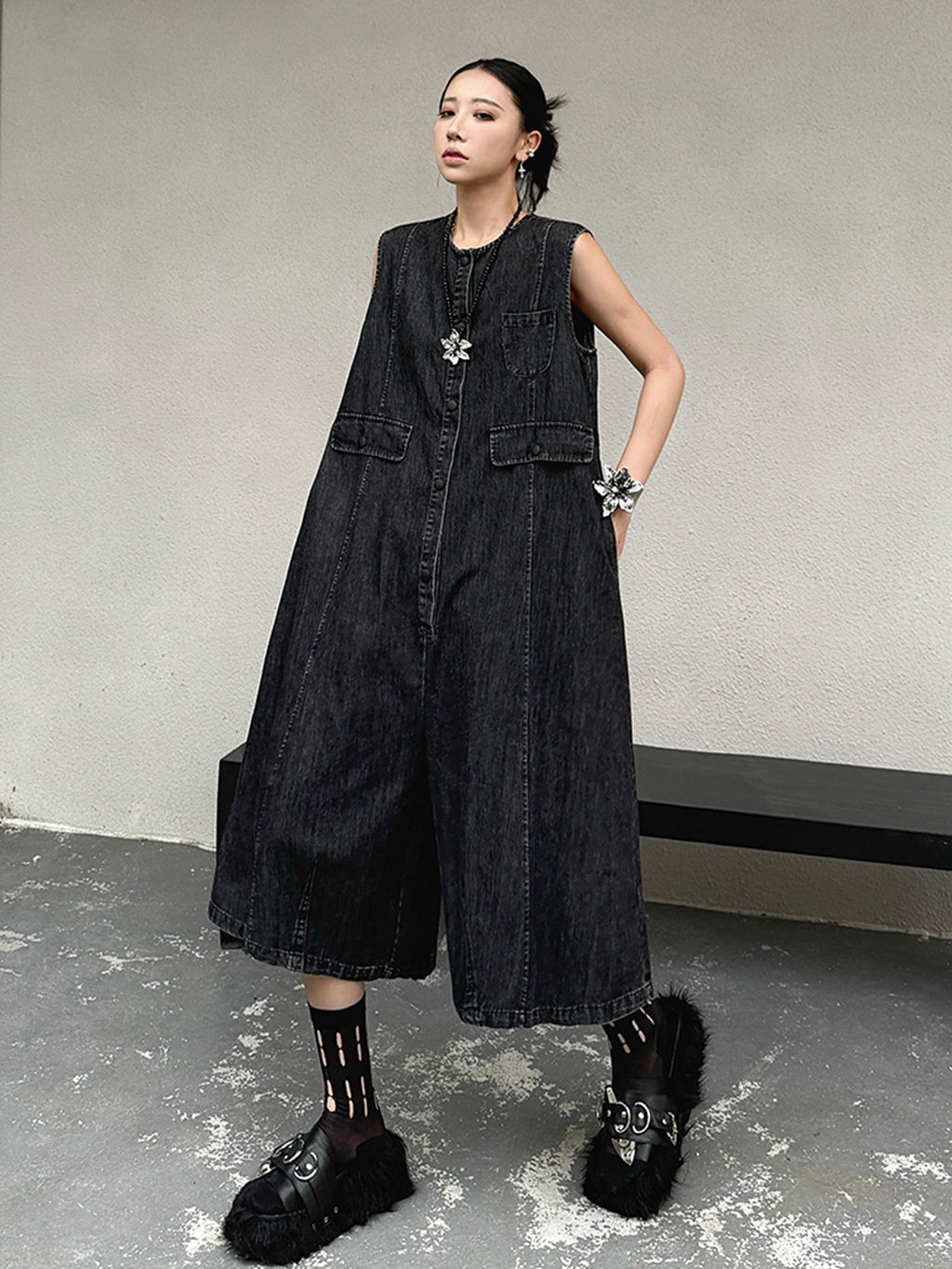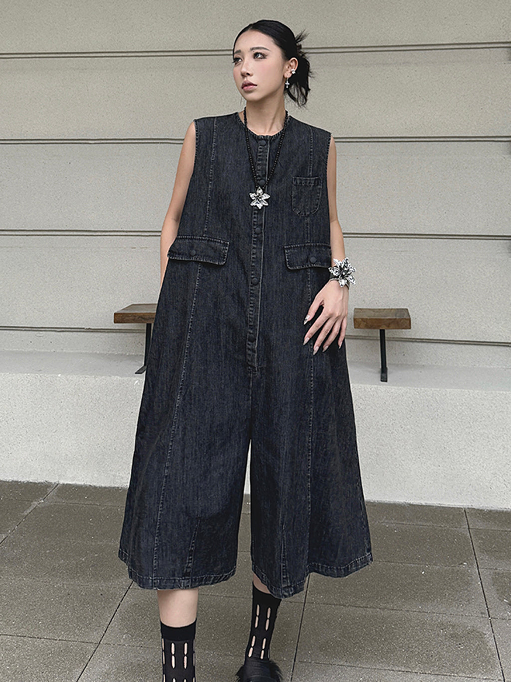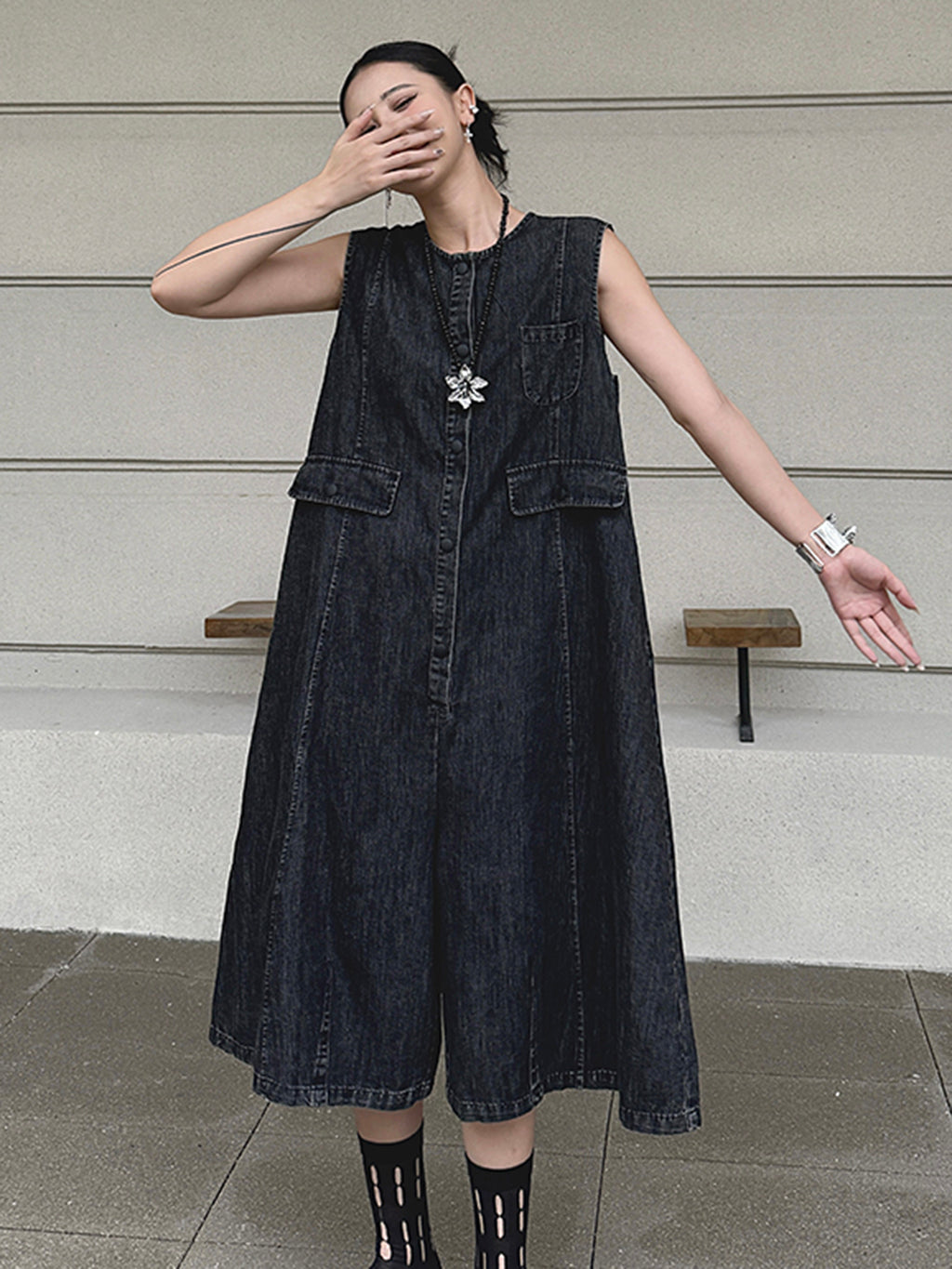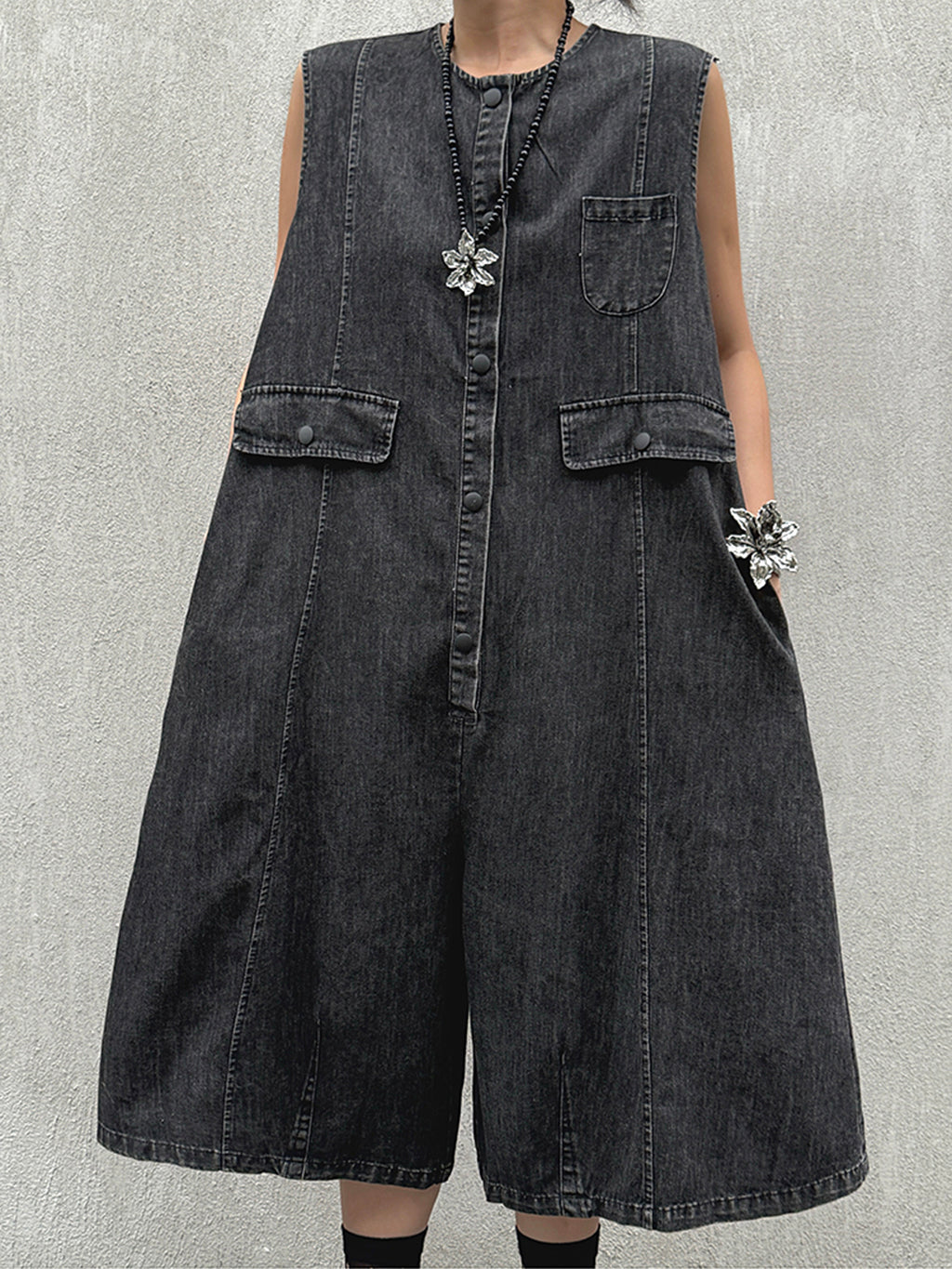 ヴィンテージ調のブラックデニムを使用したノースリーブジャンプスーツ。身頃はたっぷりと分量を取ったAラインシルエットで、動きに合わせて自然なドレープが生まれる。胸元のミニポケットやフラップポケットが程よいアクセントとなり、ウエストマークのない構造がこなれた抜け感を演出。前開きはスナップボタン仕様で着脱も簡単。パンツ部分は膝下丈で足元の抜けも良く、ソックスやシューズとの合わせで多彩な表情に変化する構成。