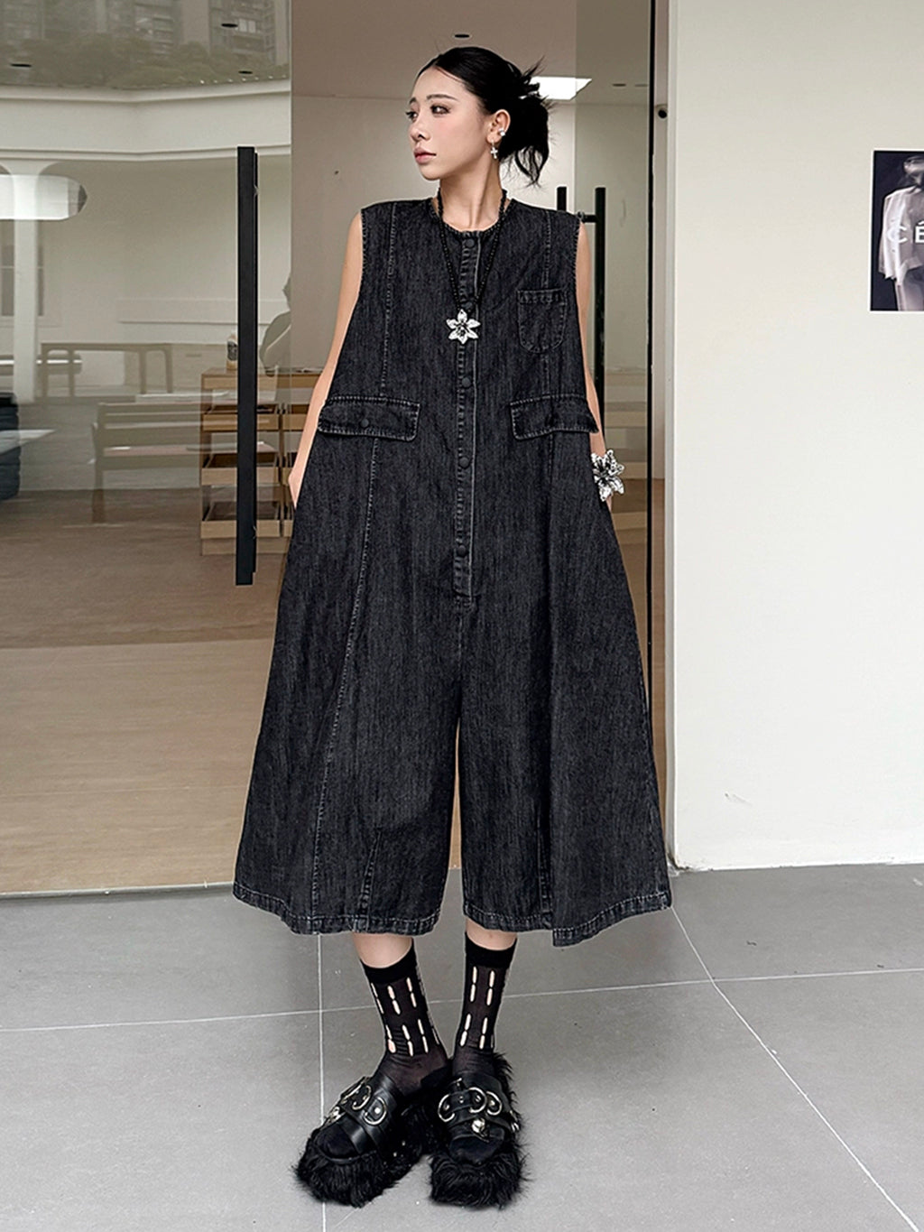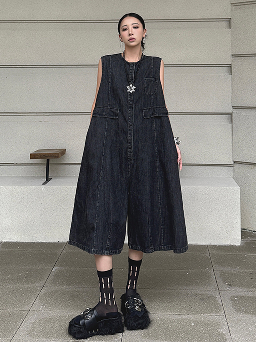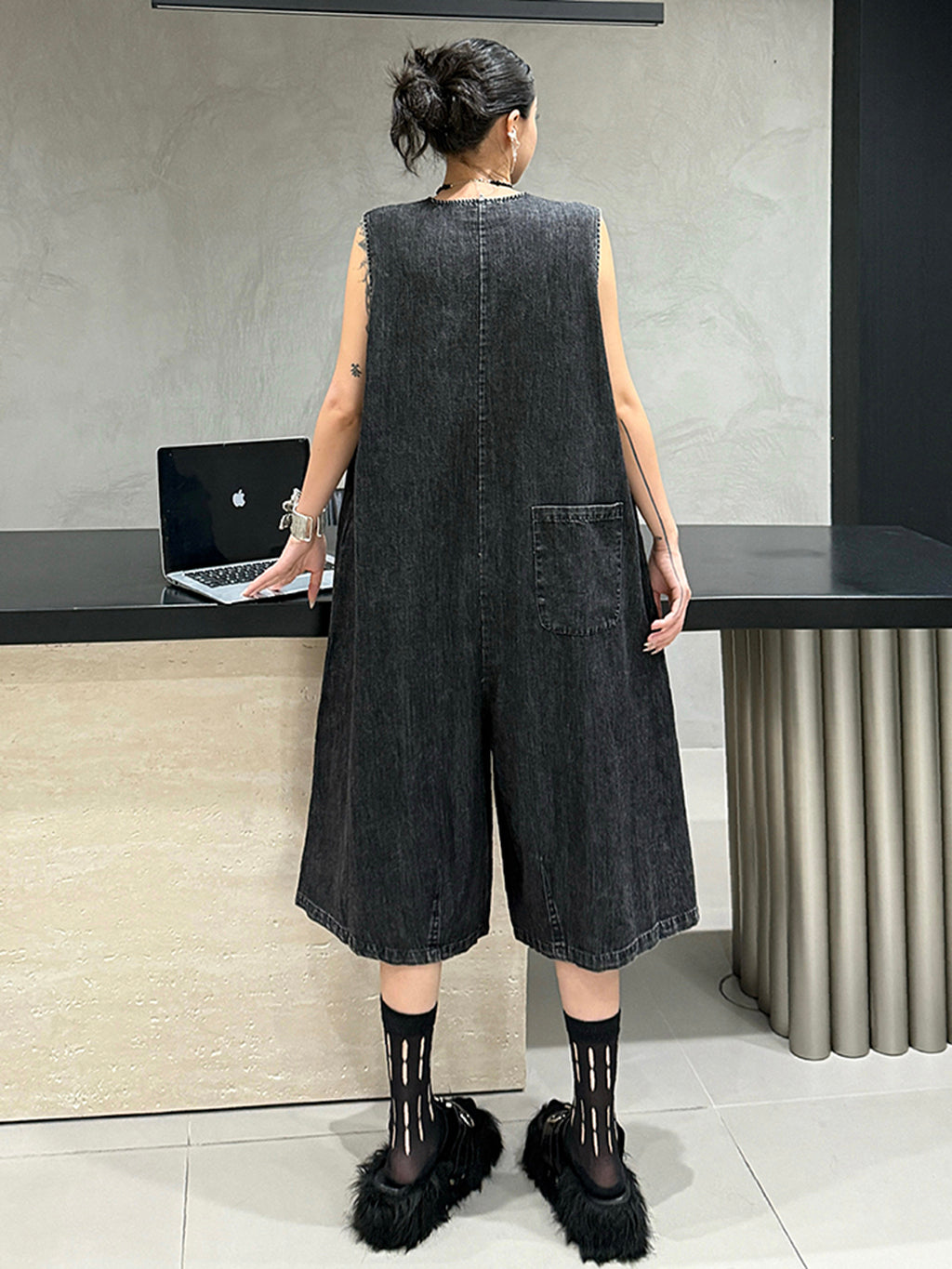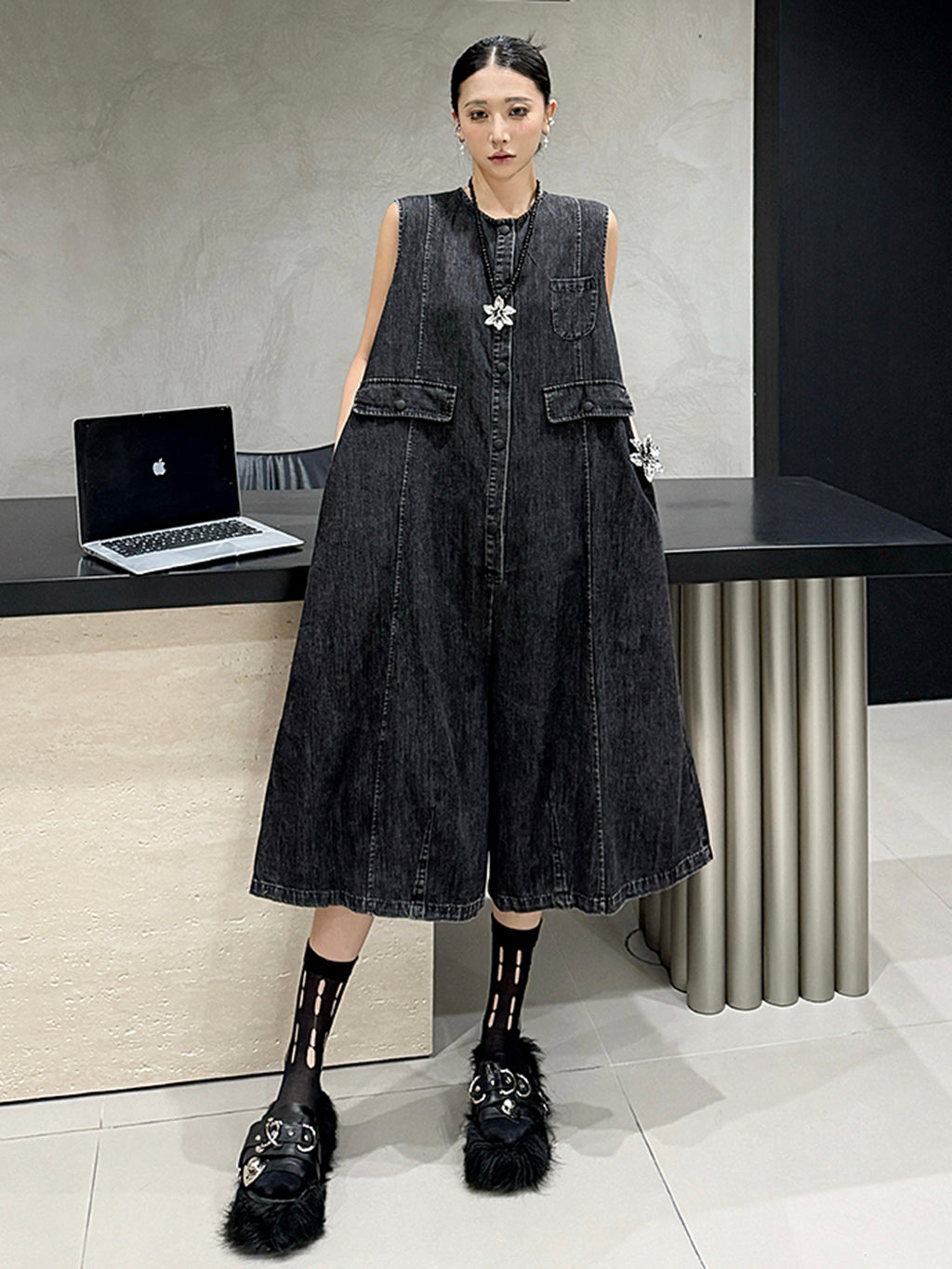 ヴィンテージ調のブラックデニムを使用したノースリーブジャンプスーツ。身頃はたっぷりと分量を取ったAラインシルエットで、動きに合わせて自然なドレープが生まれる。胸元のミニポケットやフラップポケットが程よいアクセントとなり、ウエストマークのない構造がこなれた抜け感を演出。前開きはスナップボタン仕様で着脱も簡単。パンツ部分は膝下丈で足元の抜けも良く、ソックスやシューズとの合わせで多彩な表情に変化する構成。
