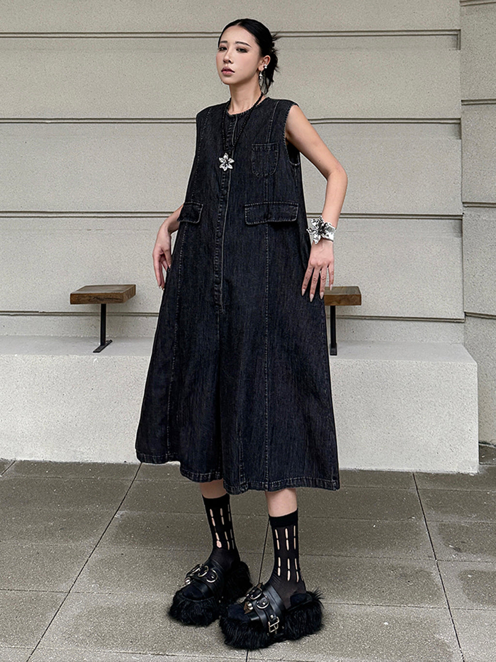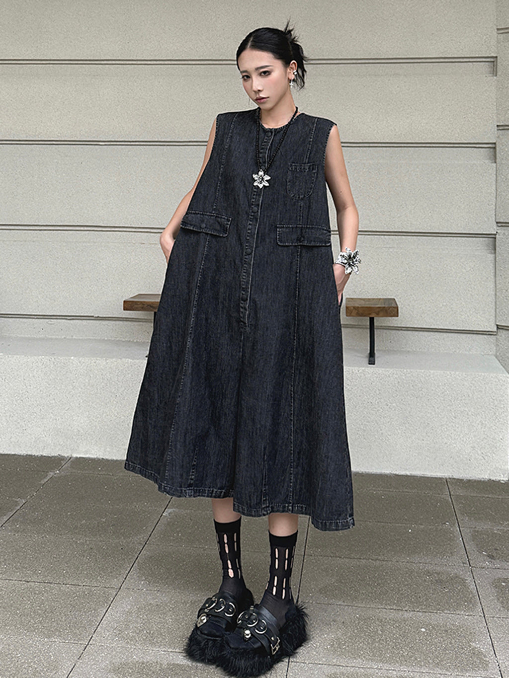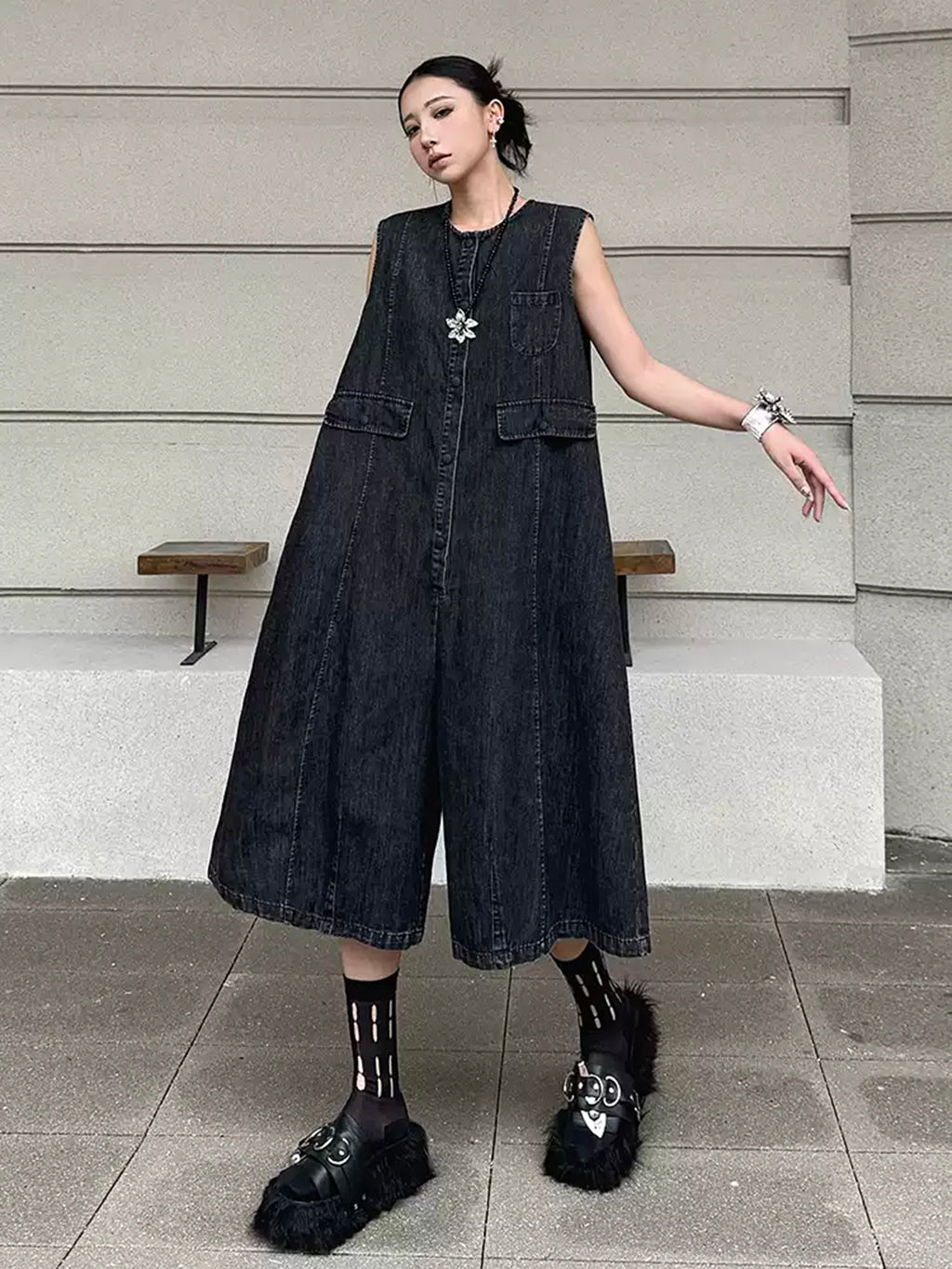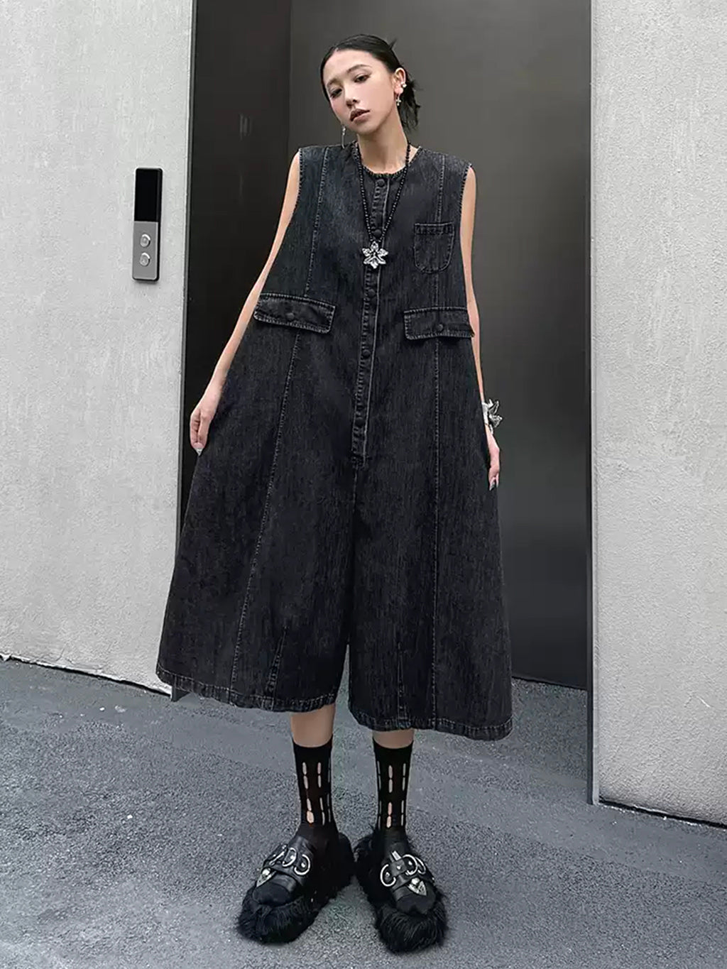 ヴィンテージ調のブラックデニムを使用したノースリーブジャンプスーツ。身頃はたっぷりと分量を取ったAラインシルエットで、動きに合わせて自然なドレープが生まれる。胸元のミニポケットやフラップポケットが程よいアクセントとなり、ウエストマークのない構造がこなれた抜け感を演出。前開きはスナップボタン仕様で着脱も簡単。パンツ部分は膝下丈で足元の抜けも良く、ソックスやシューズとの合わせで多彩な表情に変化する構成。