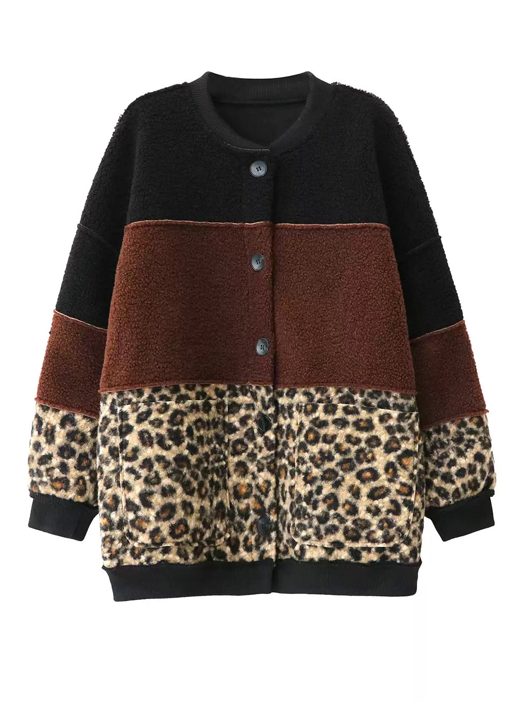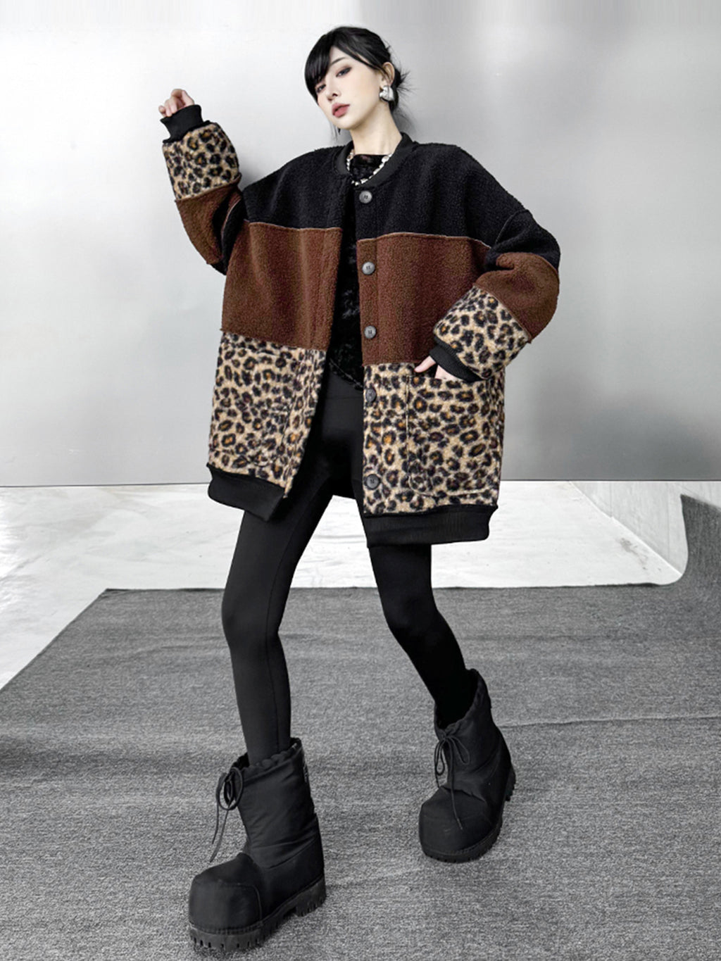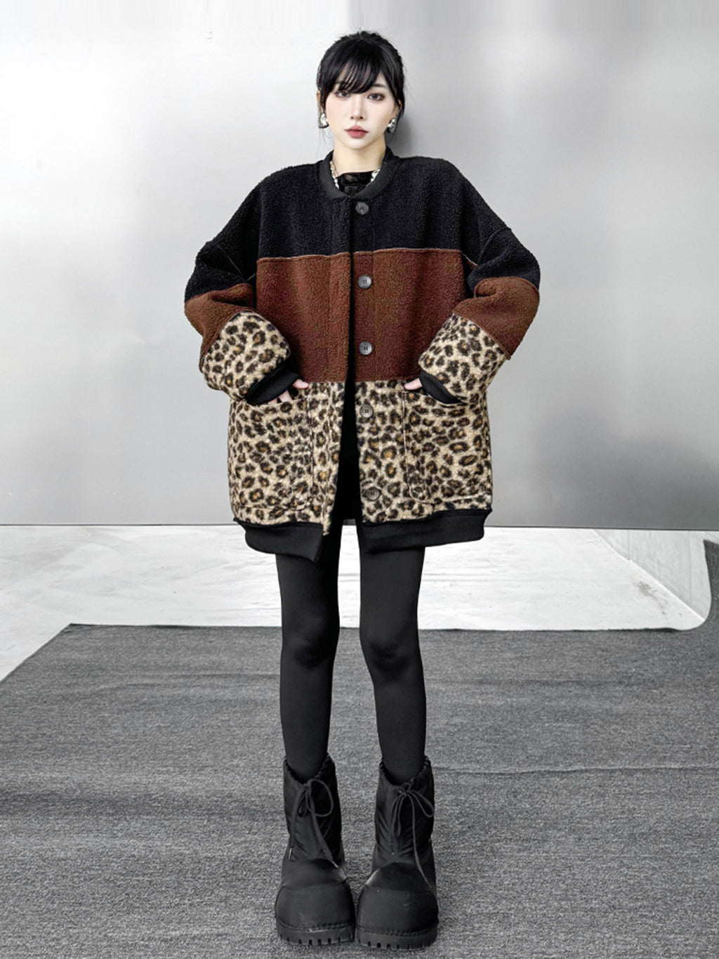 異素材を組み合わせたブロック構成のボアジャケット。上部にブラックとブラウン、下部にレオパード柄を配置し、コントラストのある配色がシルエットを引き締める。柔らかく起毛したボア生地が全体を包み込み、保温性と軽快な着心地を両立。オーバーサイズの設計とドロップショルダーが自然な抜け感を演出し、ボタンフロント仕様でラフにも着こなせるデザイン。カジュアルからモードまで幅広く対応できるスタイル。