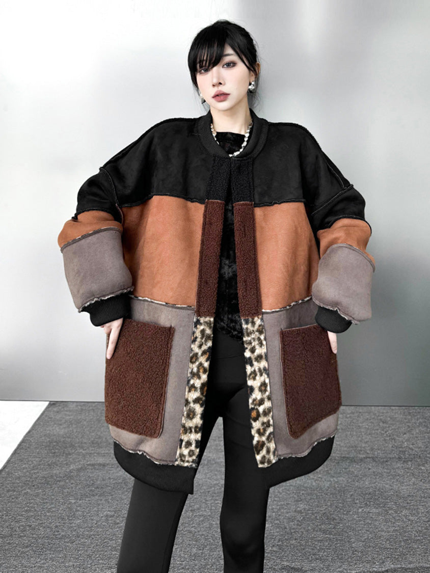 異なる素材感を組み合わせたブロックデザインに、レオパード柄を組み合わせたリバーシブルボアコート。