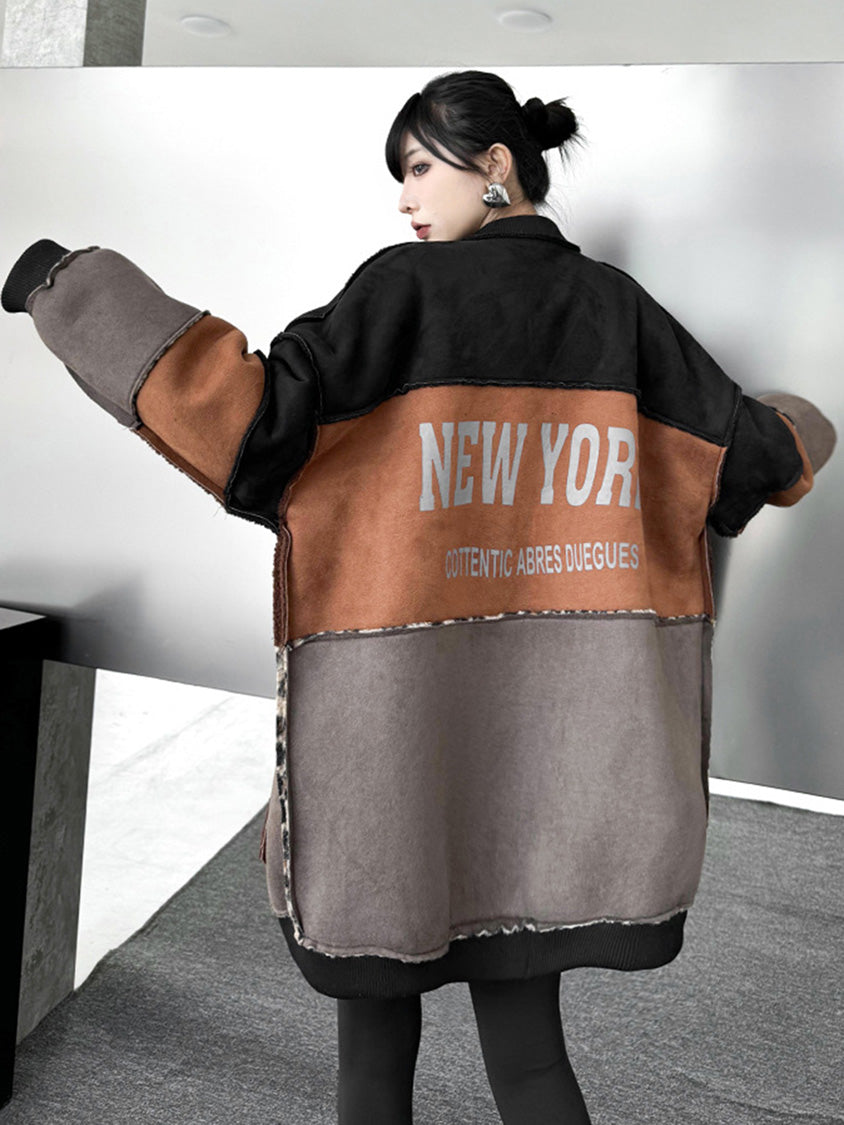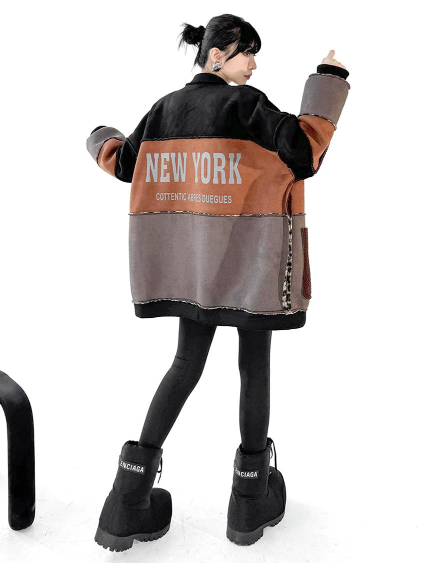表面はカラー切り替えのバランスが際立つモードな構成、裏面はレオパードボアが存在感を放つ。