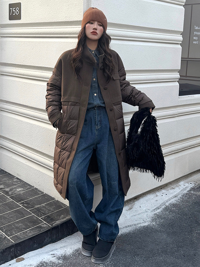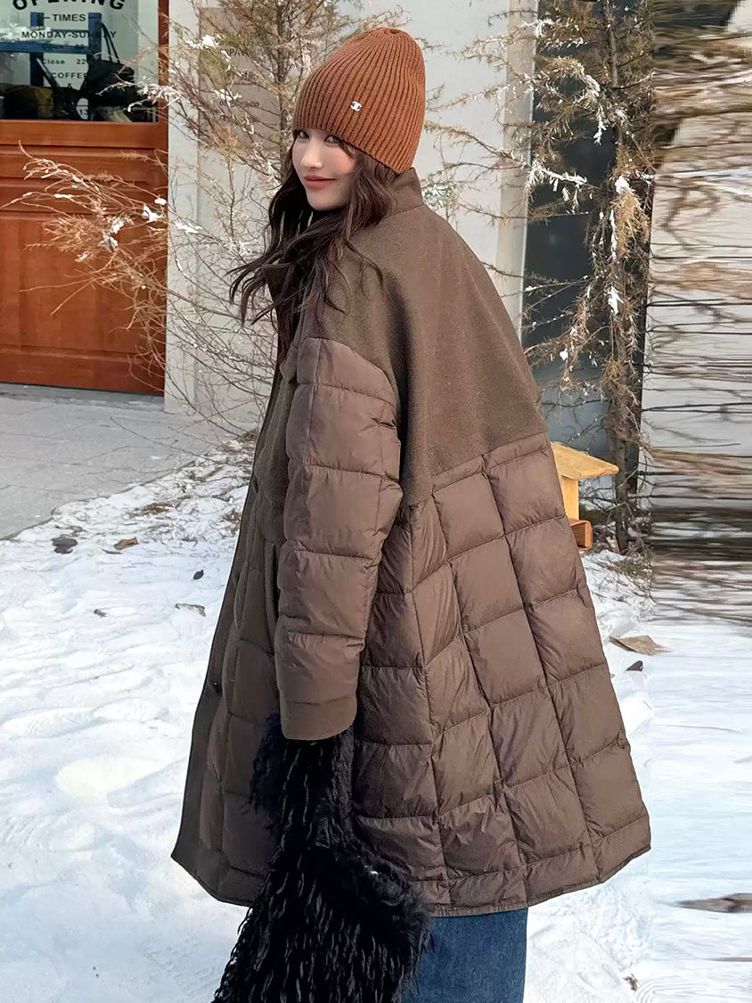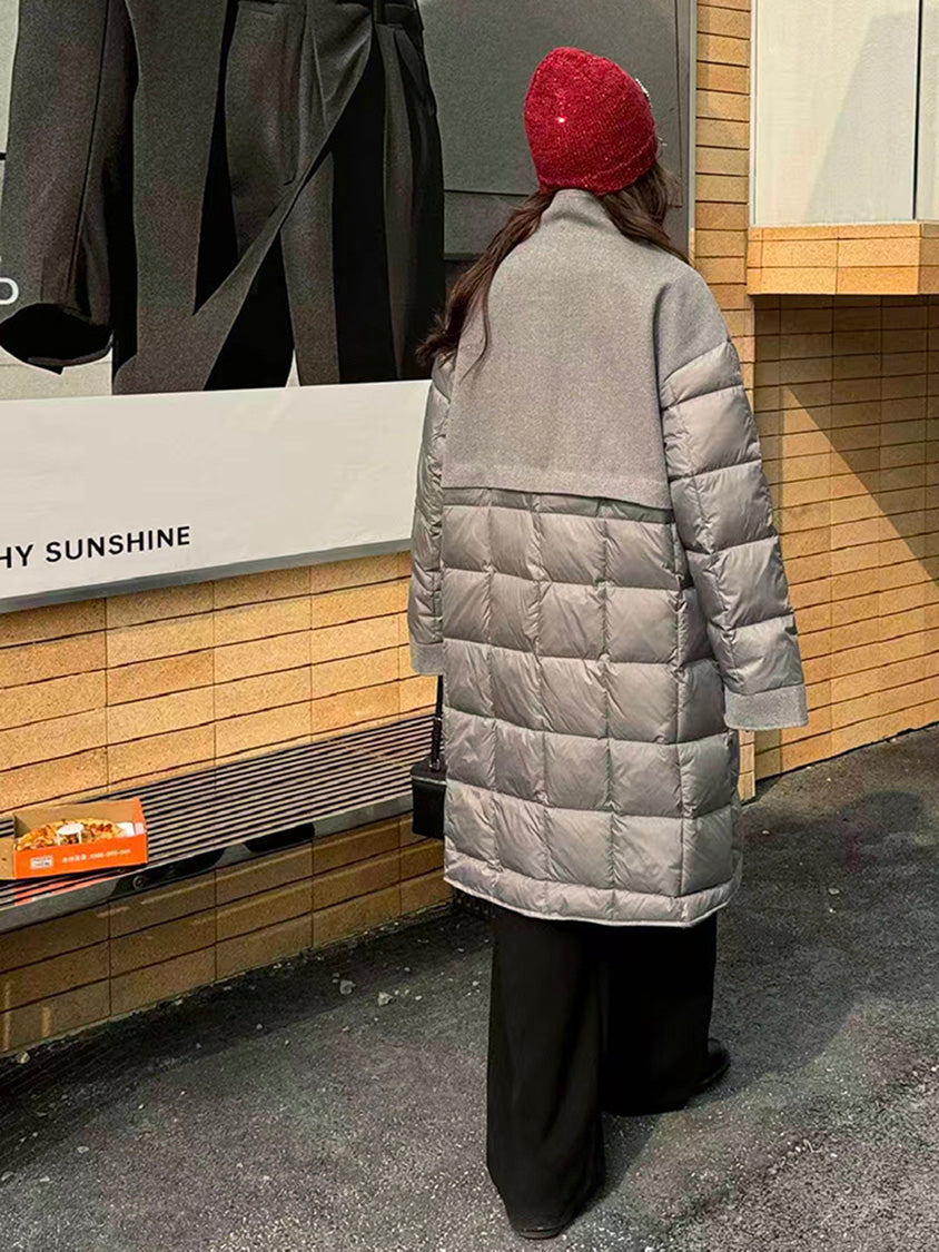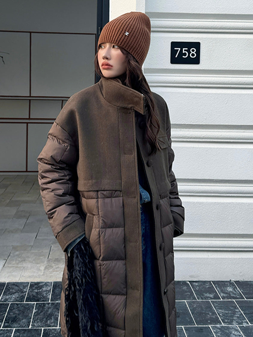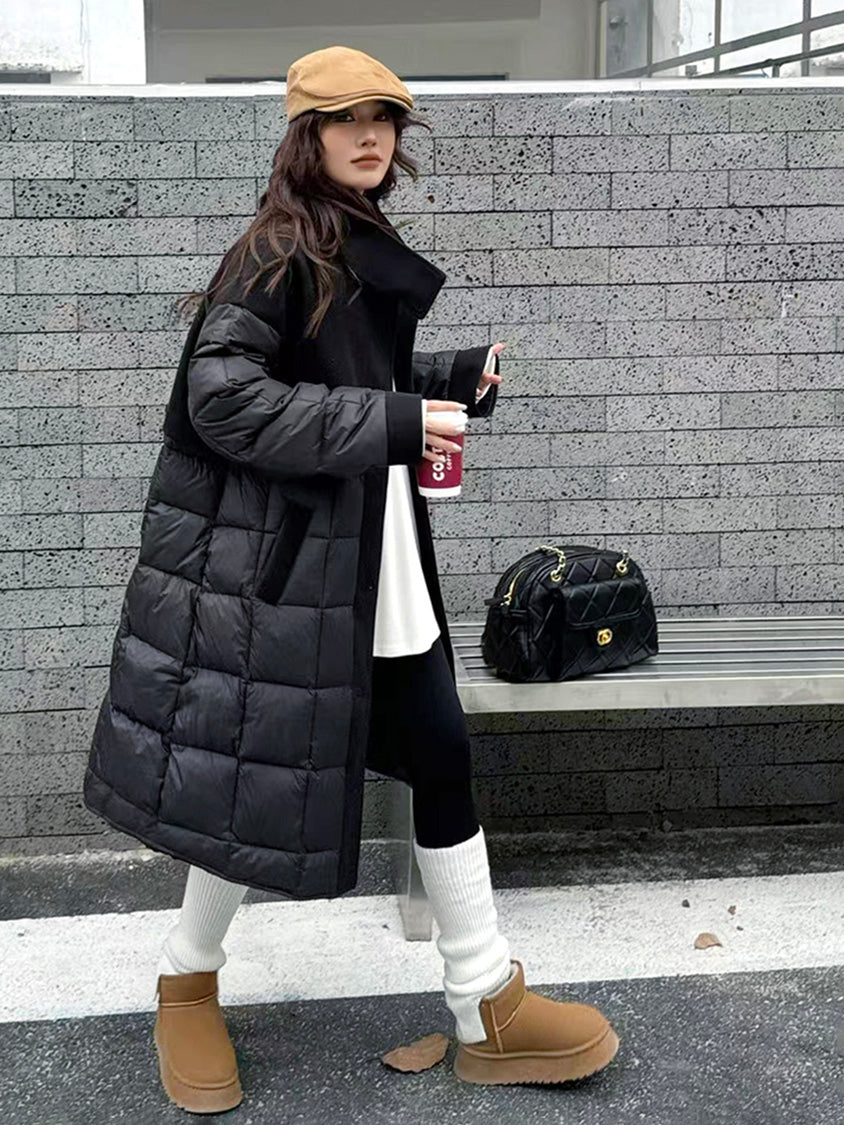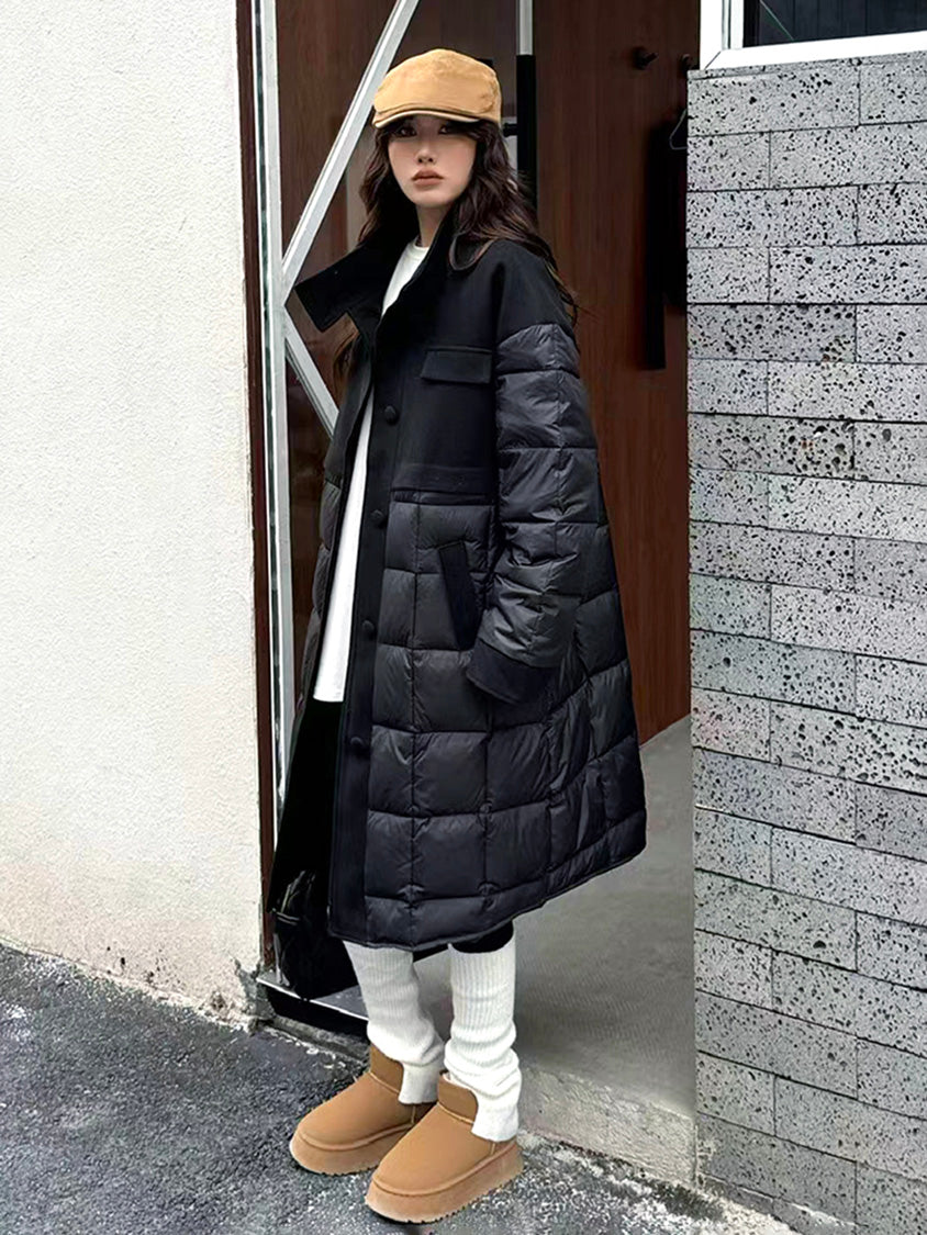 上部は滑らかな表面感の生地を用い、下部と袖には均等に配したブロックキルティングを組み合わせた構成のロングダウンコート。肩まわりに余白を持たせたシルエットが、厚手のインナーの上にも自然に馴染む。フロントは比翼風のボタンとすっきりとしたラインでまとめ、シンプルながら奥行きのある表情に仕上がる。両サイドのポケットは大きめに設定され、冷たい空気を遮る防寒性と実用性を兼ね備える。全体に落ち着いた雰囲気を纏いながら、都会的なムードの中に温かみを感じさせるアウター。