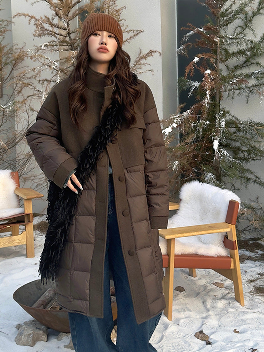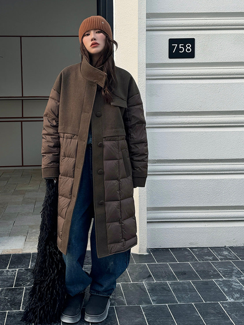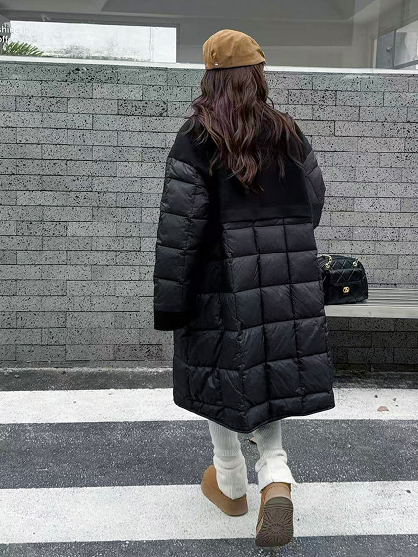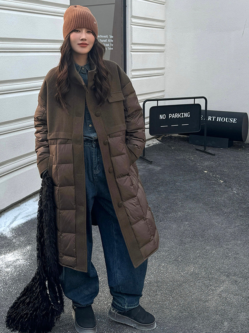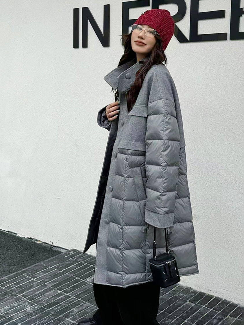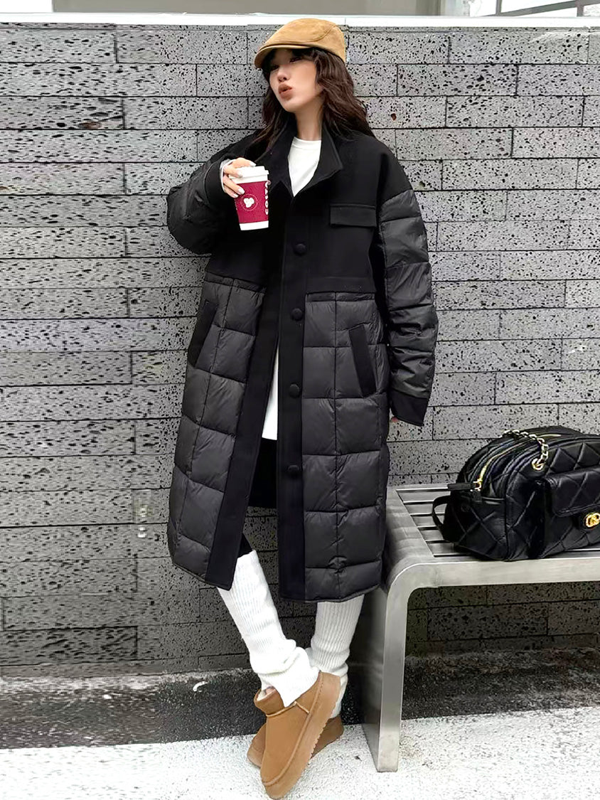 上部は滑らかな表面感の生地を用い、下部と袖には均等に配したブロックキルティングを組み合わせた構成のロングダウンコート。肩まわりに余白を持たせたシルエットが、厚手のインナーの上にも自然に馴染む。フロントは比翼風のボタンとすっきりとしたラインでまとめ、シンプルながら奥行きのある表情に仕上がる。両サイドのポケットは大きめに設定され、冷たい空気を遮る防寒性と実用性を兼ね備える。全体に落ち着いた雰囲気を纏いながら、都会的なムードの中に温かみを感じさせるアウター。