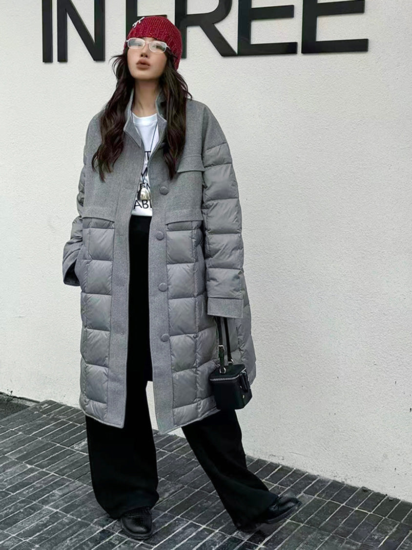 上部は滑らかな表面感の生地を用い、下部と袖には均等に配したブロックキルティングを組み合わせた構成のロングダウンコート。肩まわりに余白を持たせたシルエットが、厚手のインナーの上にも自然に馴染む。フロントは比翼風のボタンとすっきりとしたラインでまとめ、シンプルながら奥行きのある表情に仕上がる。両サイドのポケットは大きめに設定され、冷たい空気を遮る防寒性と実用性を兼ね備える。全体に落ち着いた雰囲気を纏いながら、都会的なムードの中に温かみを感じさせるアウター。