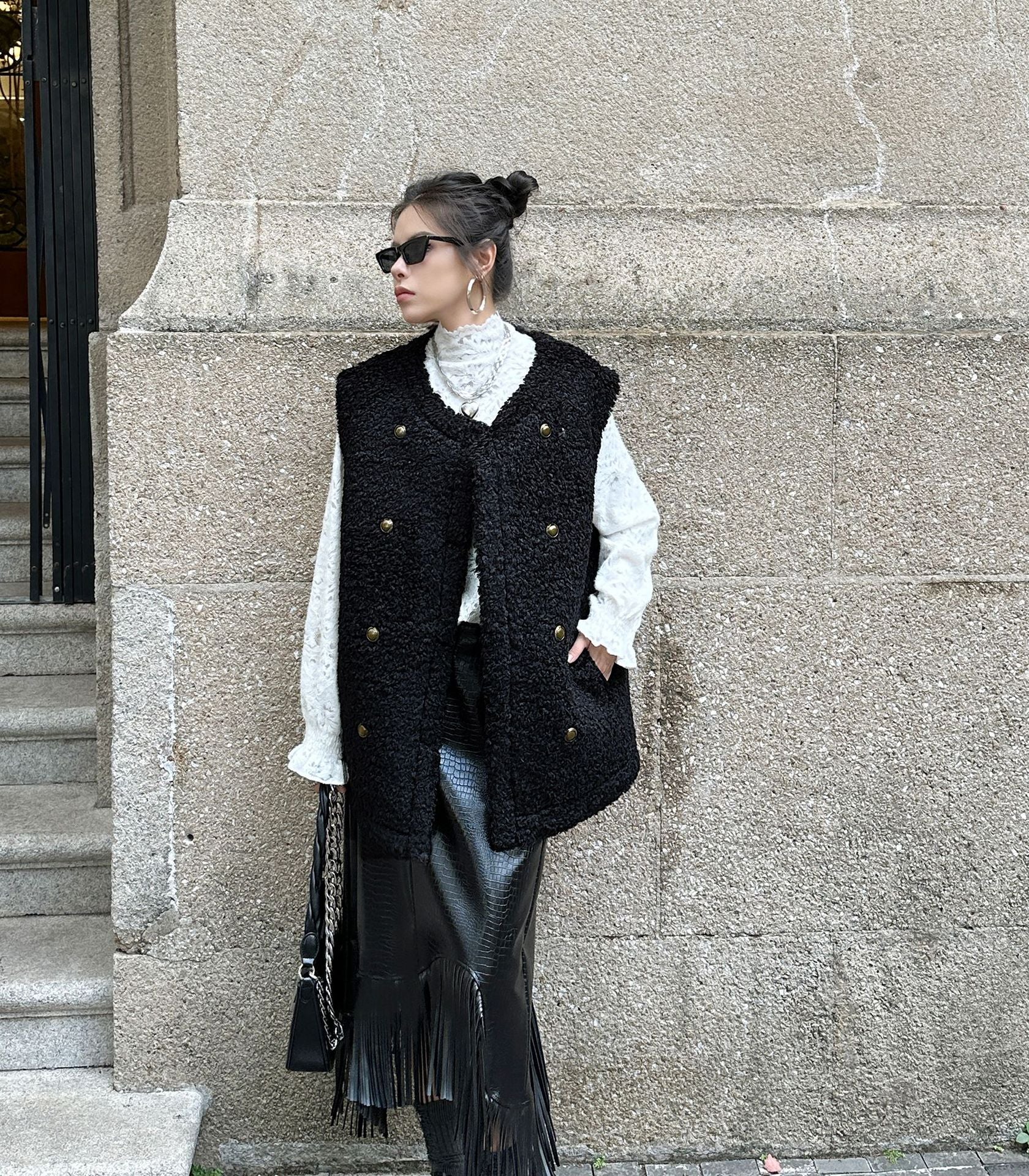もこもことしたボア素材を贅沢に使用したロングベスト。フロントに配されたゴールドのダブルボタンが重厚感を添え、ノーカラーデザインがすっきりとした首元を演出する。丸みのあるショルダーラインとストレートな身頃は、オーバーサイズのニットやレースブラウスとも好相性。両サイドには実用的なスリットポケットを配置し、ヒップを包み込むロング丈が旬なバランスを叶える。