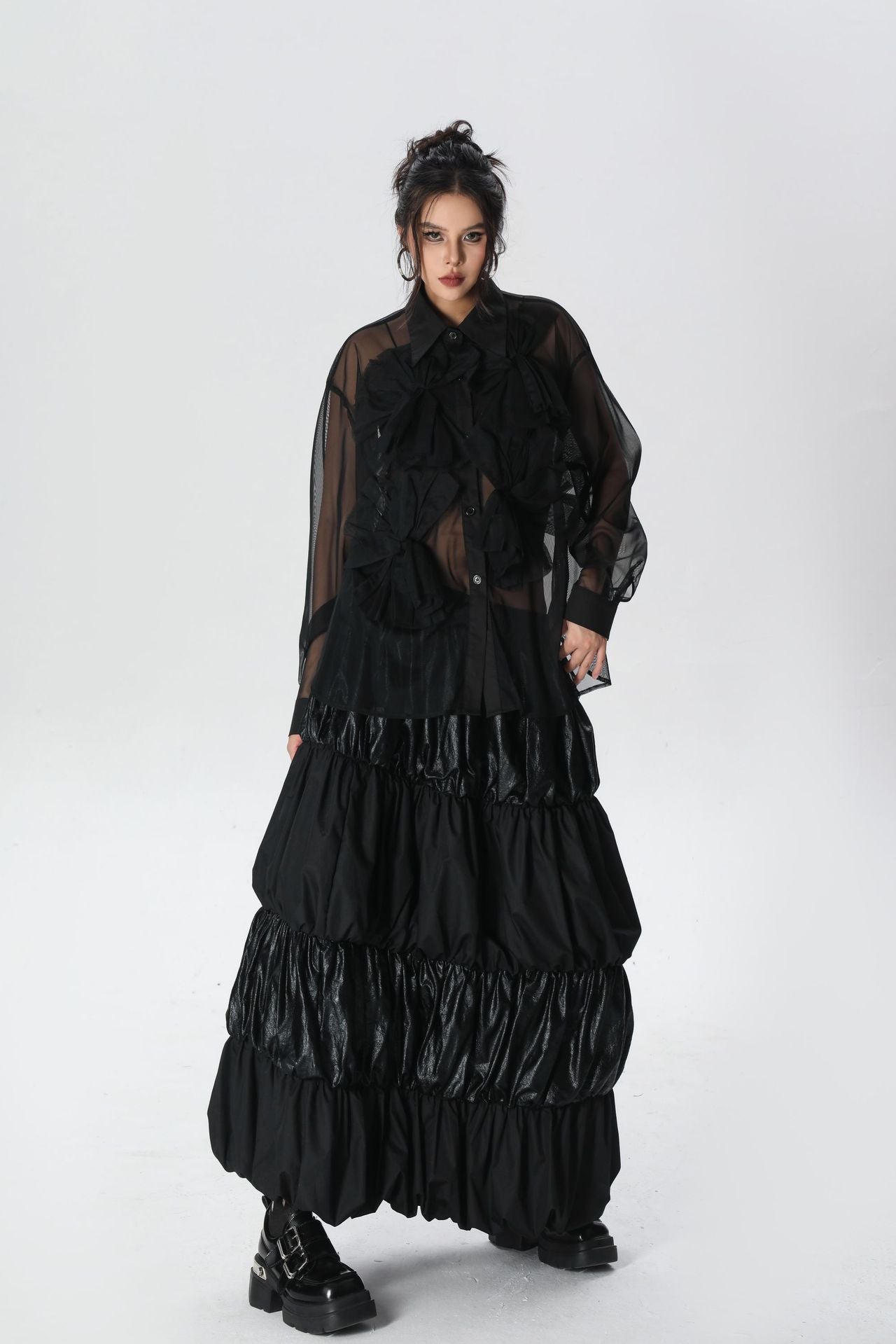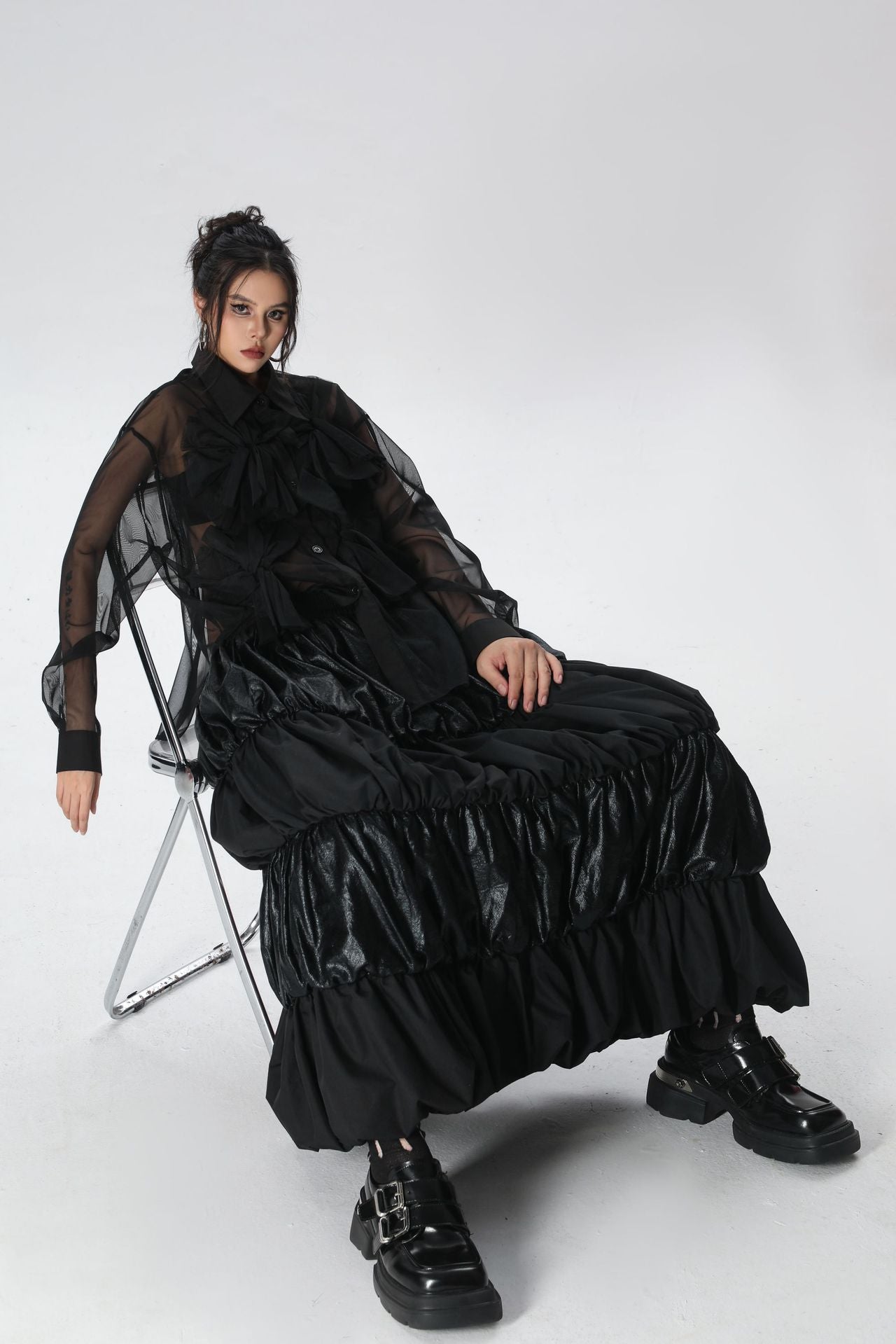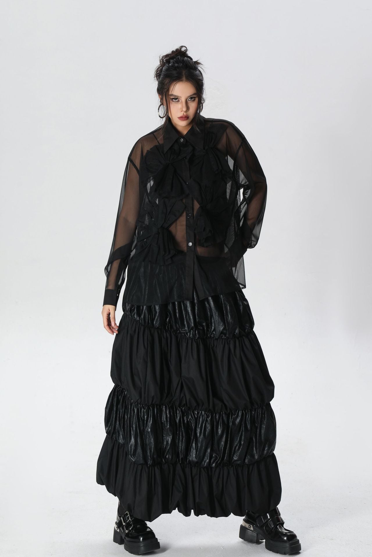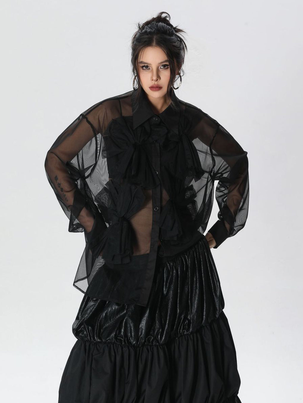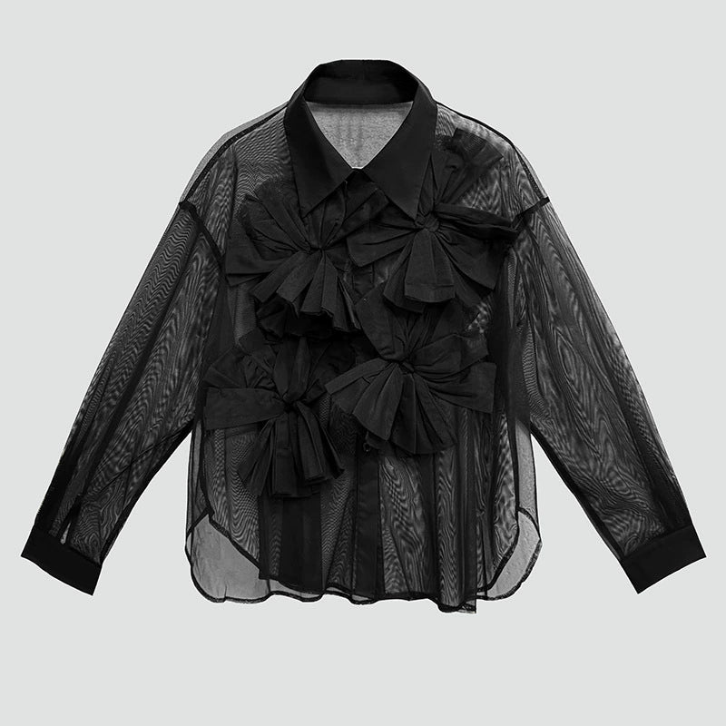 透け感のあるブラックのシアー素材に、複数のボウリボンモチーフを大胆にあしらったデザインシャツ。ボリューム感と立体感を強調するフロントのディテールが印象的で、光を透かす繊細な質感がエッジの効いたモード感を引き立てる。クラシカルな襟とカフスが全体を引き締め、シルエットにコントラストを与える一着。単体でも存在感があり、レイヤードやコーディネートの主軸としても映える一枚。