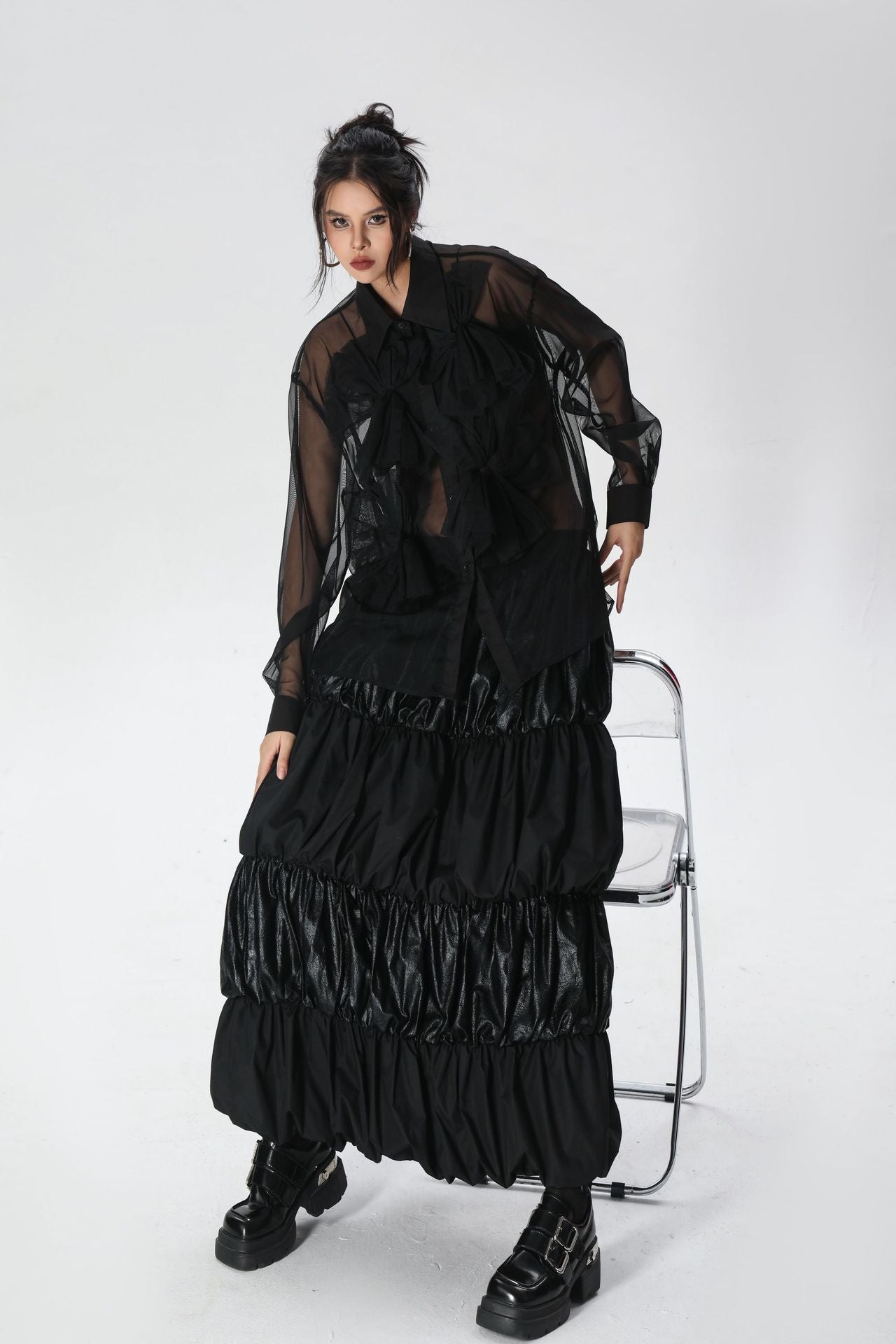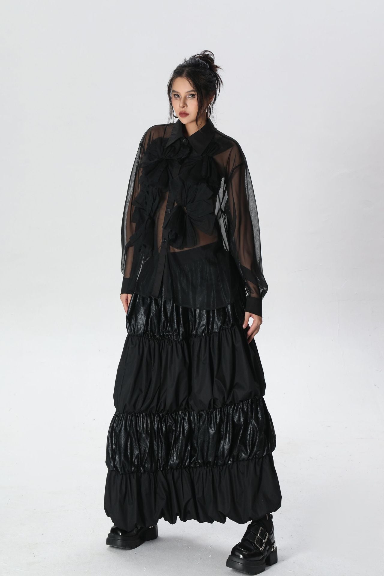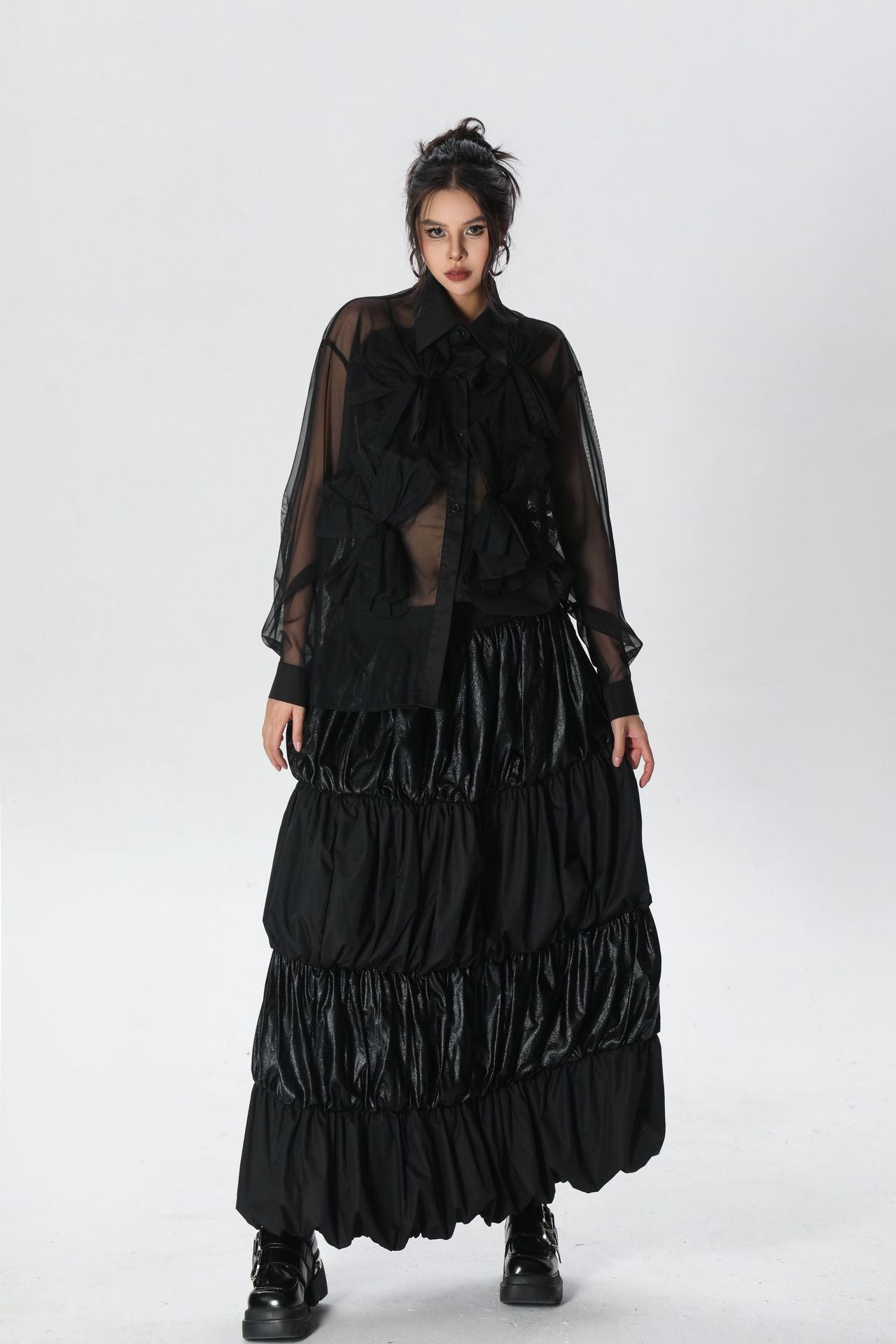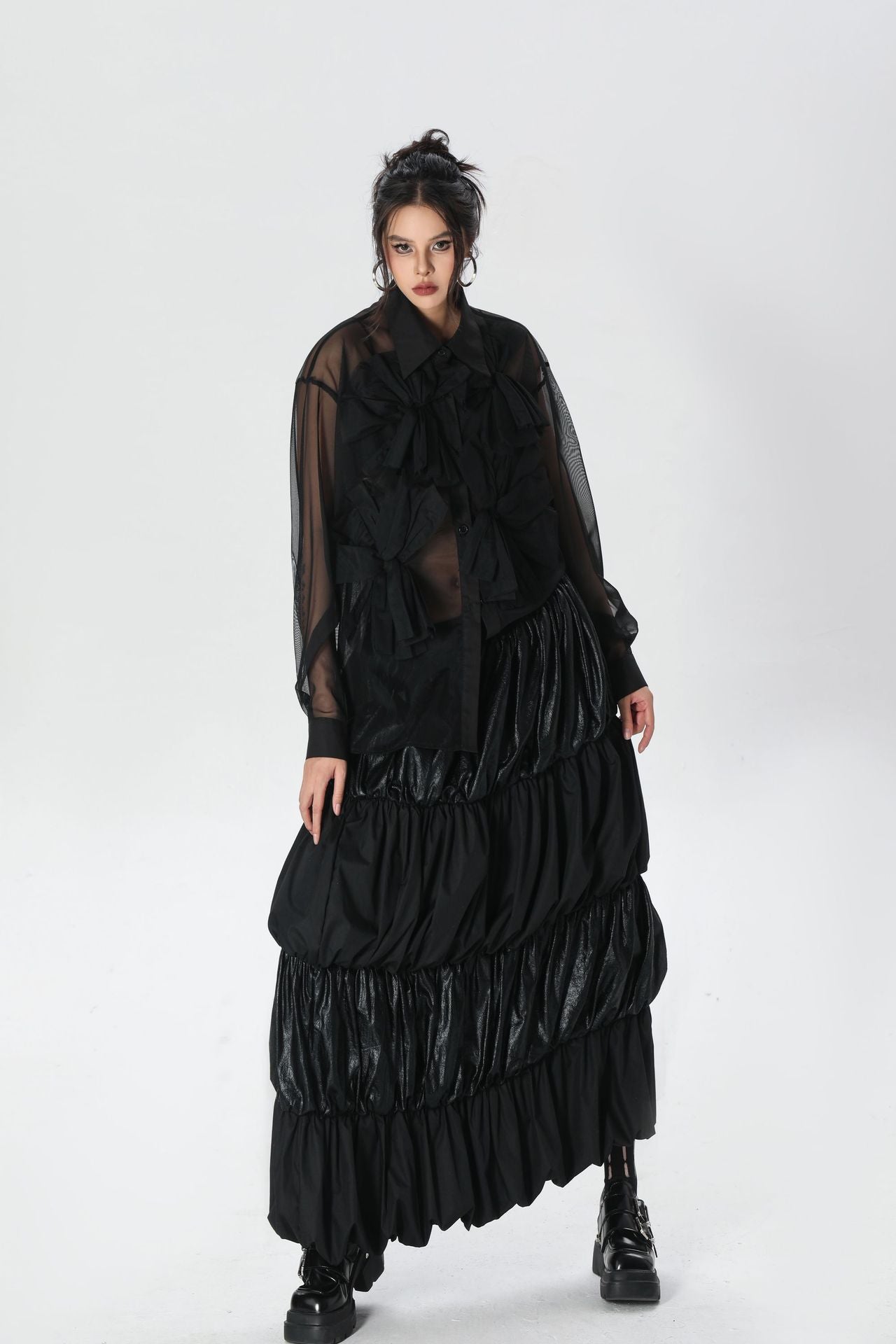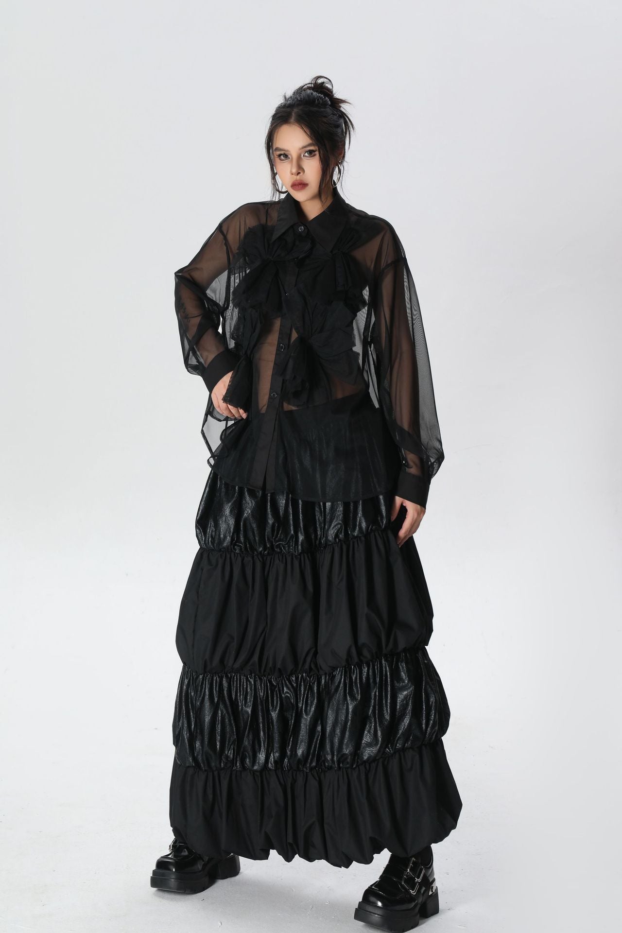 透け感のあるブラックのシアー素材に、複数のボウリボンモチーフを大胆にあしらったデザインシャツ。ボリューム感と立体感を強調するフロントのディテールが印象的で、光を透かす繊細な質感がエッジの効いたモード感を引き立てる。クラシカルな襟とカフスが全体を引き締め、シルエットにコントラストを与える一着。単体でも存在感があり、レイヤードやコーディネートの主軸としても映える一枚。