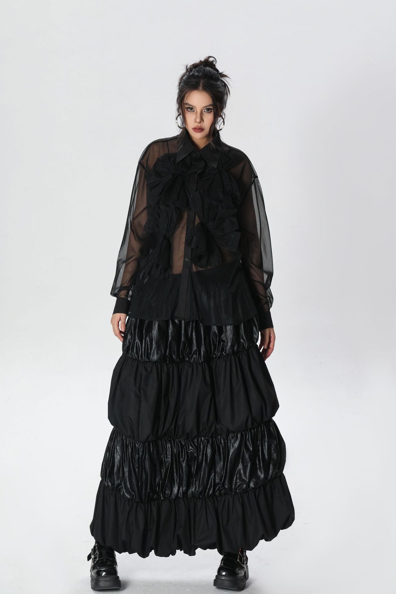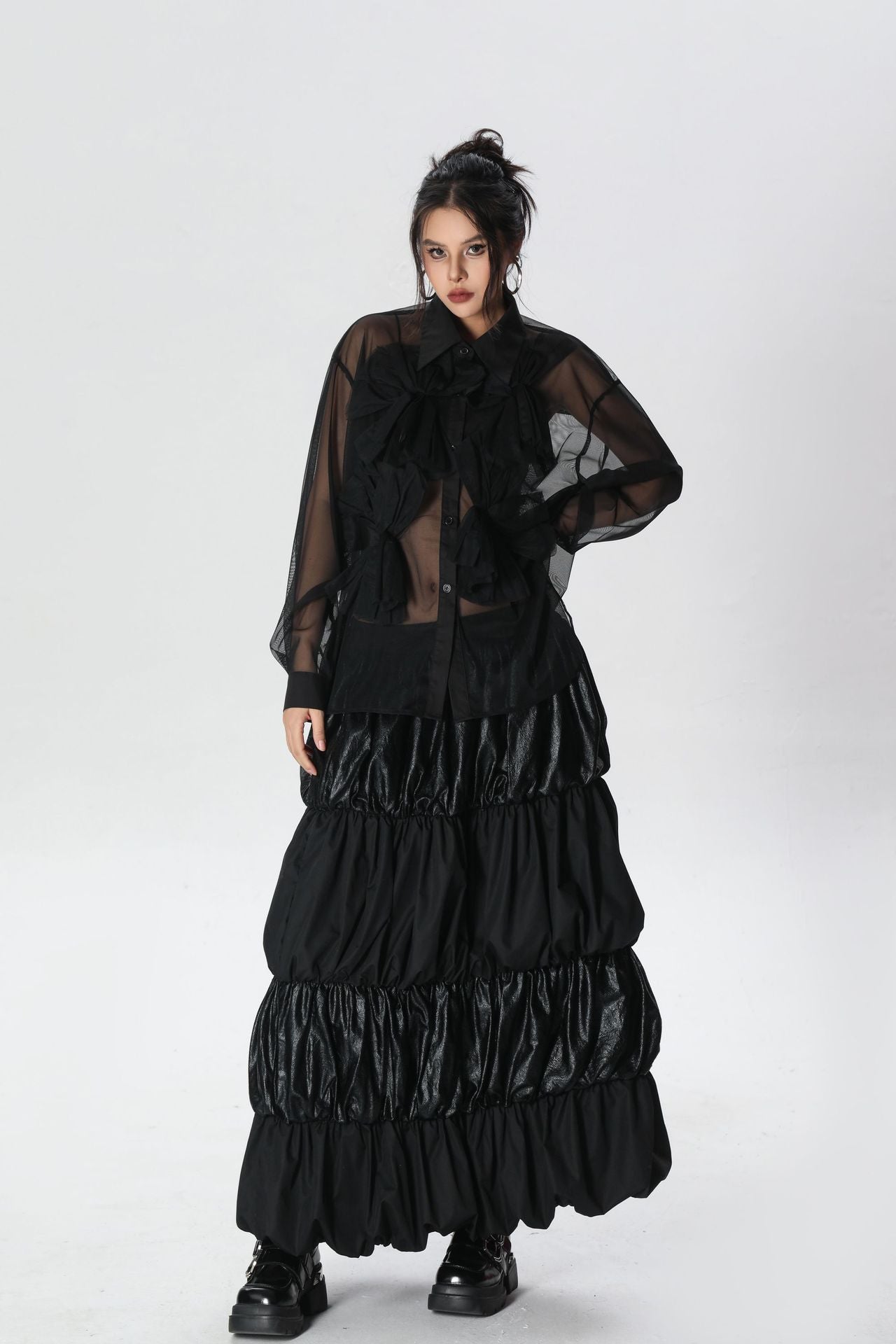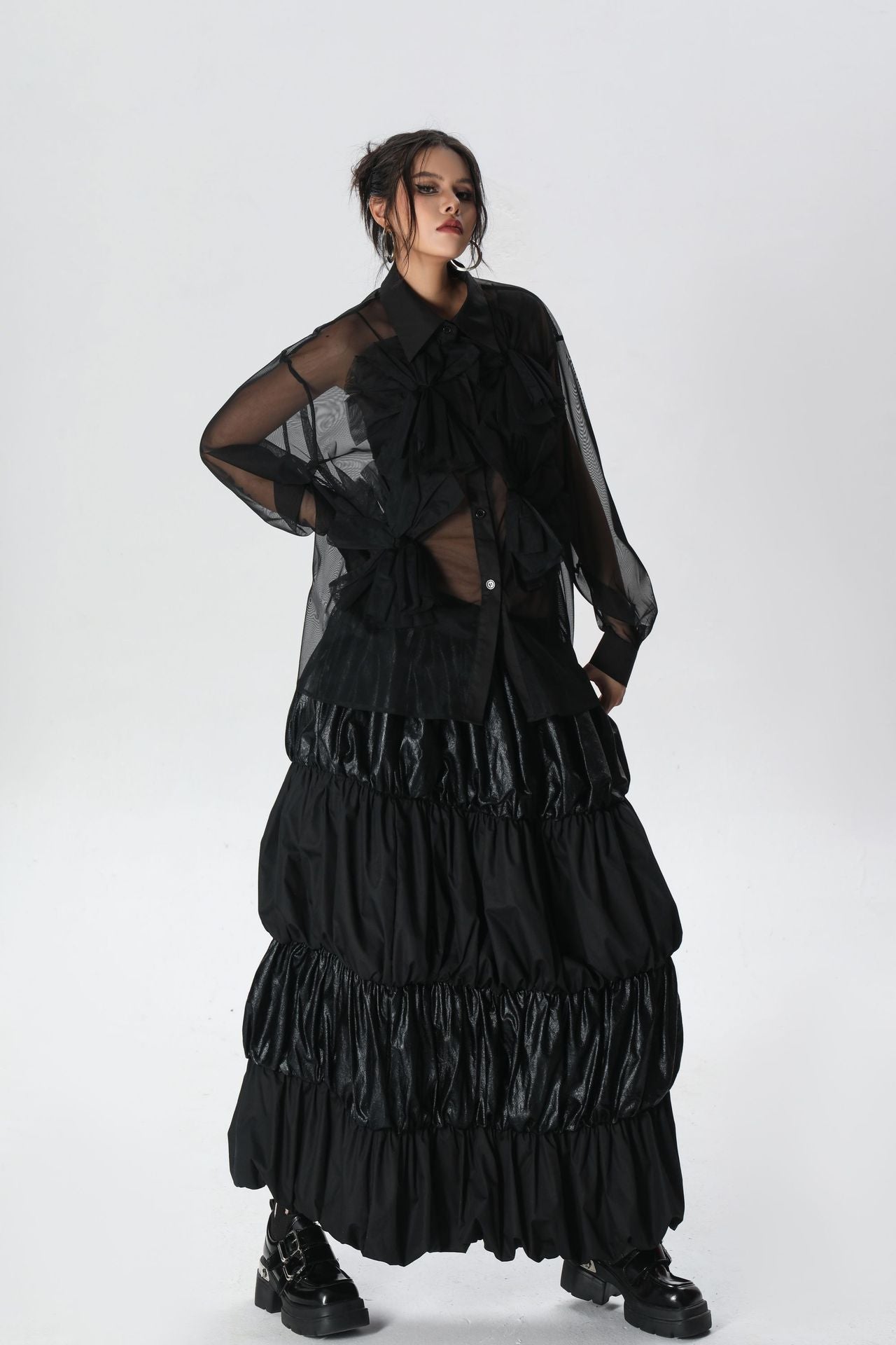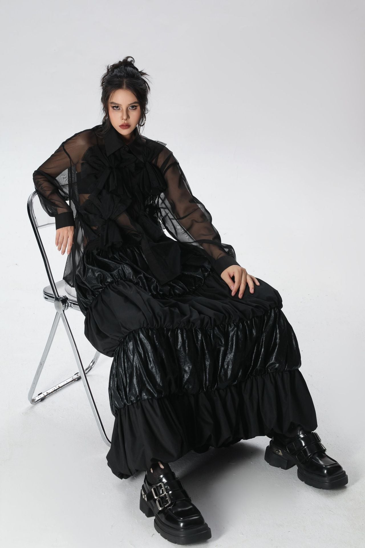 透け感のあるブラックのシアー素材に、複数のボウリボンモチーフを大胆にあしらったデザインシャツ。ボリューム感と立体感を強調するフロントのディテールが印象的で、光を透かす繊細な質感がエッジの効いたモード感を引き立てる。クラシカルな襟とカフスが全体を引き締め、シルエットにコントラストを与える一着。単体でも存在感があり、レイヤードやコーディネートの主軸としても映える一枚。