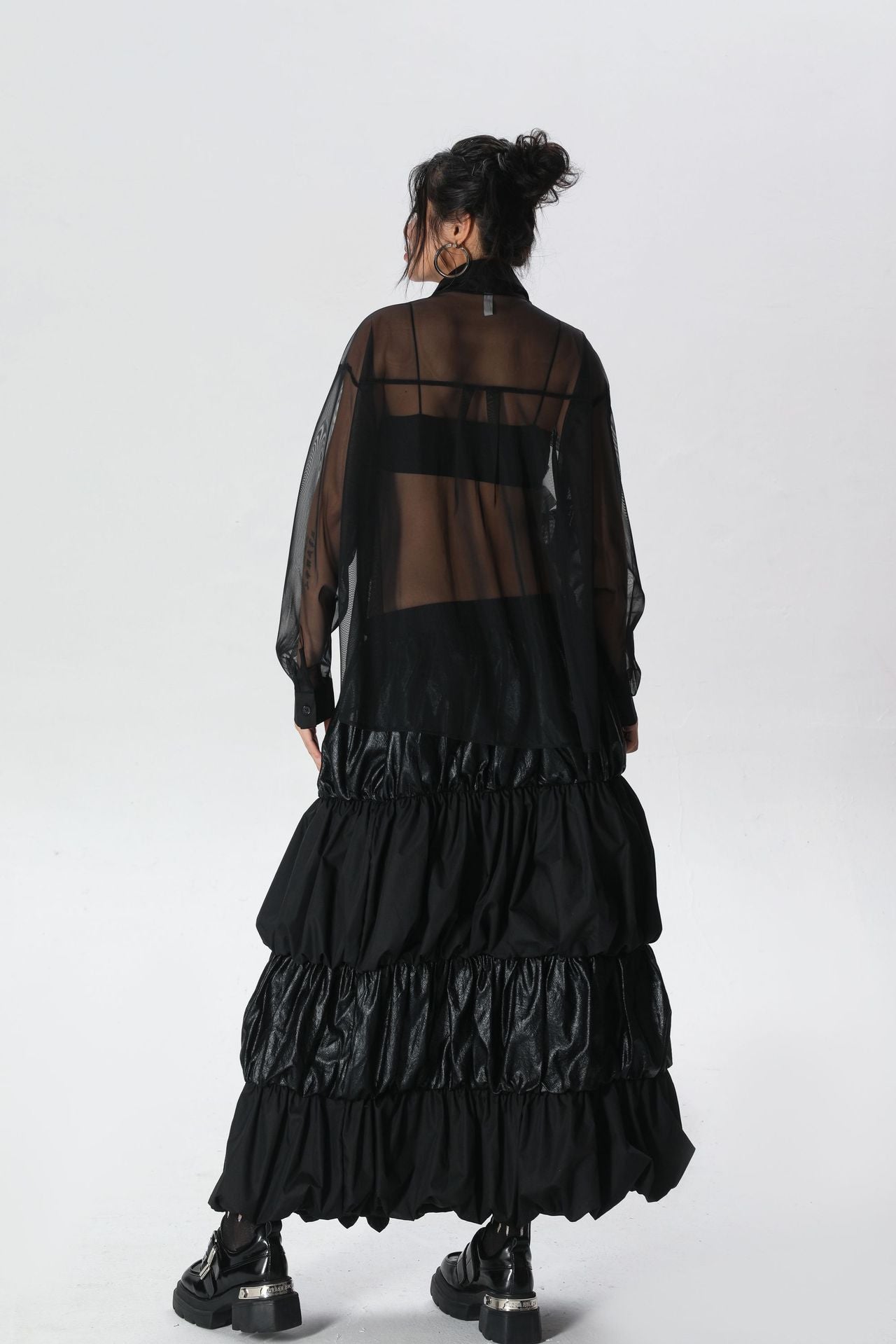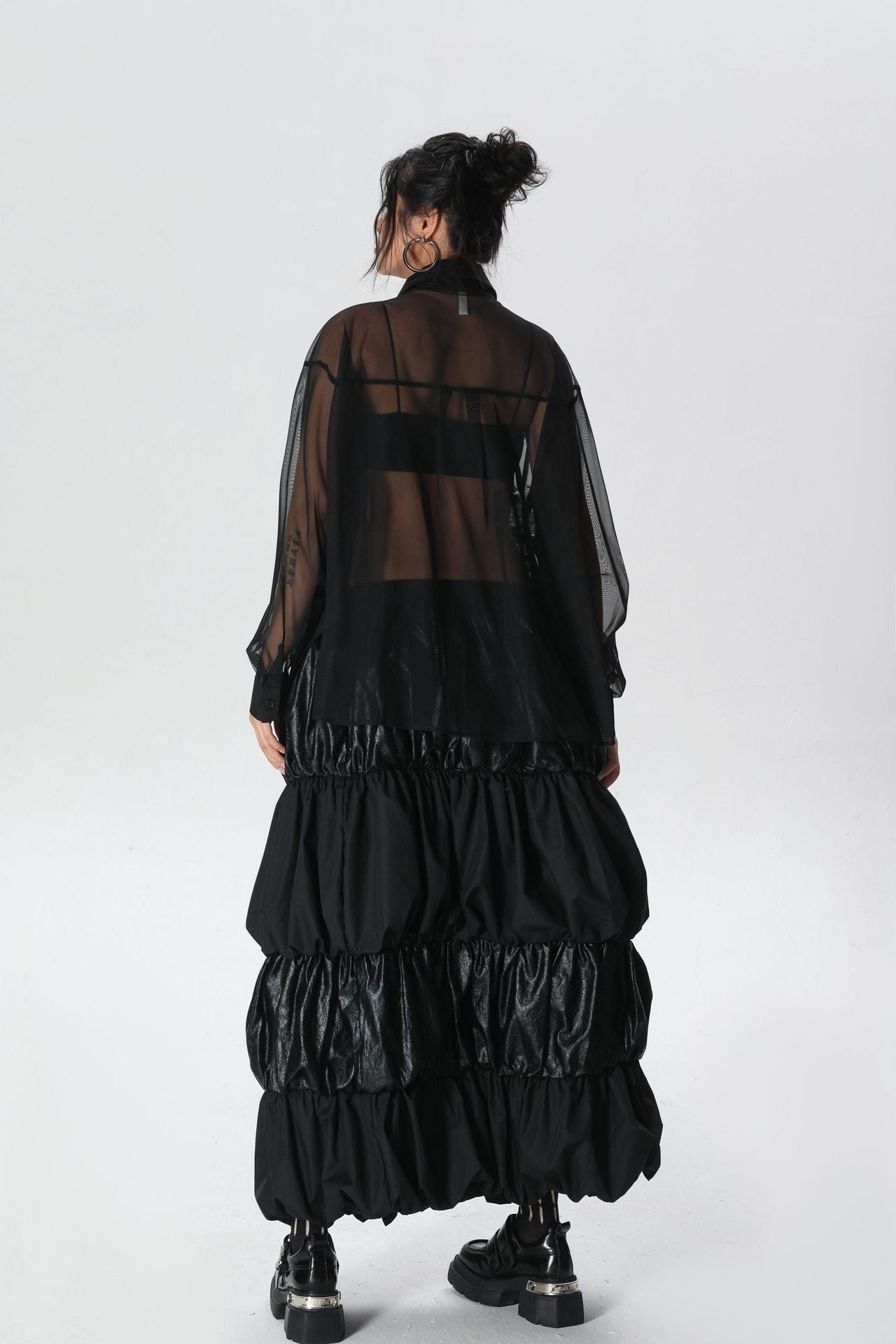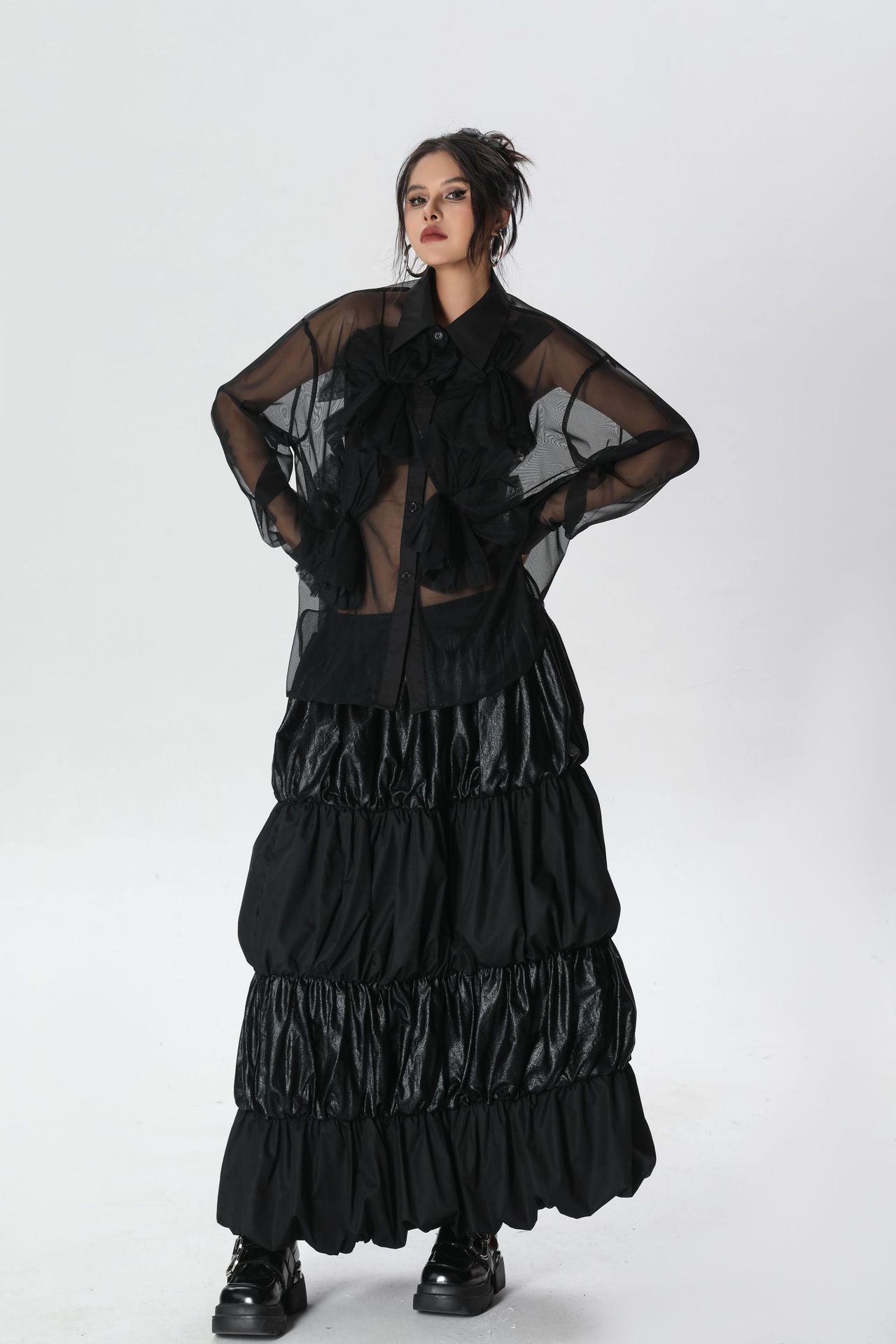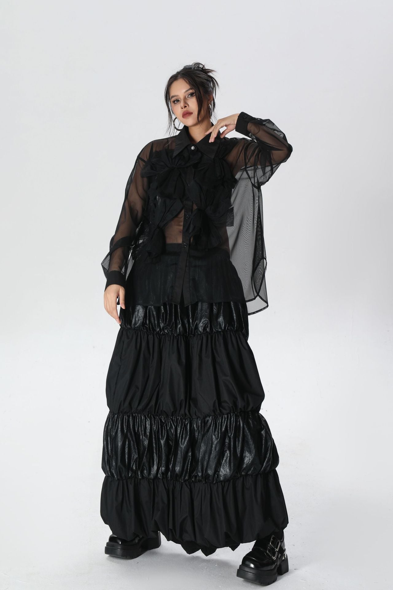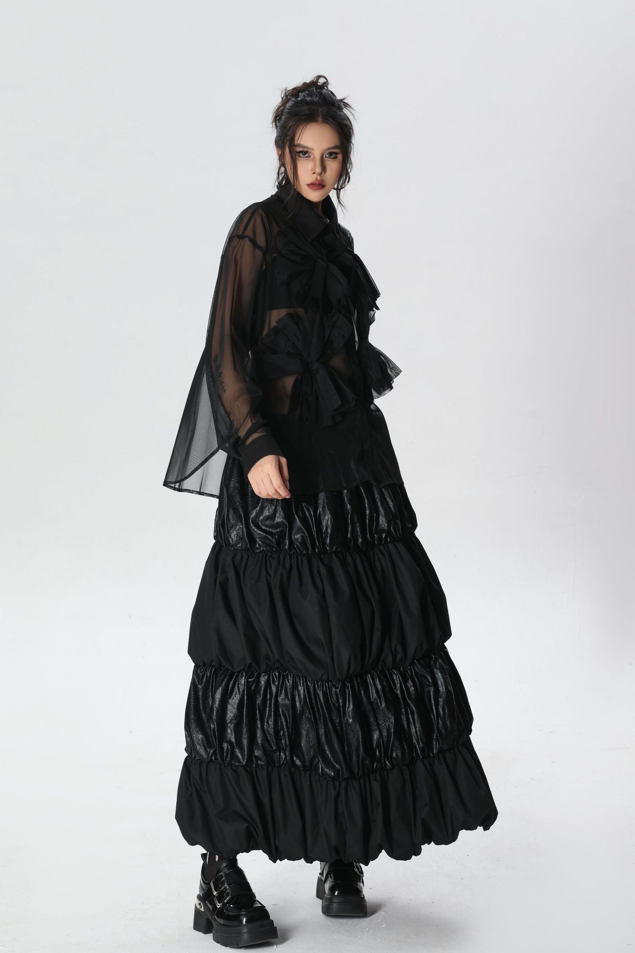 透け感のあるブラックのシアー素材に、複数のボウリボンモチーフを大胆にあしらったデザインシャツ。ボリューム感と立体感を強調するフロントのディテールが印象的で、光を透かす繊細な質感がエッジの効いたモード感を引き立てる。クラシカルな襟とカフスが全体を引き締め、シルエットにコントラストを与える一着。単体でも存在感があり、レイヤードやコーディネートの主軸としても映える一枚。