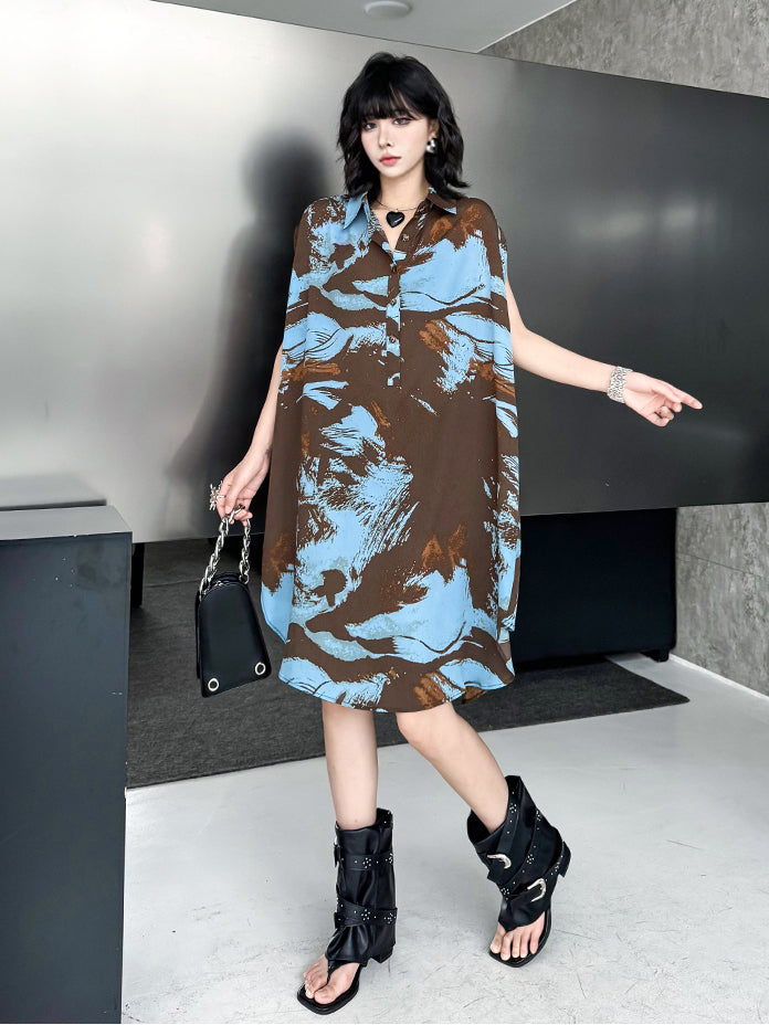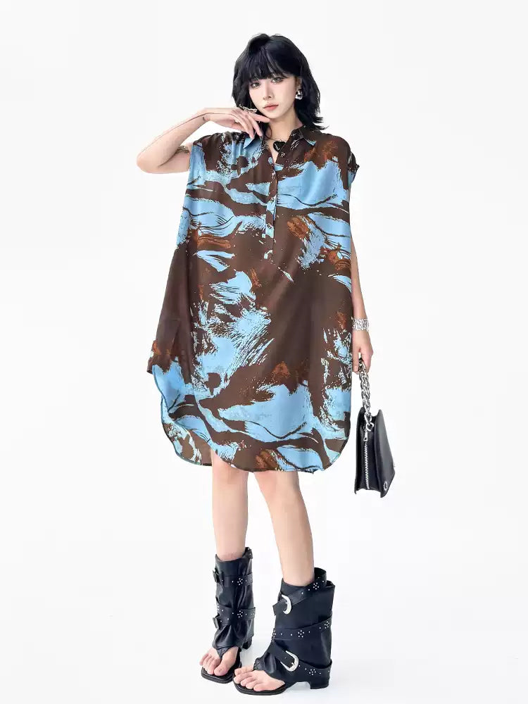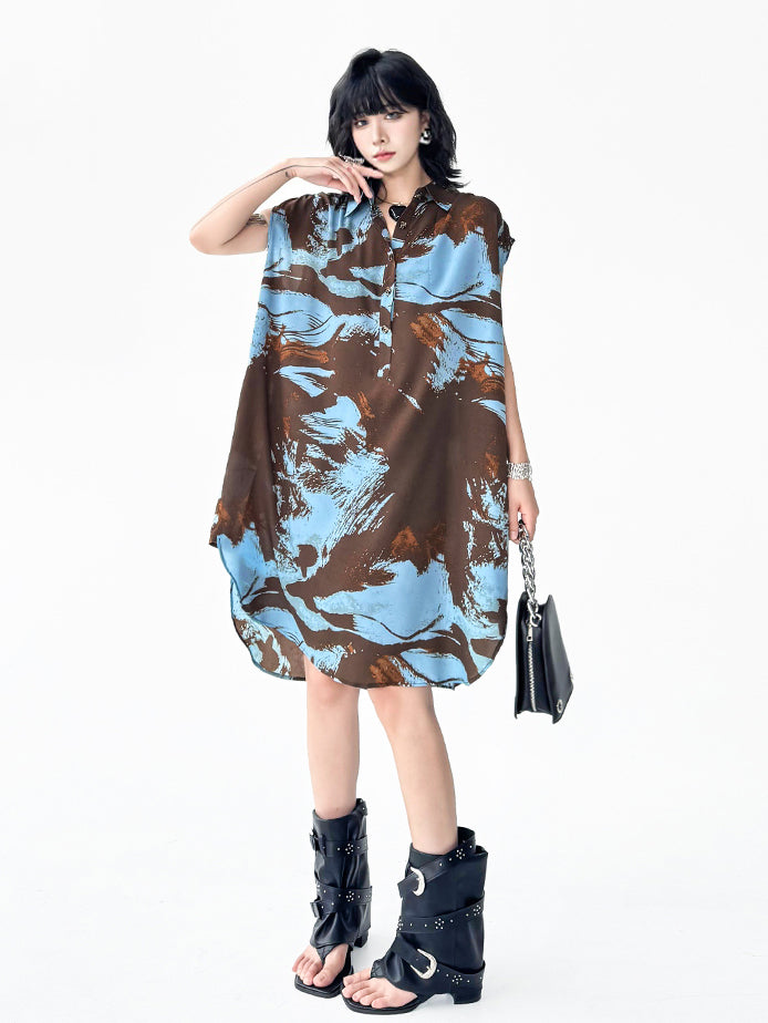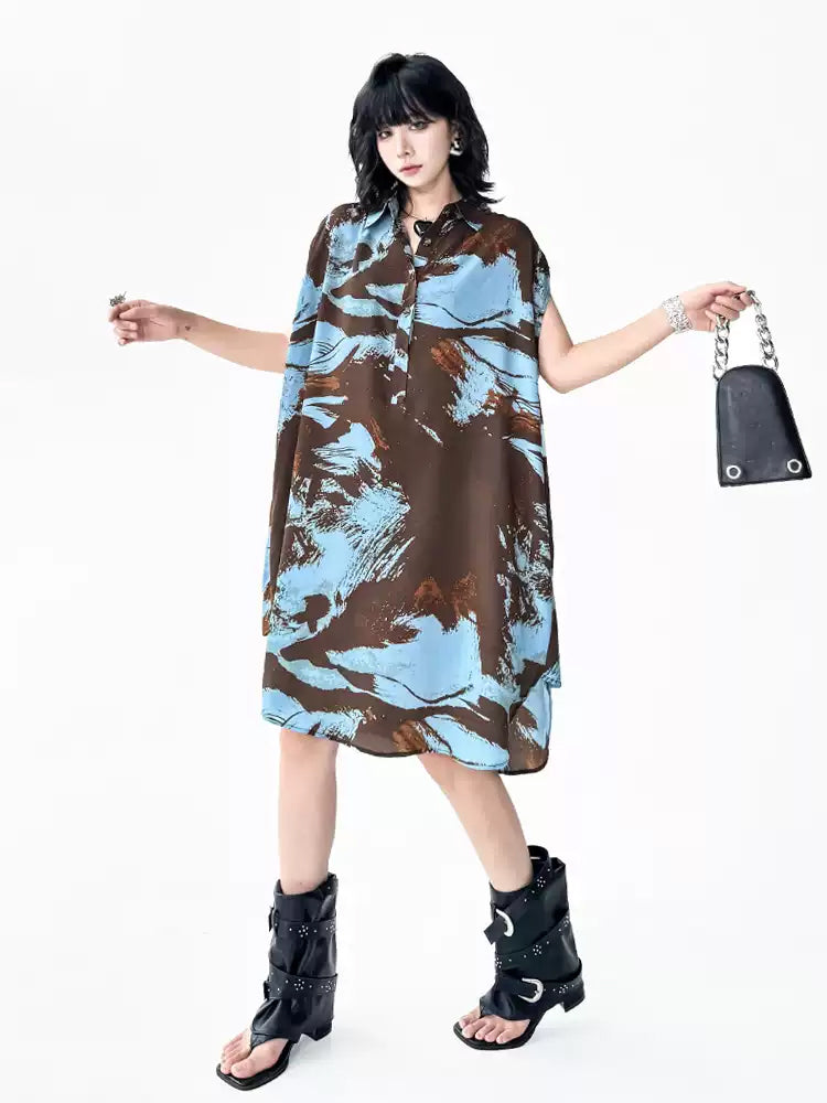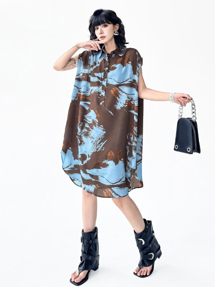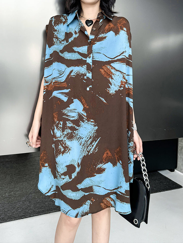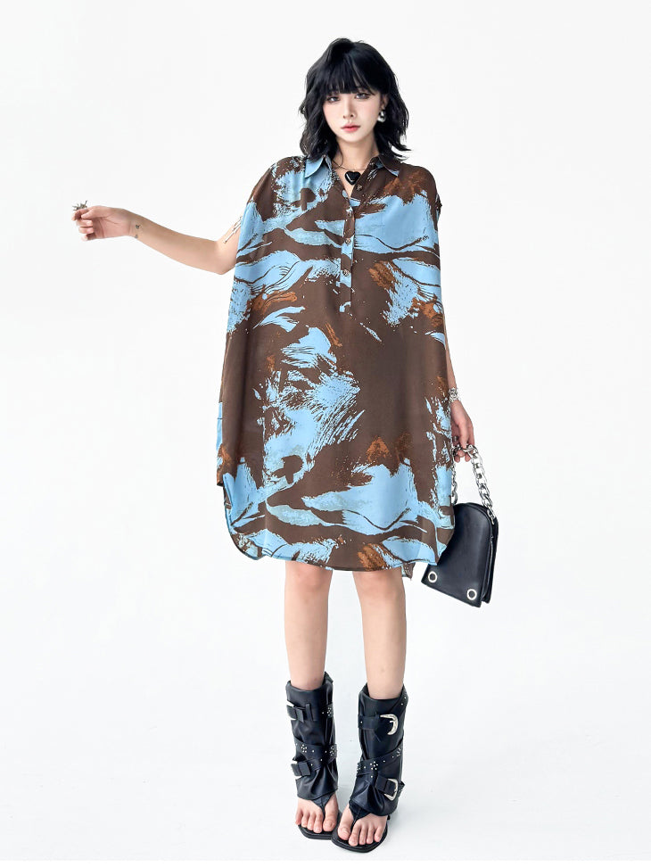 ブラウンを基調にブルーとレンガカラーが重なる大胆な抽象柄のシャツドレス。柔らかく落ち感のある生地が生み出すナチュラルな広がりが特徴。前立てにはボタンを配し、シャツカラーとゆとりのある肩幅設計でリラックス感を演出。裾に向かって緩やかに広がるシルエットが軽やかさと存在感を両立し、モードにもカジュアルにも着回せる構成となっている