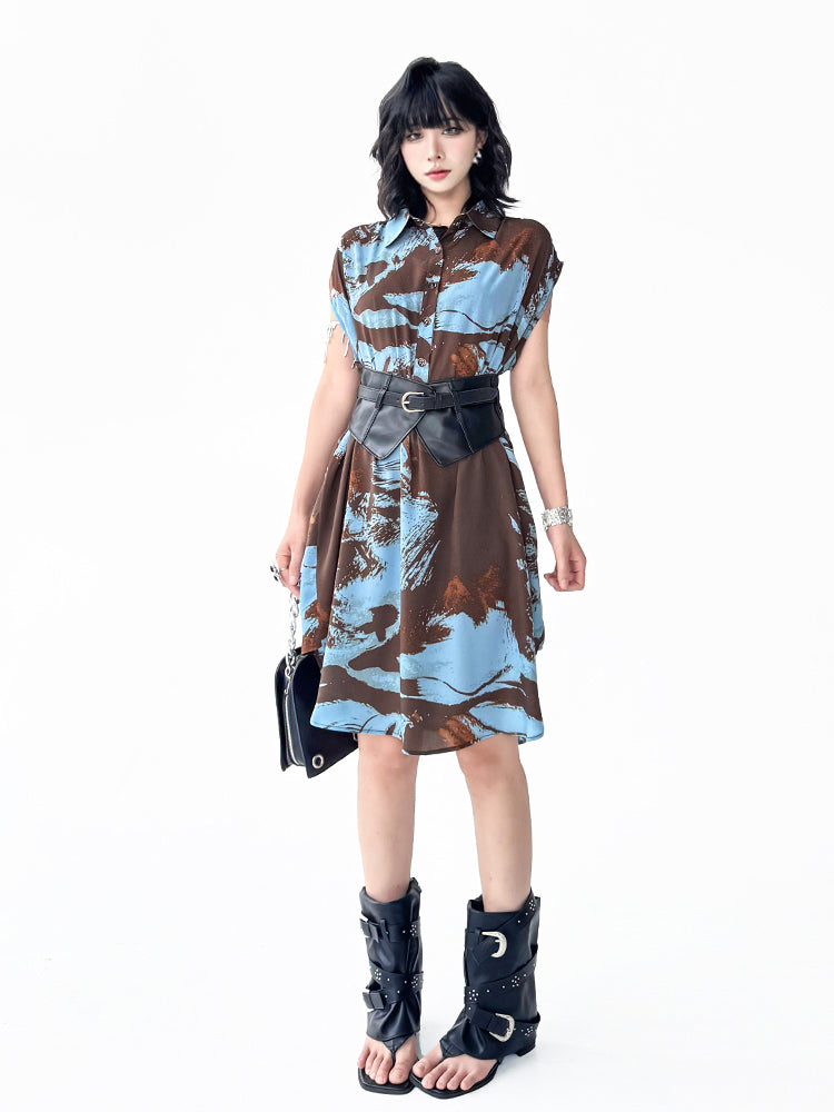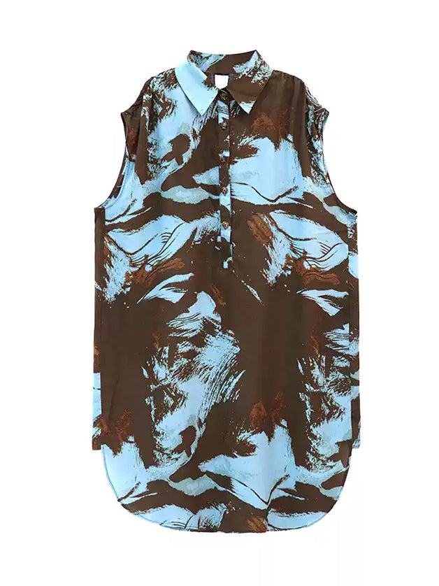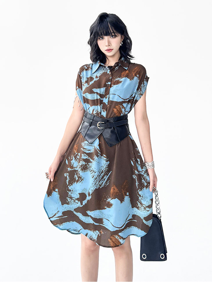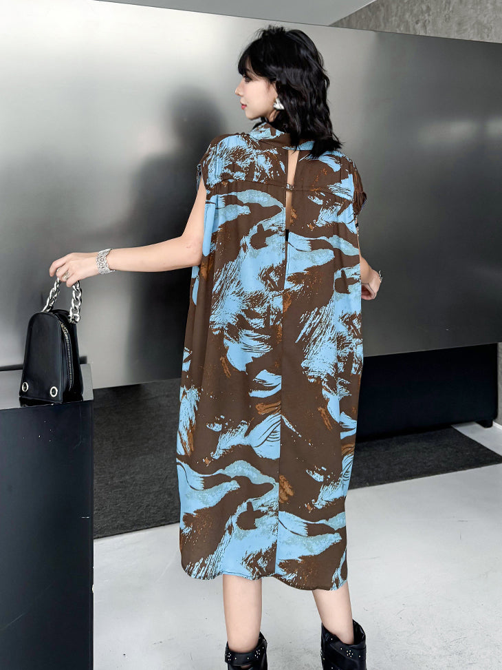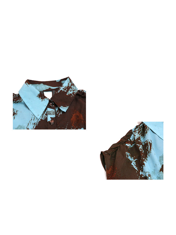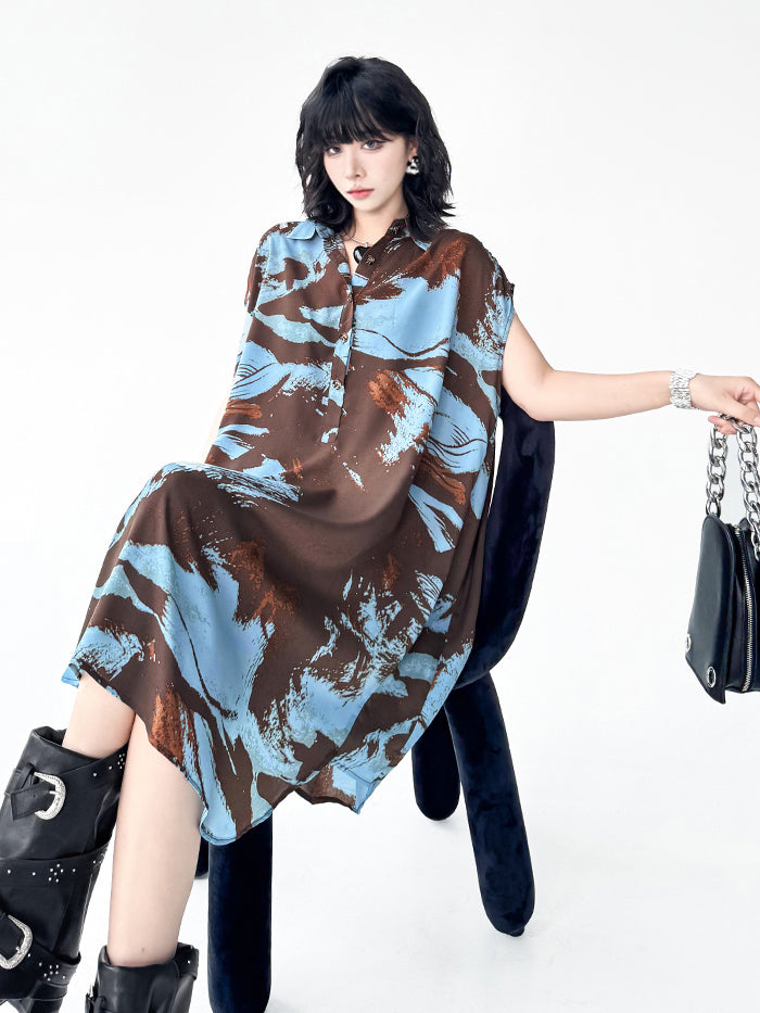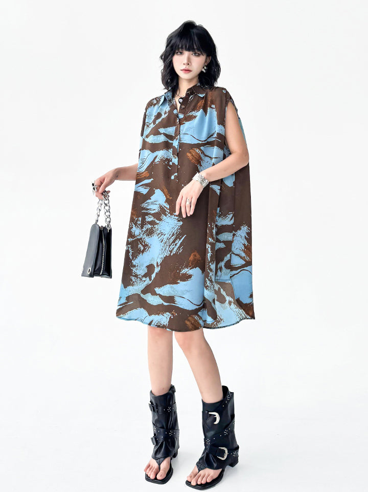 ブラウンを基調にブルーとレンガカラーが重なる大胆な抽象柄のシャツドレス。柔らかく落ち感のある生地が生み出すナチュラルな広がりが特徴。前立てにはボタンを配し、シャツカラーとゆとりのある肩幅設計でリラックス感を演出。裾に向かって緩やかに広がるシルエットが軽やかさと存在感を両立し、モードにもカジュアルにも着回せる構成となっている