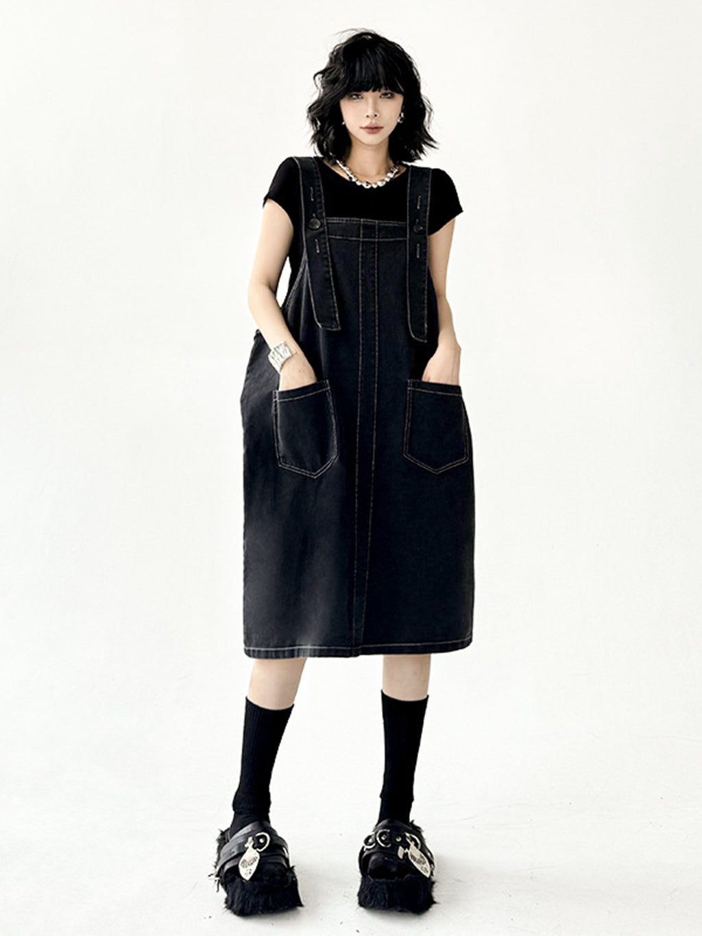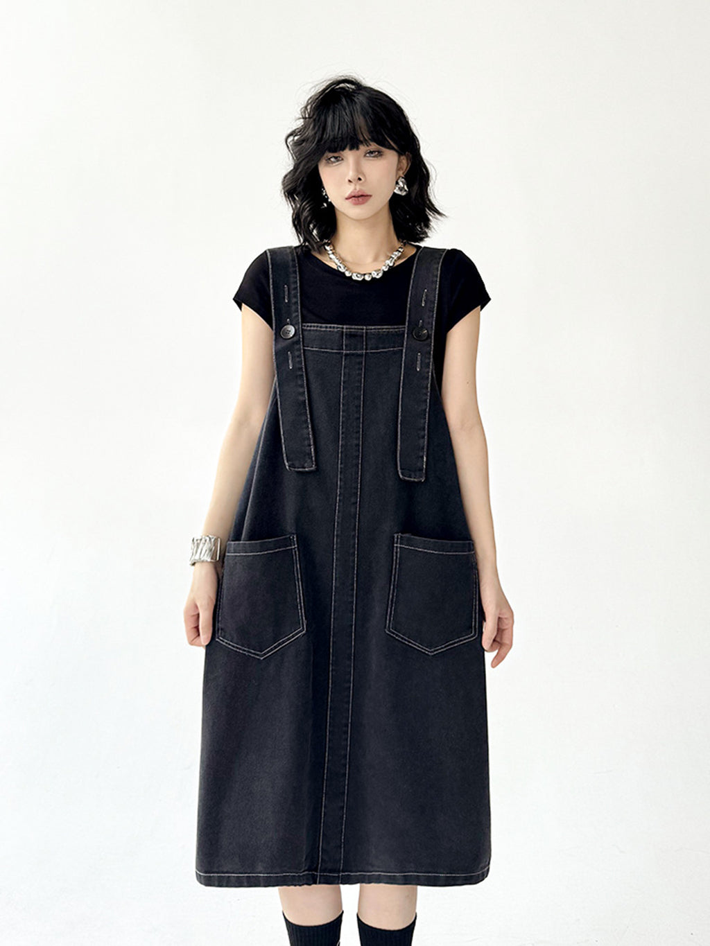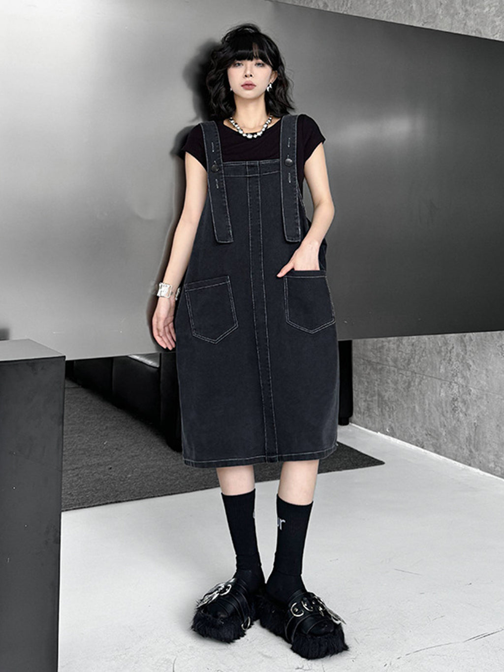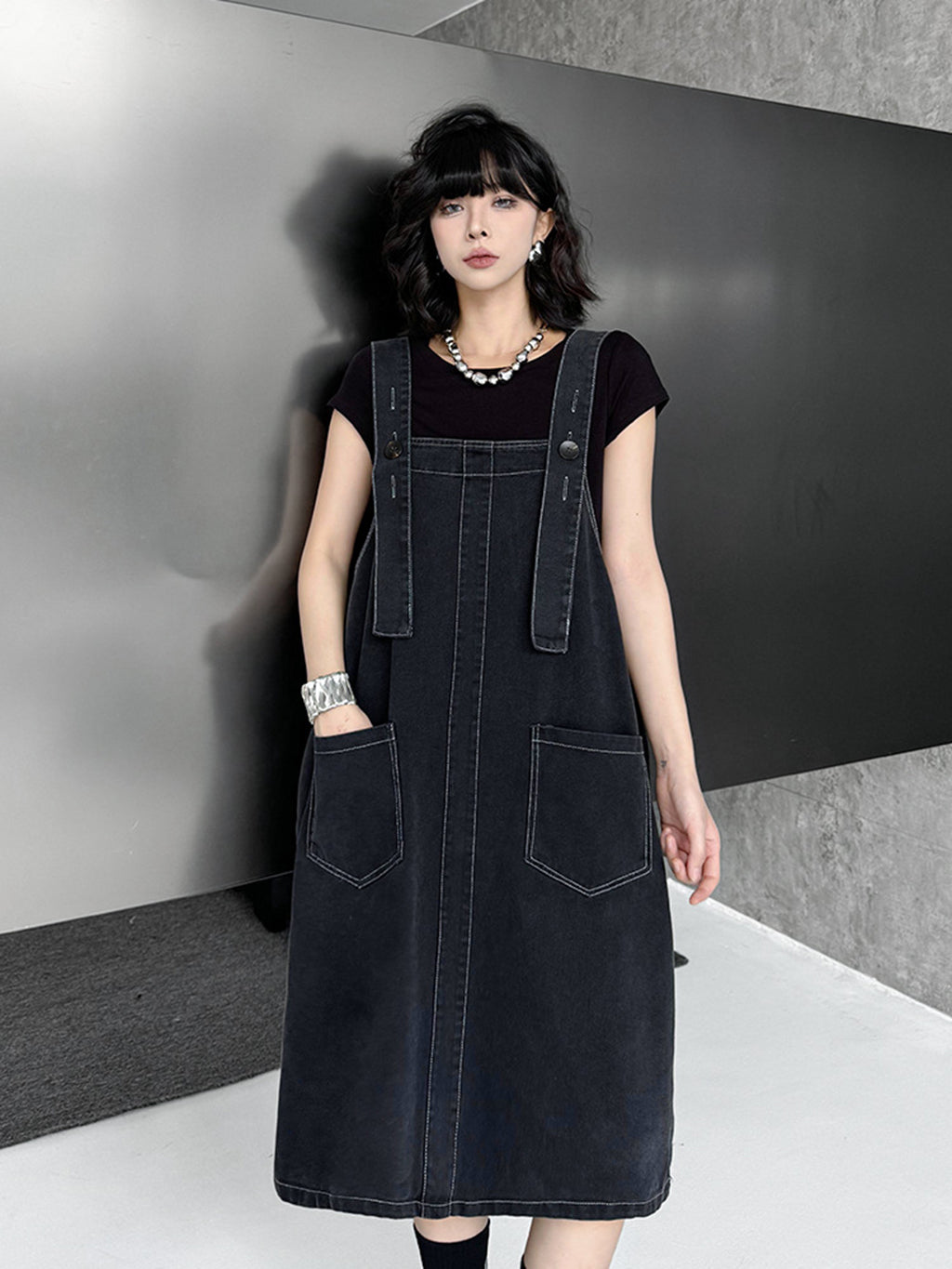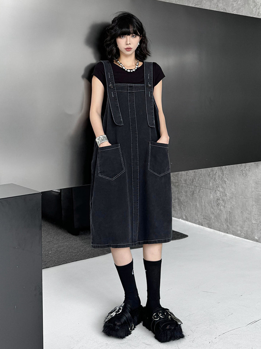 立体感のあるワイドサスペンダーが目を惹くブラックドレス。