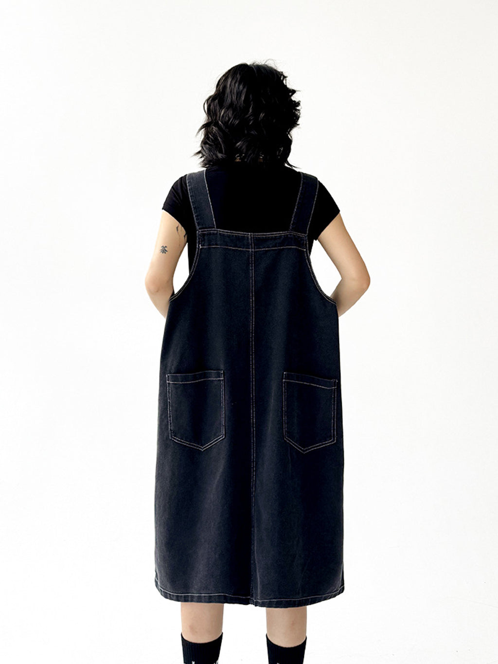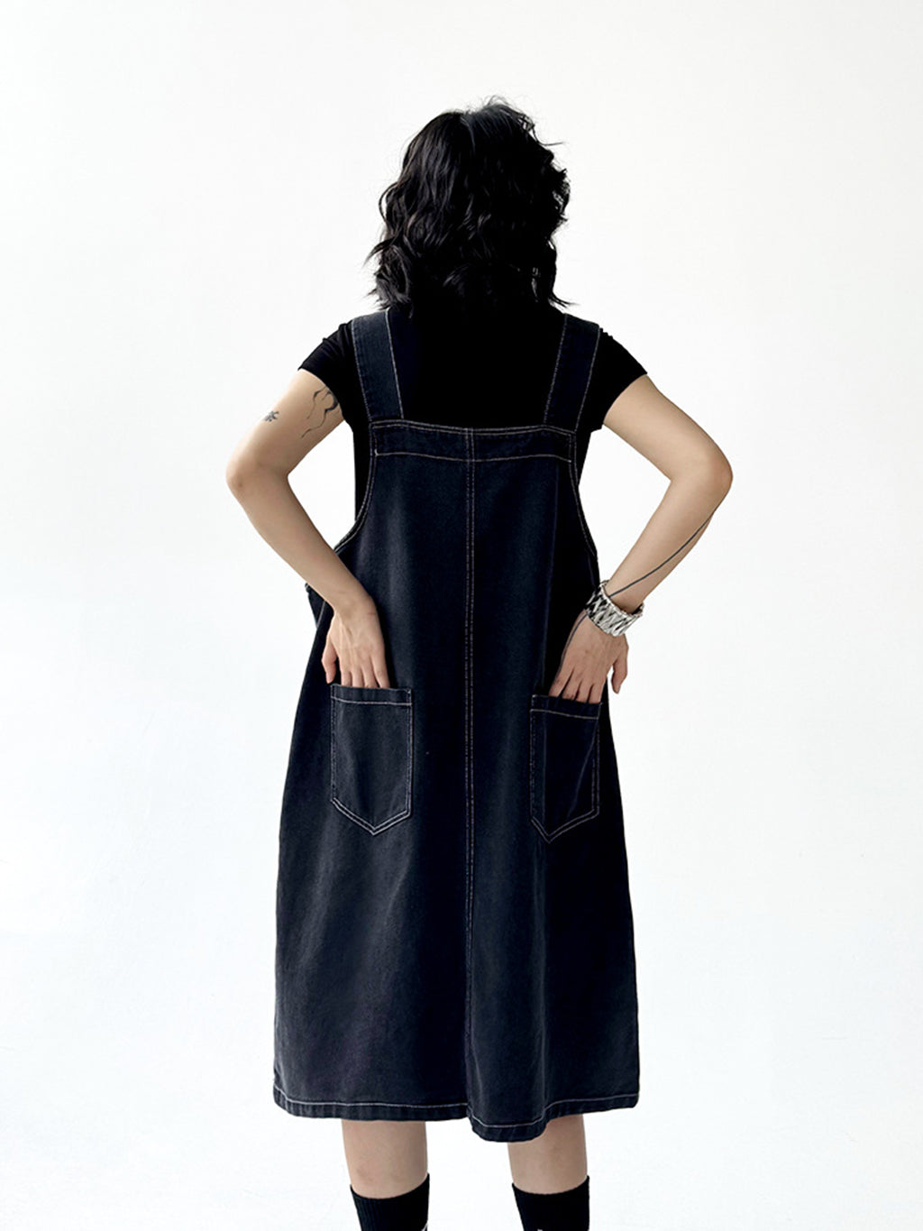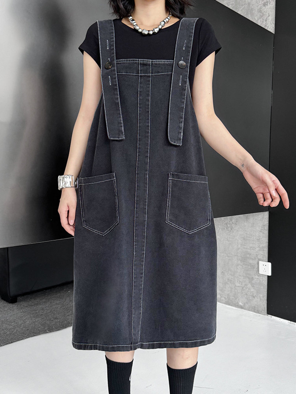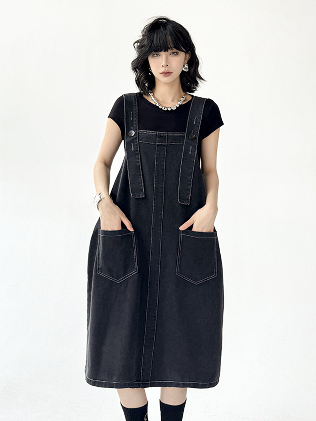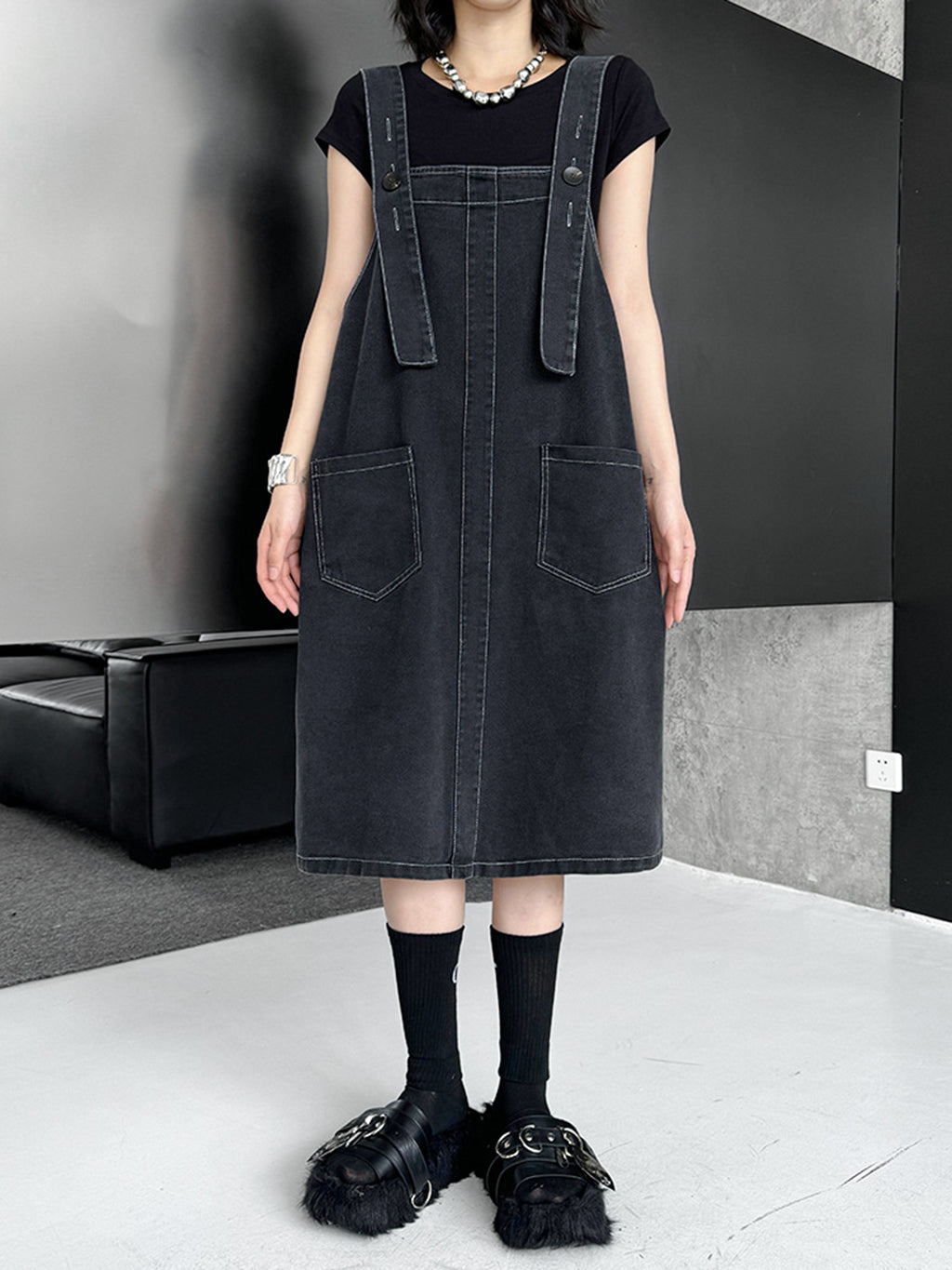 立体感のあるワイドサスペンダーが目を惹くブラックドレス。