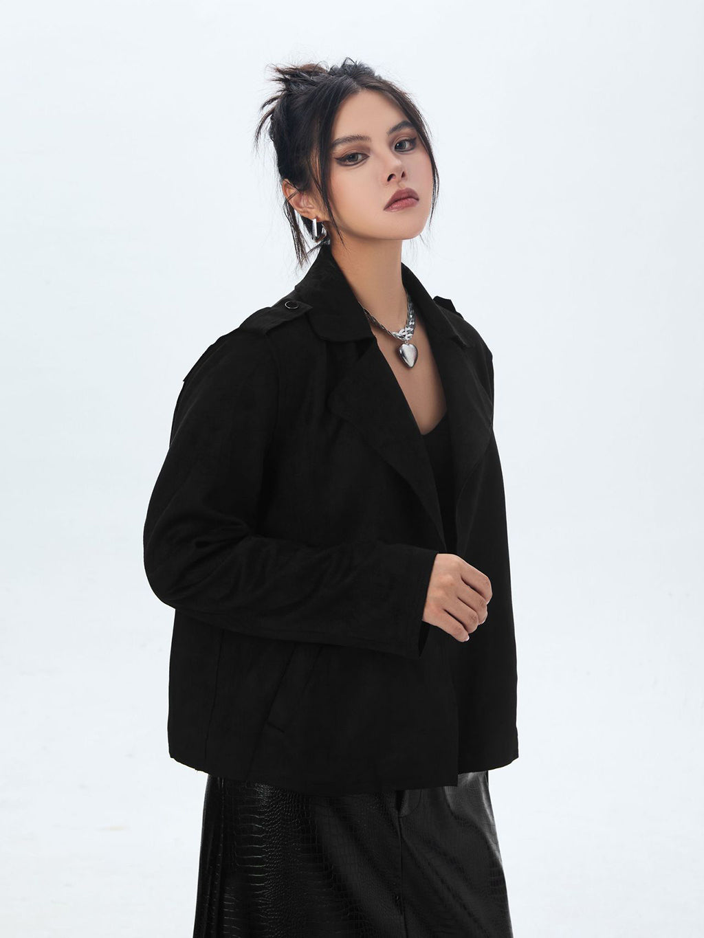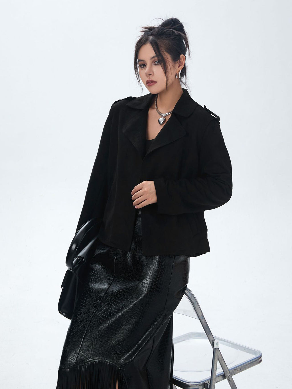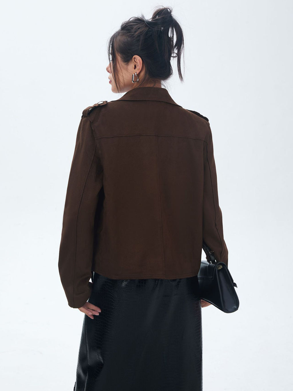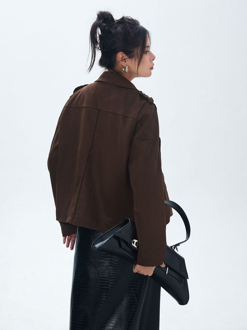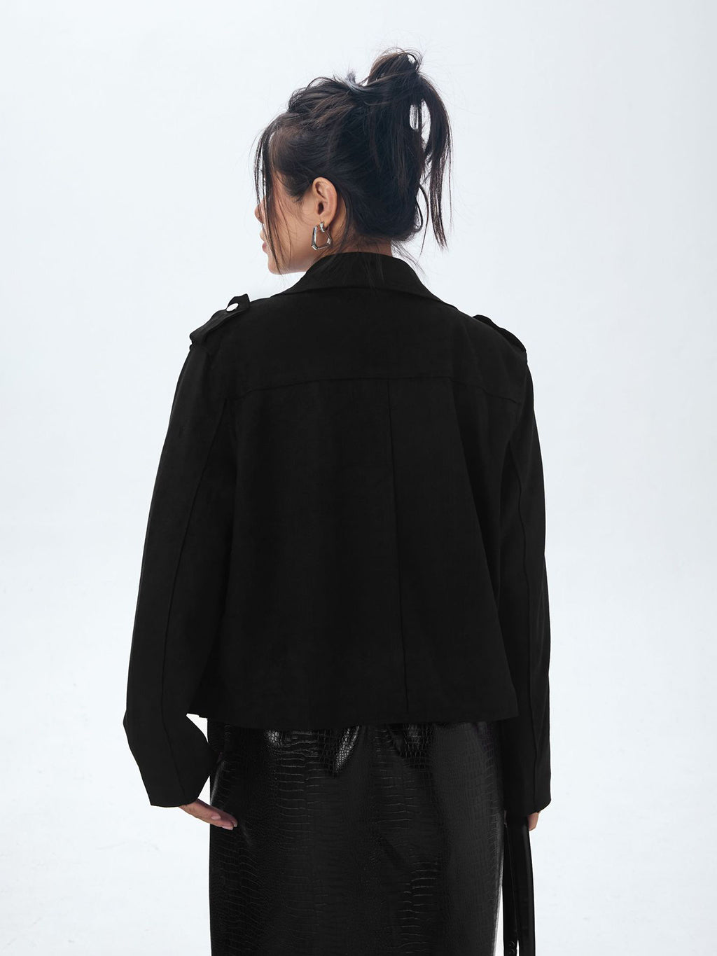 マットでしっとりとした質感の素材を使用し、洗練された佇まいを演出するショート丈ジャケット。肩のエポーレットがさりげないアクセントを添える。フロントはすっきりとした比翼風デザインで、無駄のないミニマルな印象に仕上げられている。軽やかな着心地で、シーズンを問わず幅広いスタイリングに取り入れやすい一着。