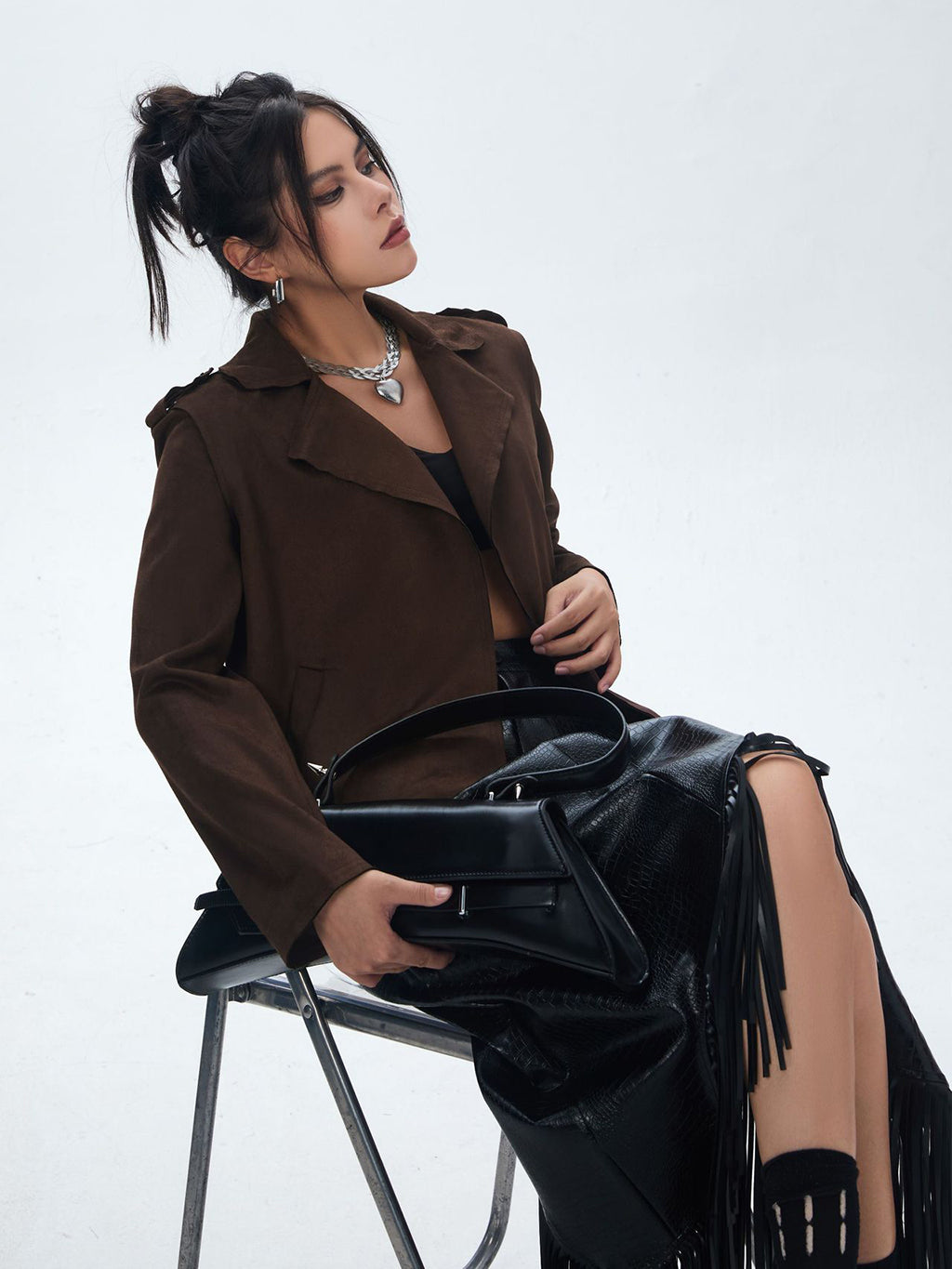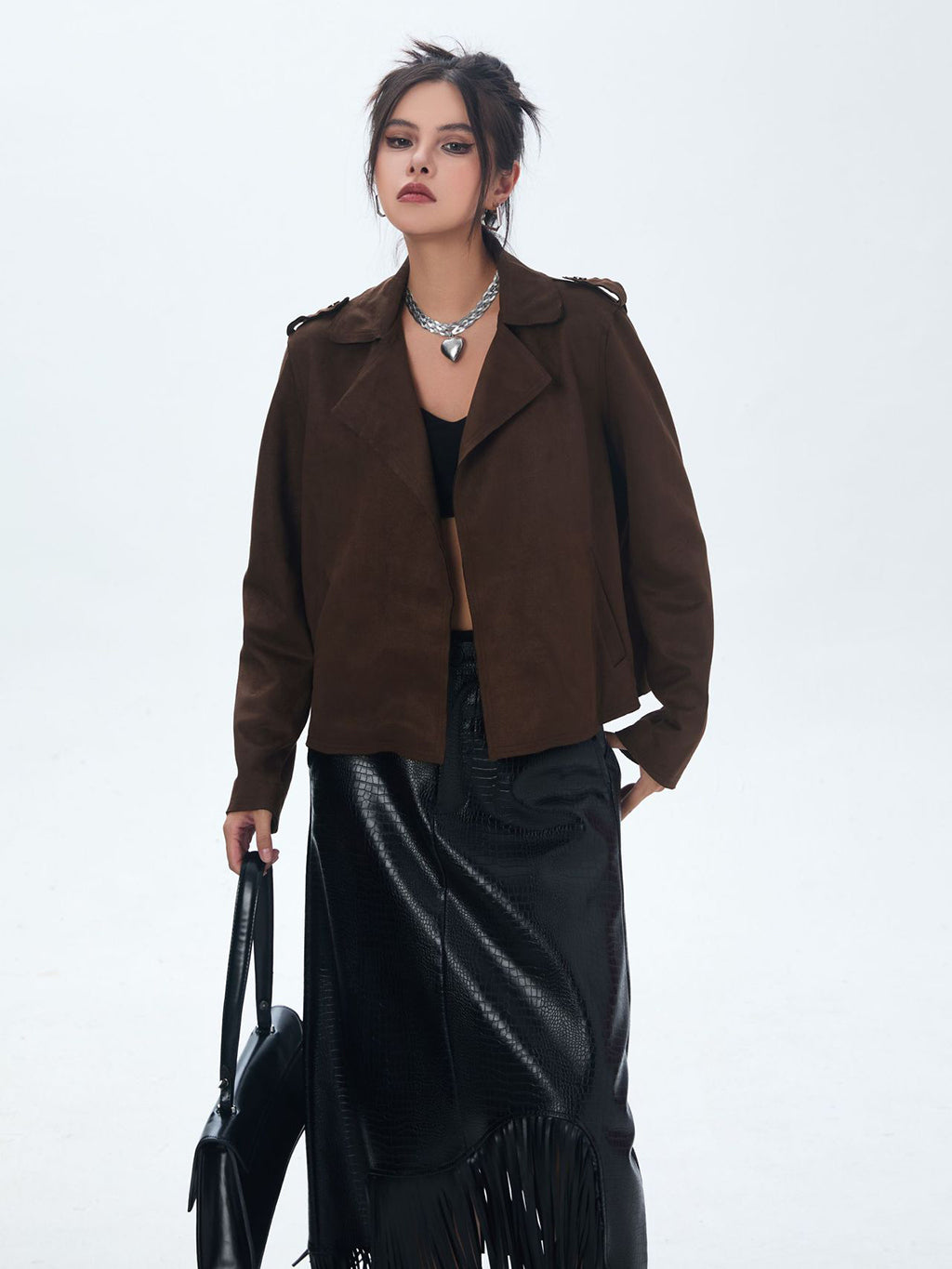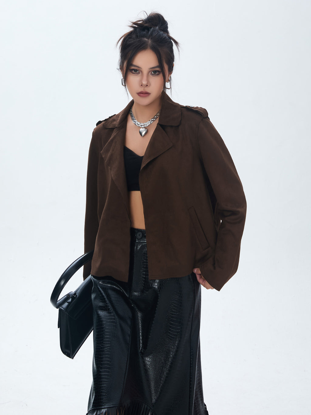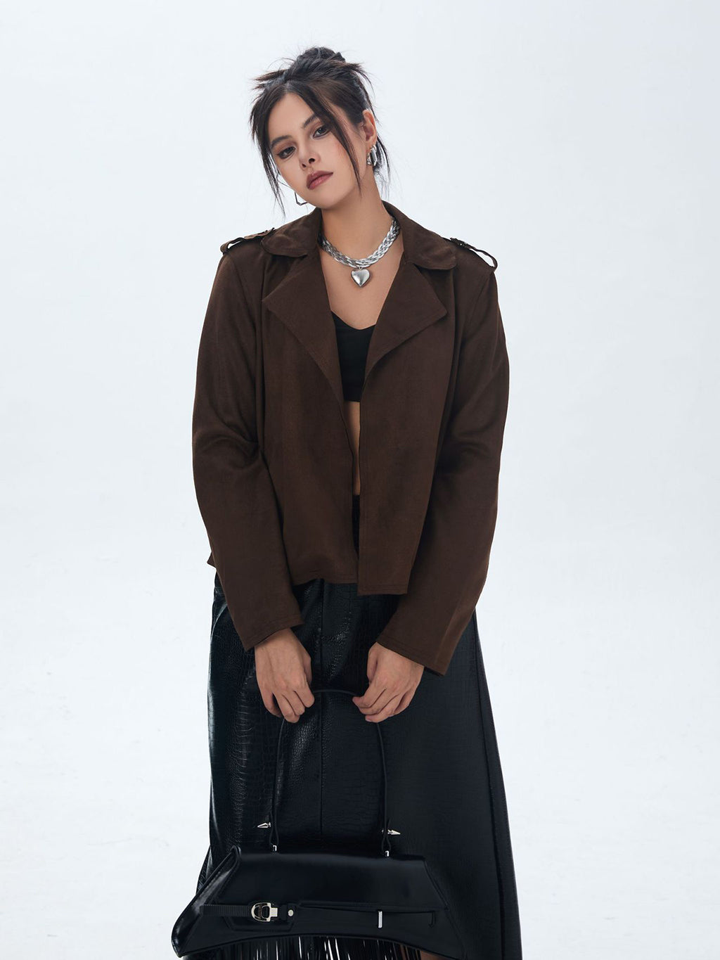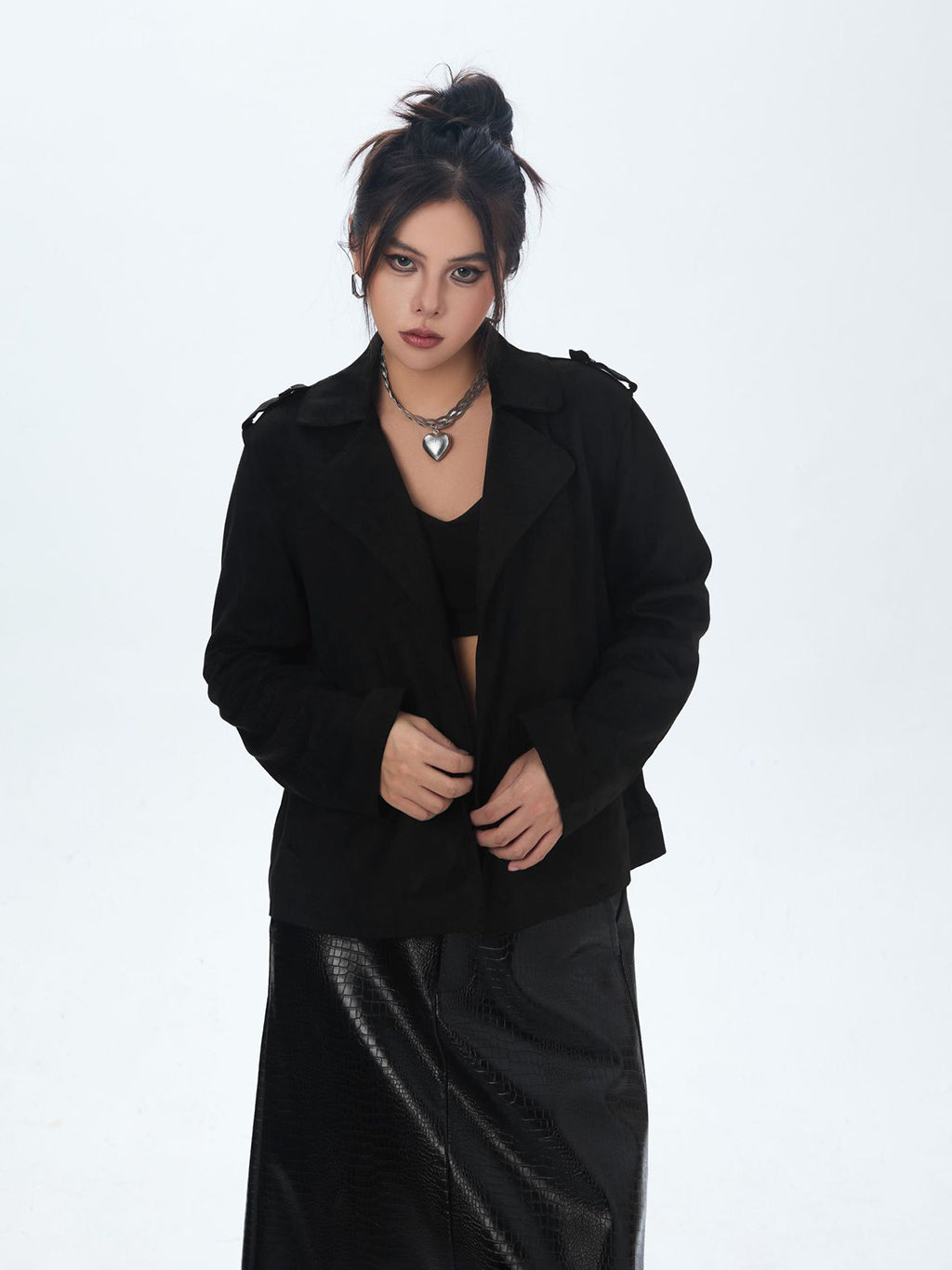 マットでしっとりとした質感の素材を使用し、洗練された佇まいを演出するショート丈ジャケット。肩のエポーレットがさりげないアクセントを添える。フロントはすっきりとした比翼風デザインで、無駄のないミニマルな印象に仕上げられている。軽やかな着心地で、シーズンを問わず幅広いスタイリングに取り入れやすい一着。