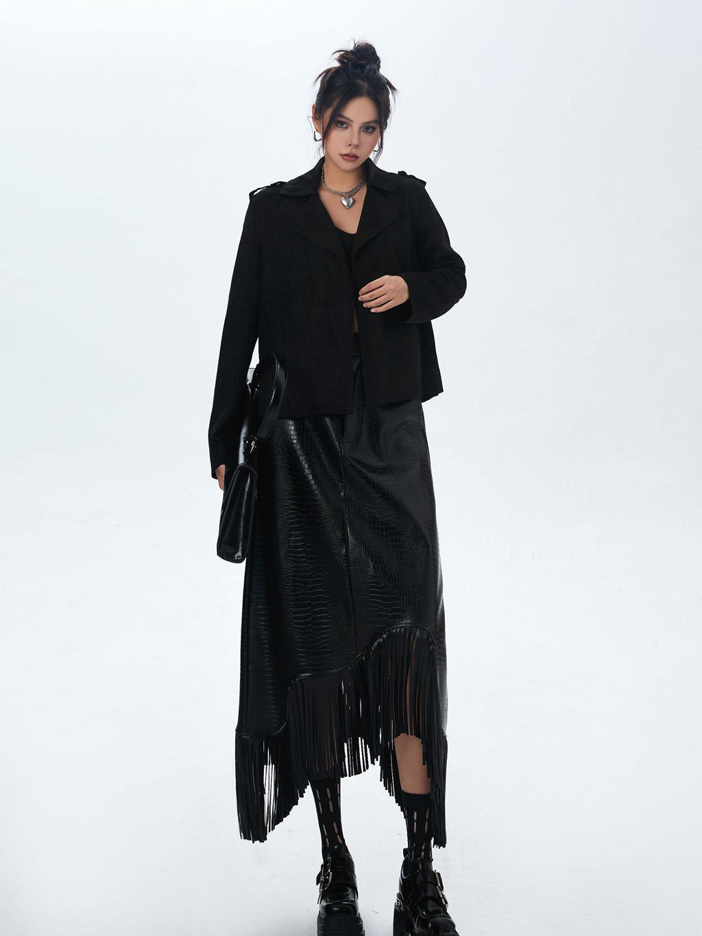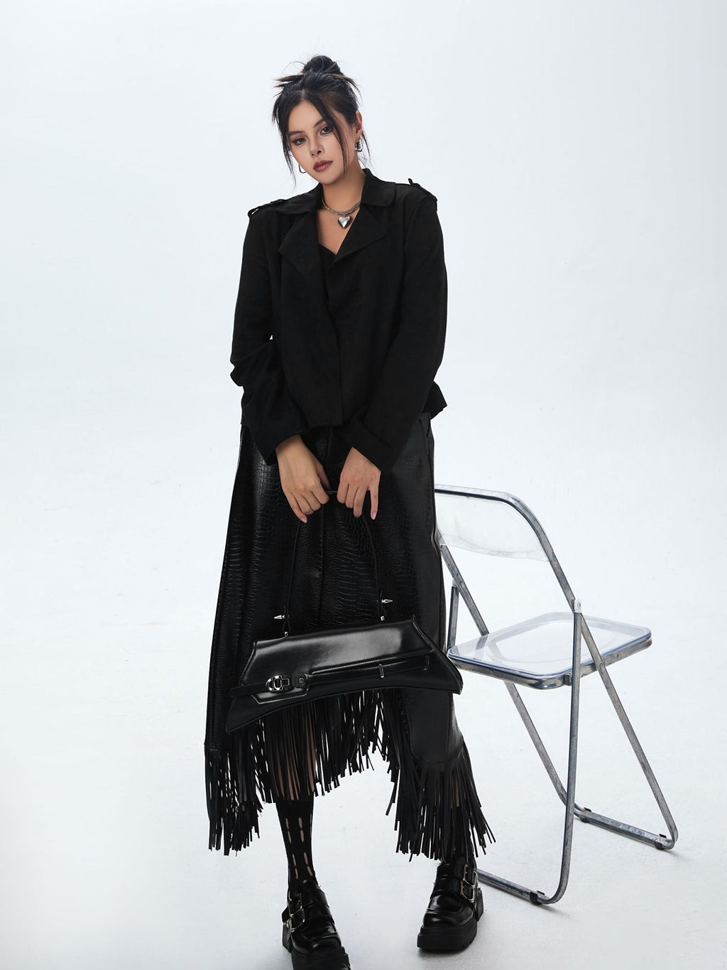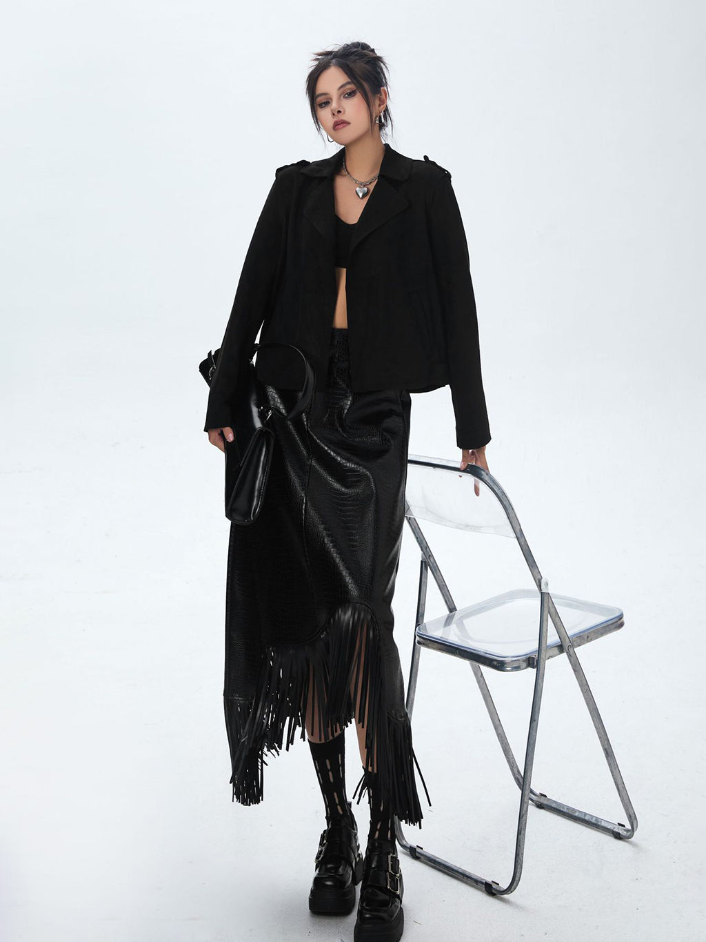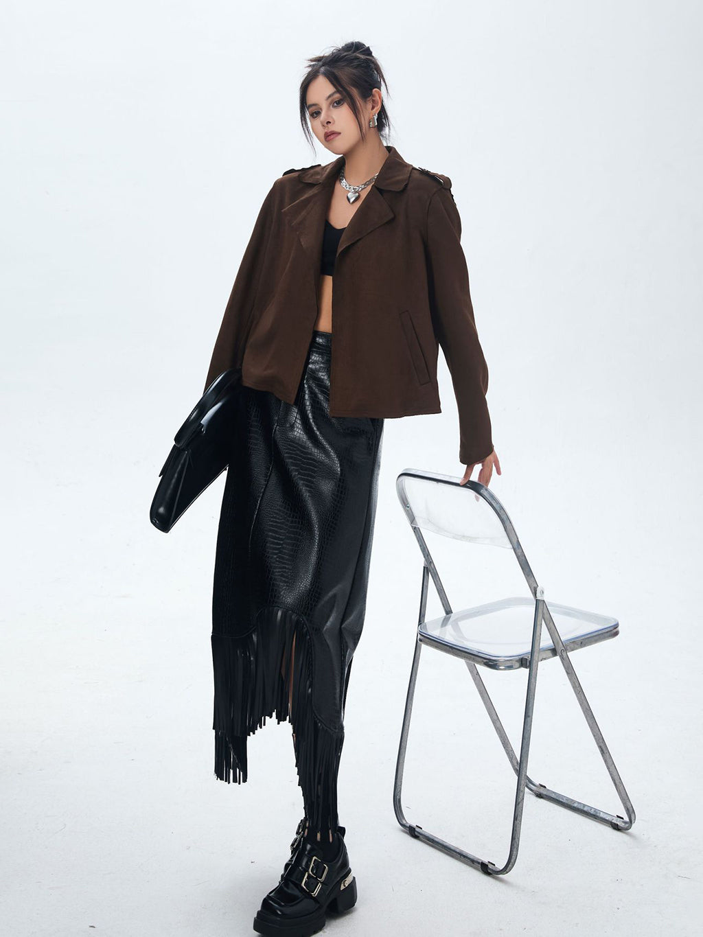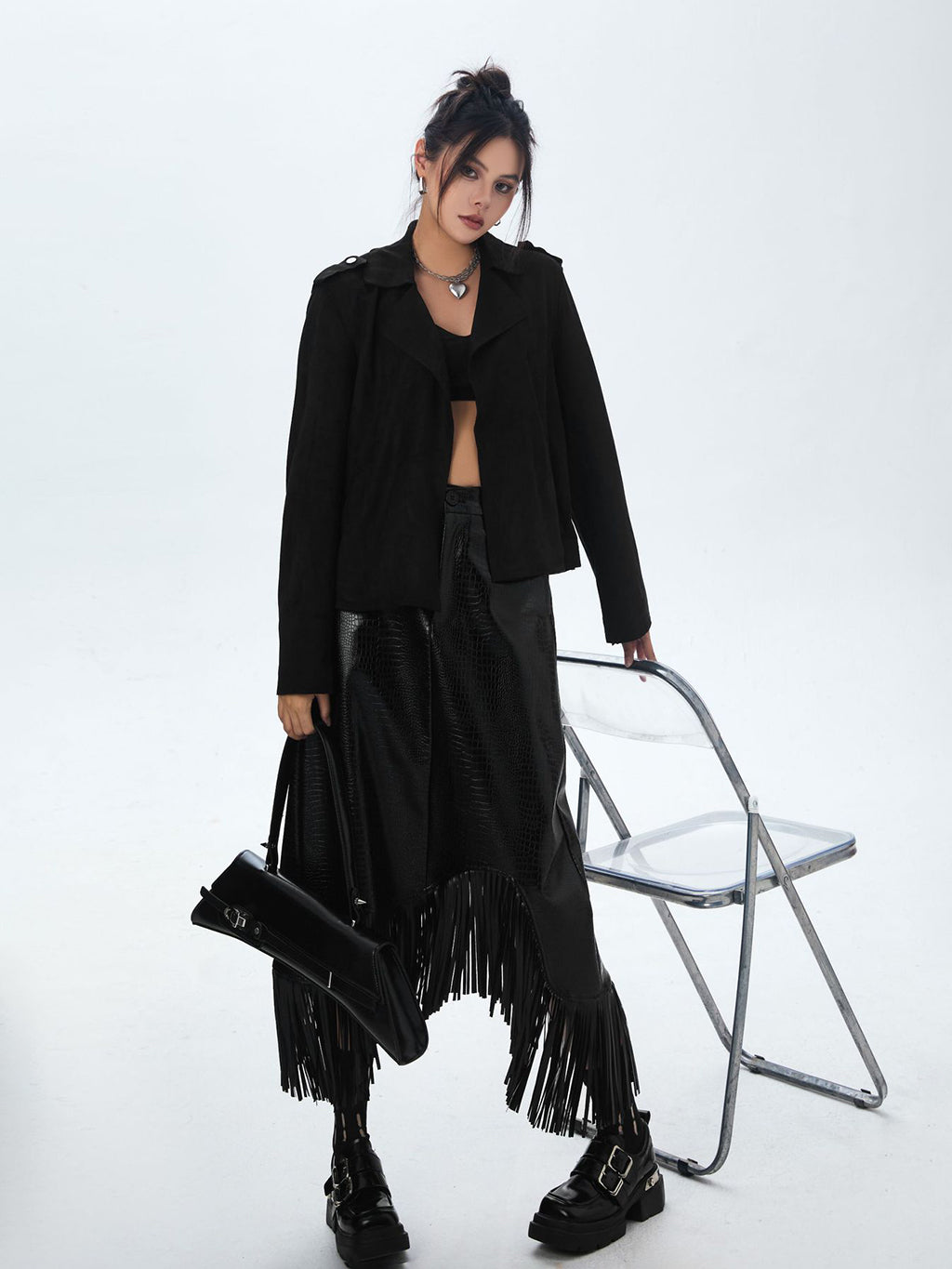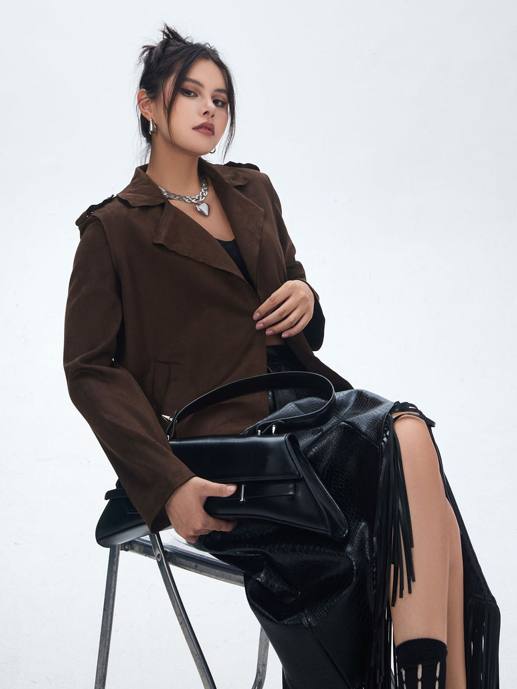 マットでしっとりとした質感の素材を使用し、洗練された佇まいを演出するショート丈ジャケット。肩のエポーレットがさりげないアクセントを添える。フロントはすっきりとした比翼風デザインで、無駄のないミニマルな印象に仕上げられている。軽やかな着心地で、シーズンを問わず幅広いスタイリングに取り入れやすい一着。