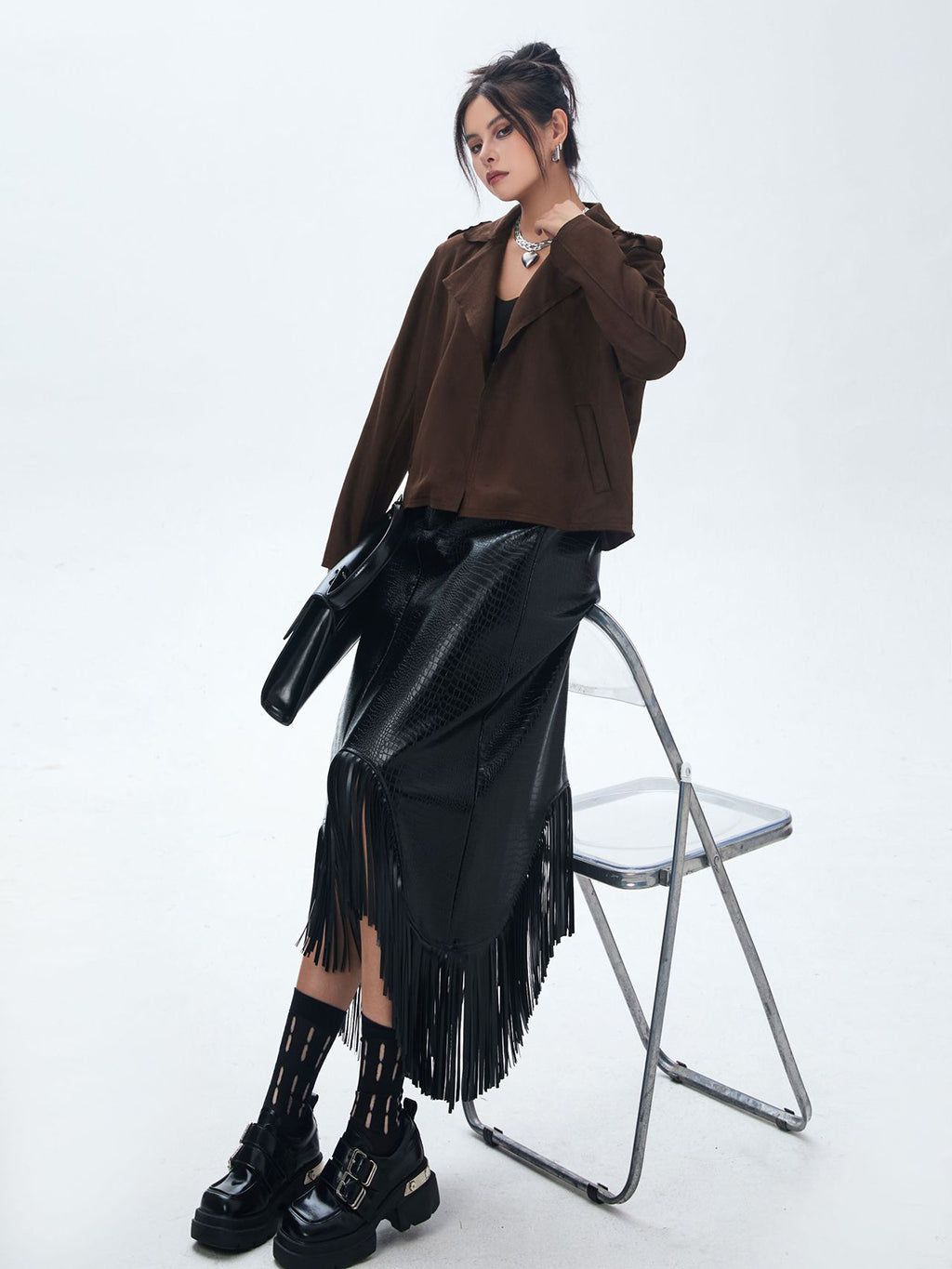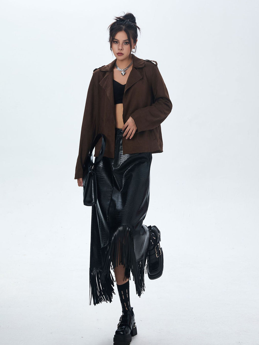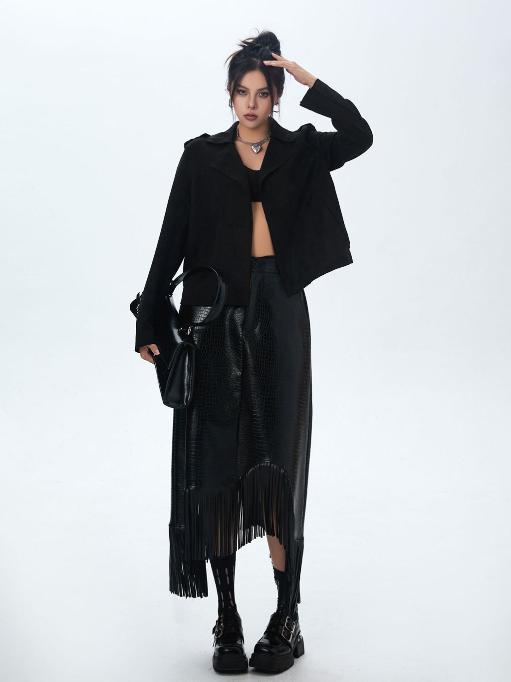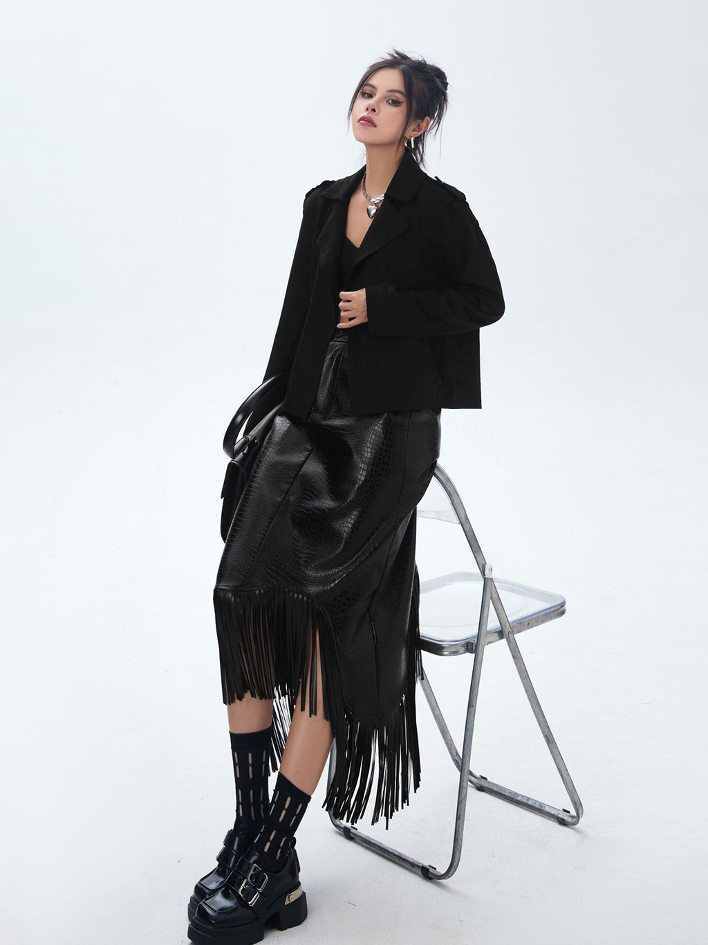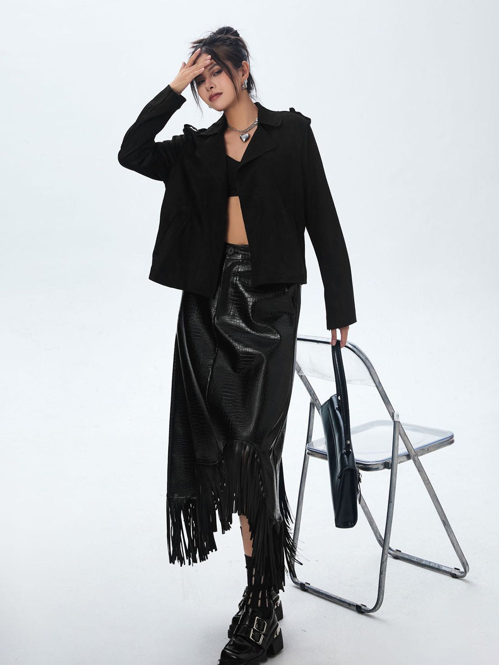 マットでしっとりとした質感の素材を使用し、洗練された佇まいを演出するショート丈ジャケット。肩のエポーレットがさりげないアクセントを添える。フロントはすっきりとした比翼風デザインで、無駄のないミニマルな印象に仕上げられている。軽やかな着心地で、シーズンを問わず幅広いスタイリングに取り入れやすい一着。