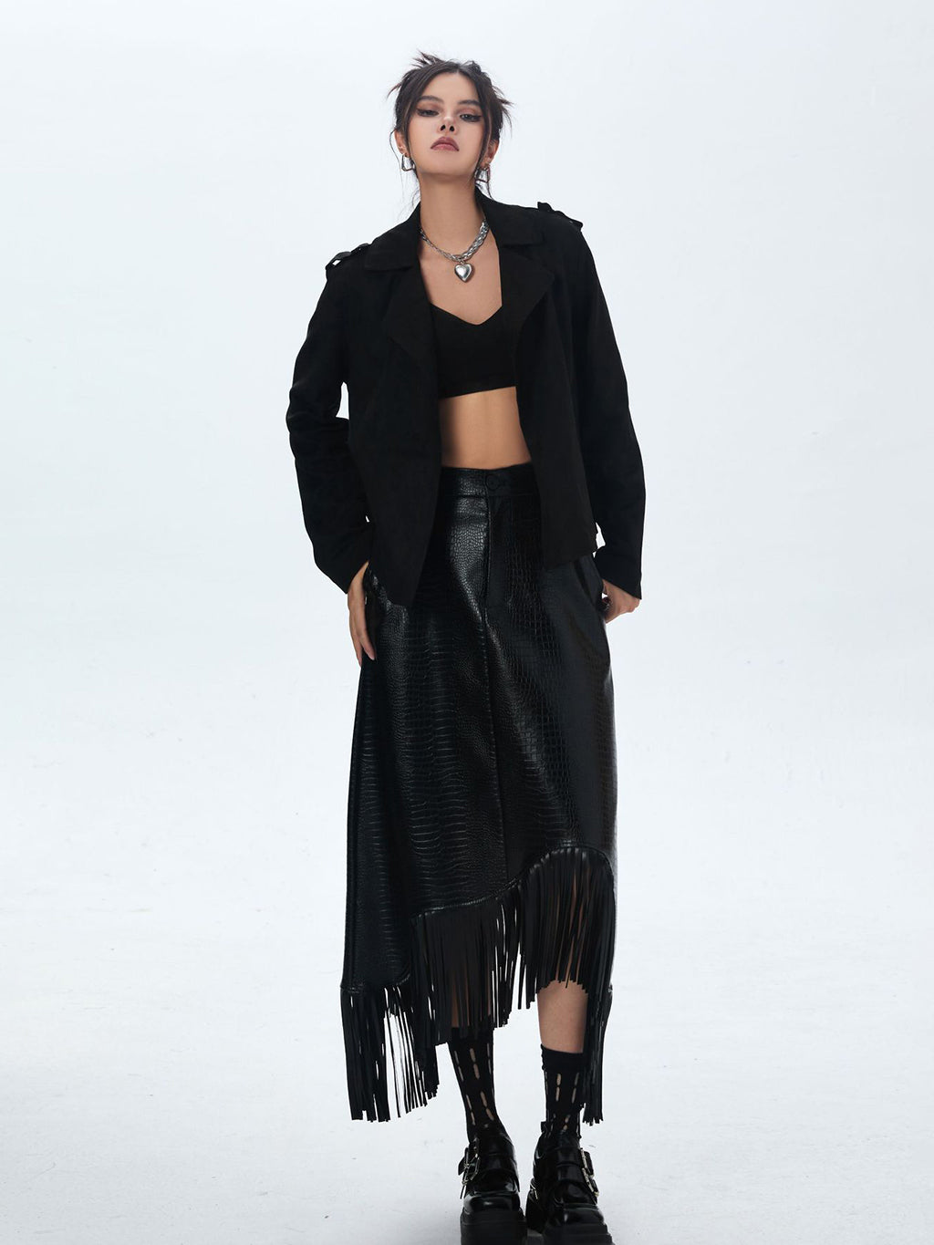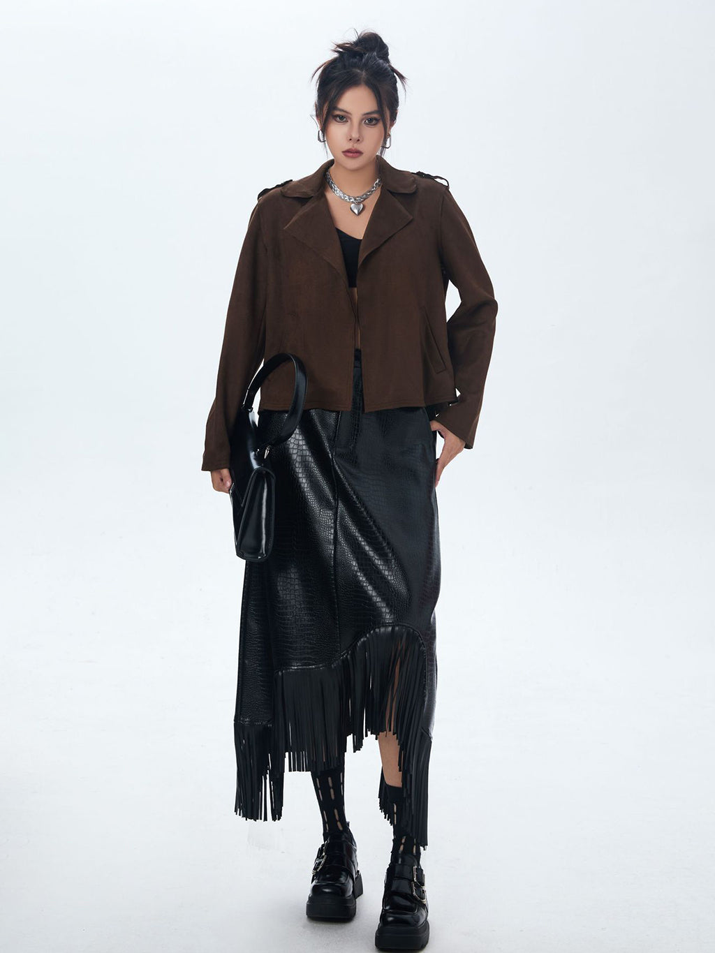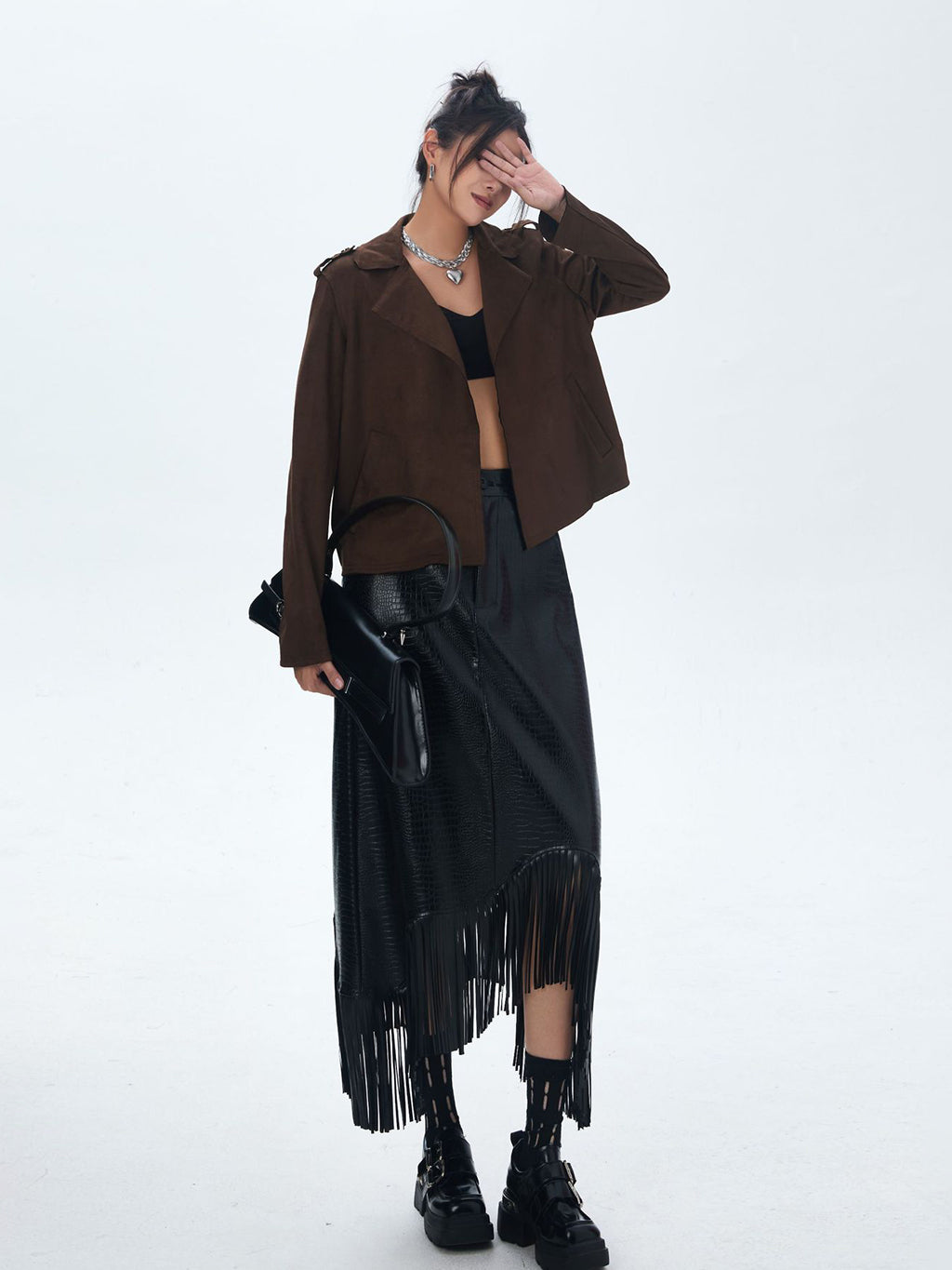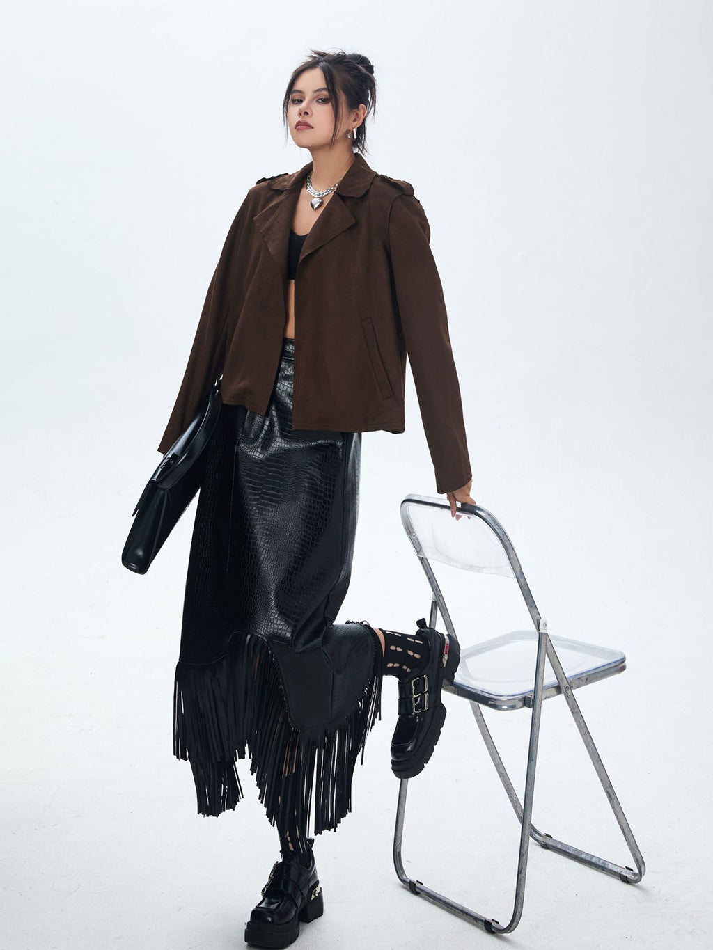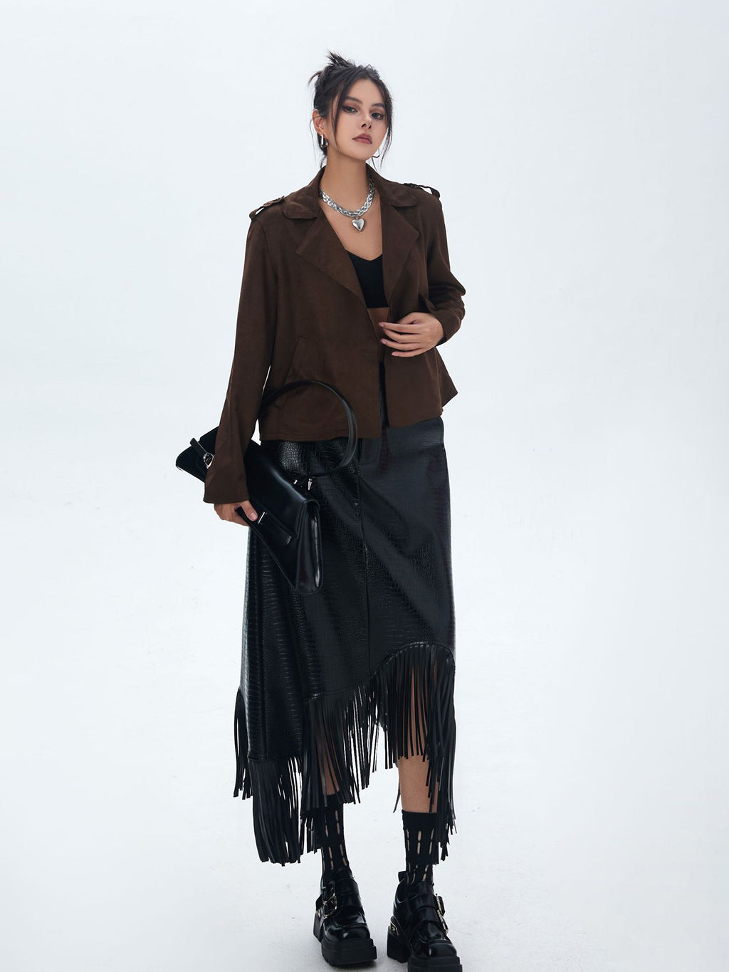 マットでしっとりとした質感の素材を使用し、洗練された佇まいを演出するショート丈ジャケット。肩のエポーレットがさりげないアクセントを添える。フロントはすっきりとした比翼風デザインで、無駄のないミニマルな印象に仕上げられている。軽やかな着心地で、シーズンを問わず幅広いスタイリングに取り入れやすい一着。