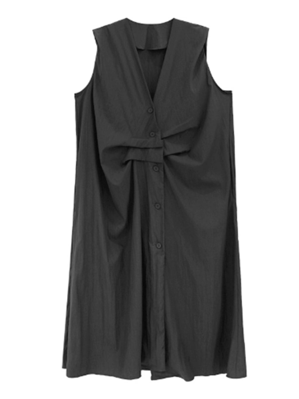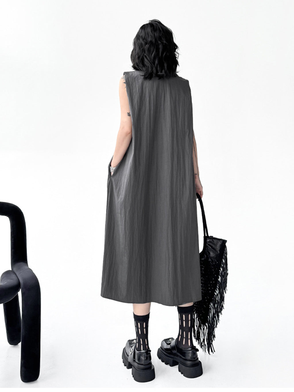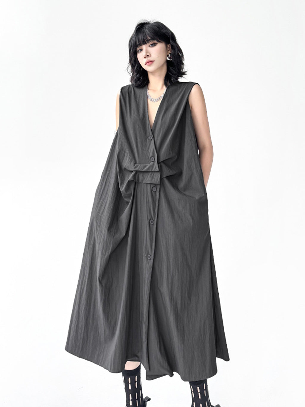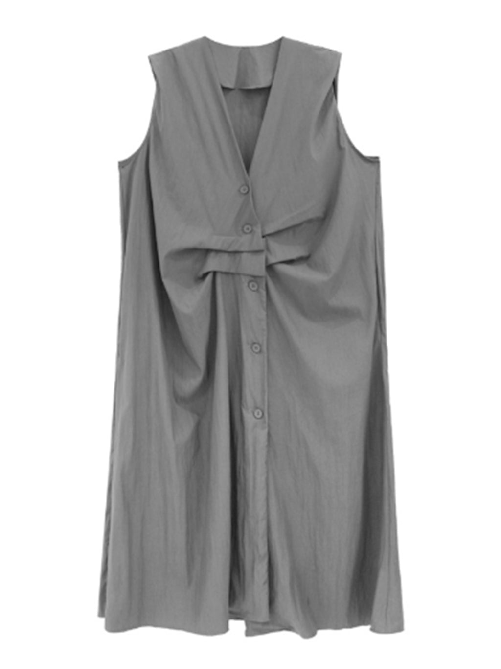 ミニマルなフロントボタンと立体的なタックで構成されたノースリーブドレス。ナチュラルなシワ感のある軽やかな素材を使用し、身体のラインを拾わずに柔らかく広がるシルエットを演出。深めのVネックとタックの陰影が奥行きを加え、シンプルながらも印象に残る佇まいに。サイドポケット付きで機能性もあり、カジュアルからシックなスタイルまで幅広く対応。