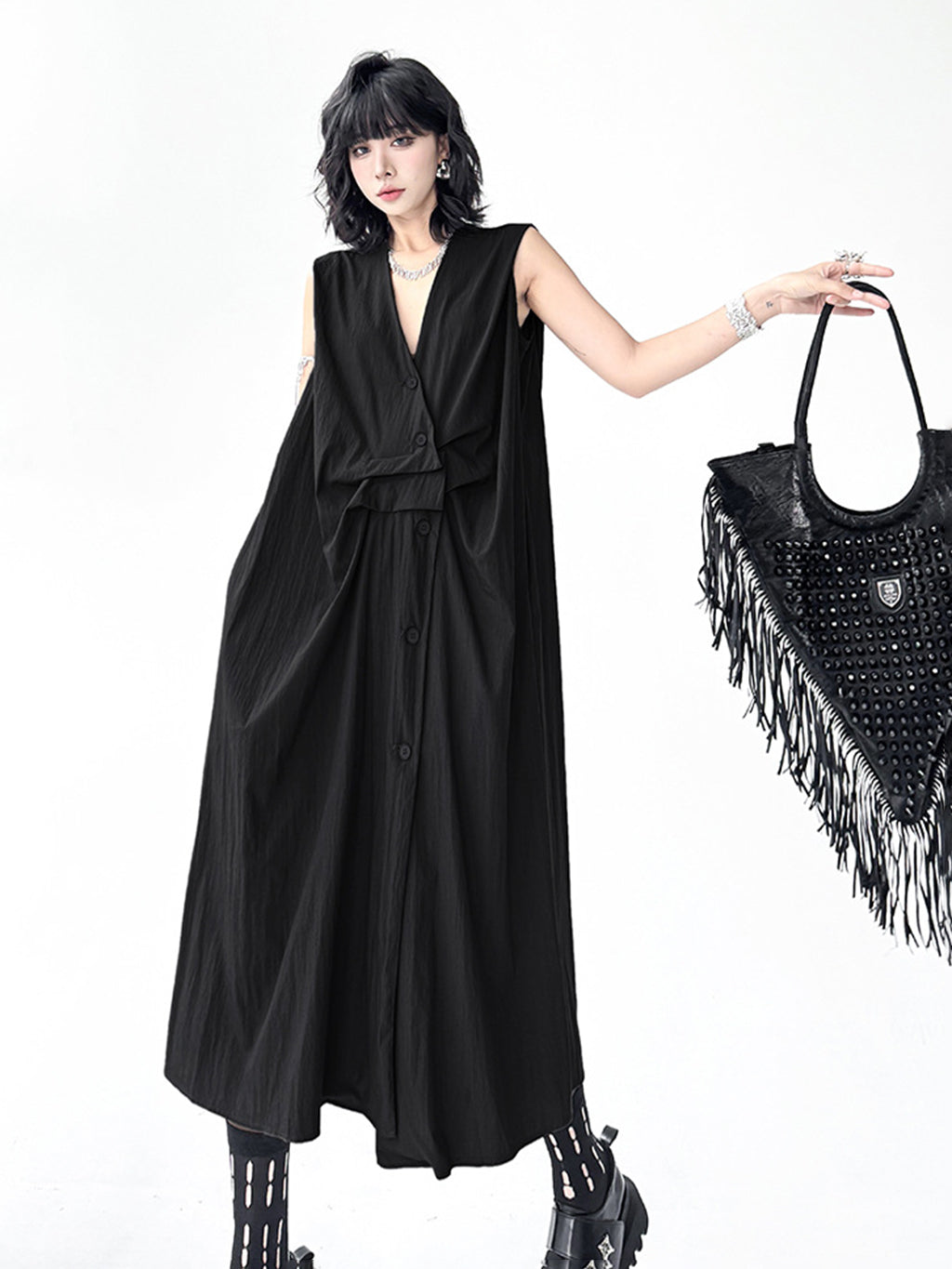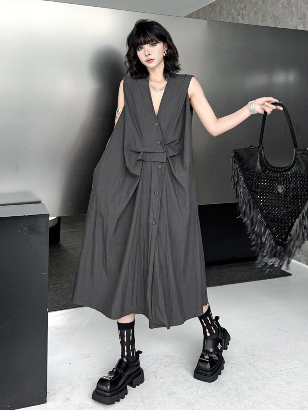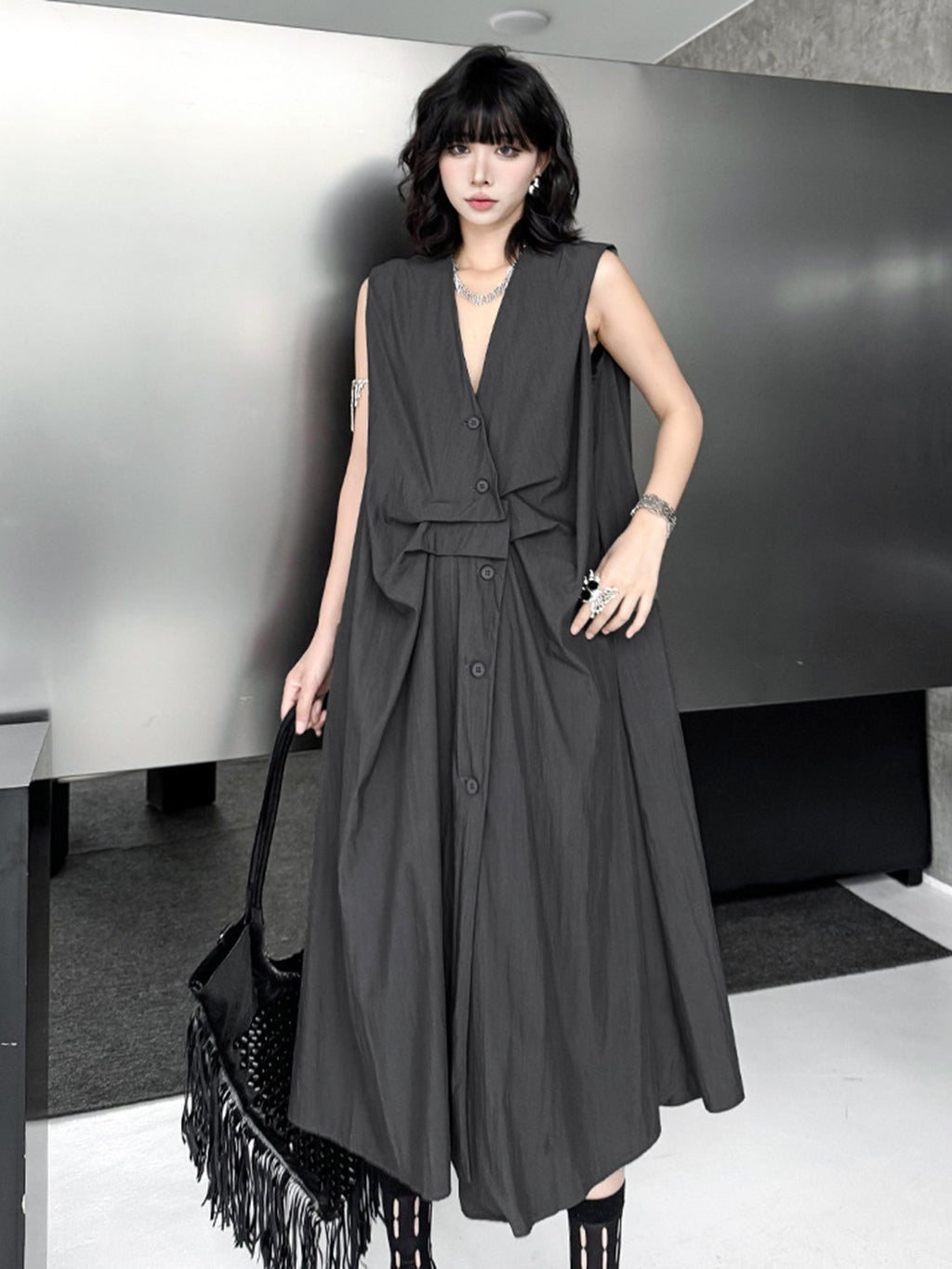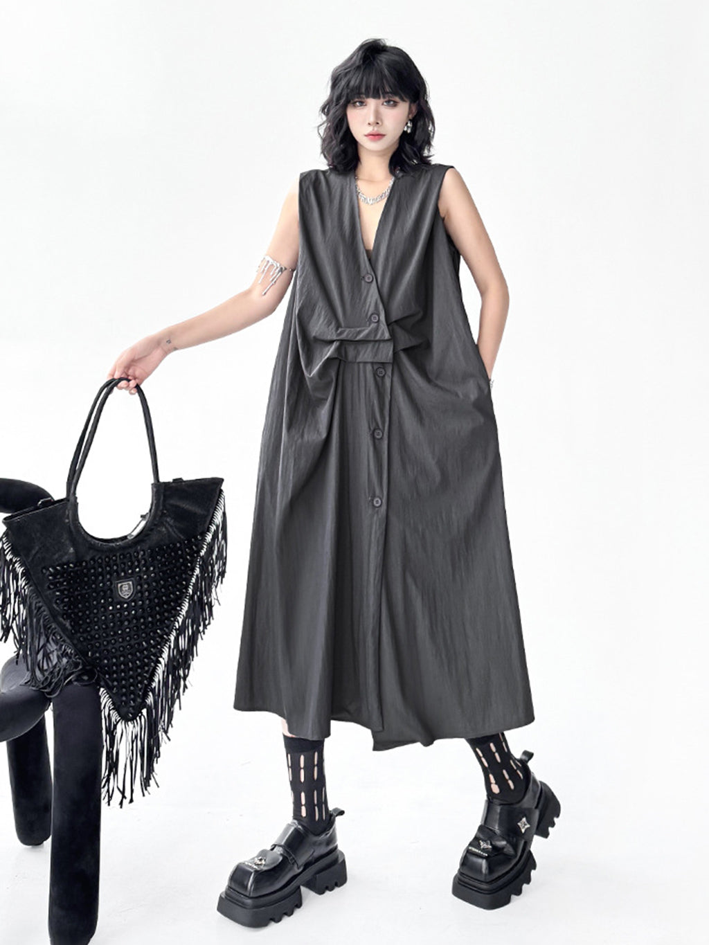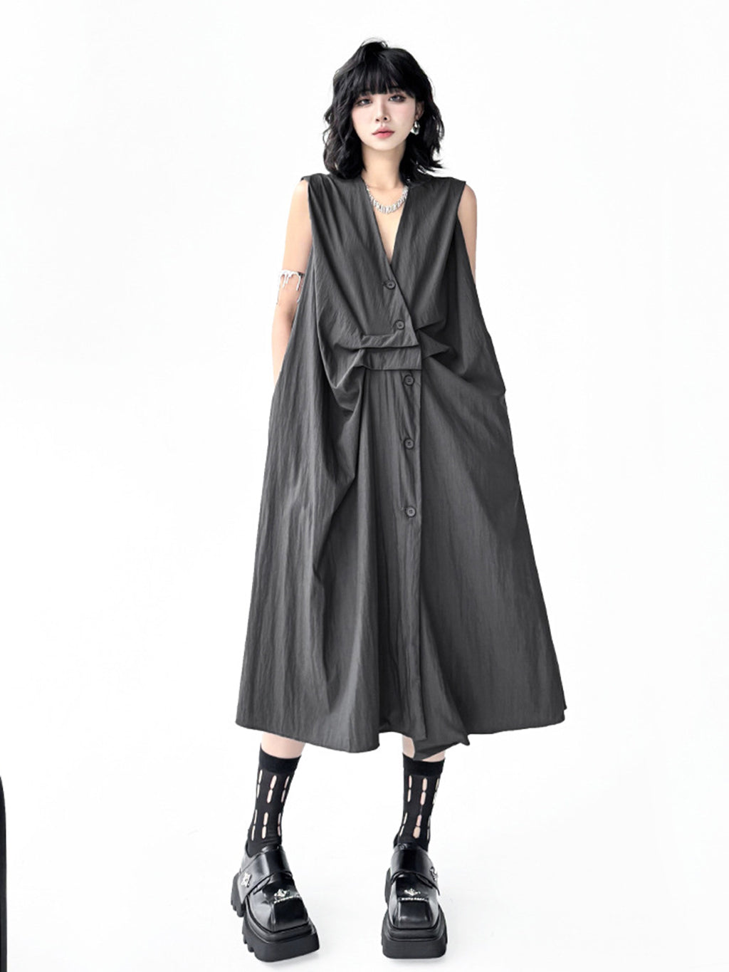 ミニマルなフロントボタンと立体的なタックで構成されたノースリーブドレス。ナチュラルなシワ感のある軽やかな素材を使用し、身体のラインを拾わずに柔らかく広がるシルエットを演出。深めのVネックとタックの陰影が奥行きを加え、シンプルながらも印象に残る佇まいに。サイドポケット付きで機能性もあり、カジュアルからシックなスタイルまで幅広く対応。
