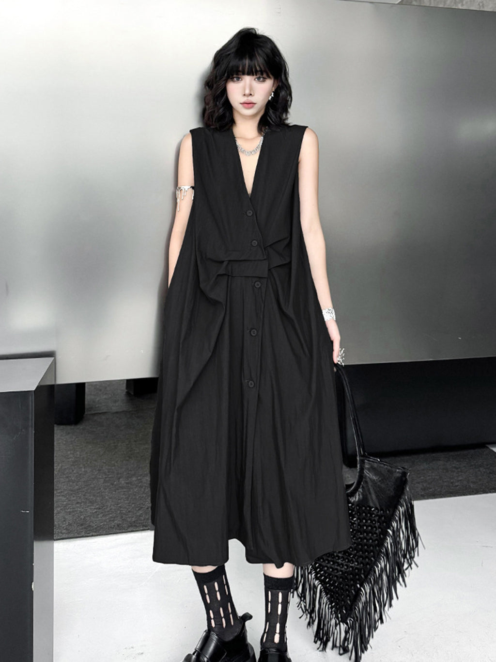 ミニマルなフロントボタンと立体的なタックで構成されたノースリーブドレス。ナチュラルなシワ感のある軽やかな素材を使用し、身体のラインを拾わずに柔らかく広がるシルエットを演出。深めのVネックとタックの陰影が奥行きを加え、シンプルながらも印象に残る佇まいに。サイドポケット付きで機能性もあり、カジュアルからシックなスタイルまで幅広く対応。