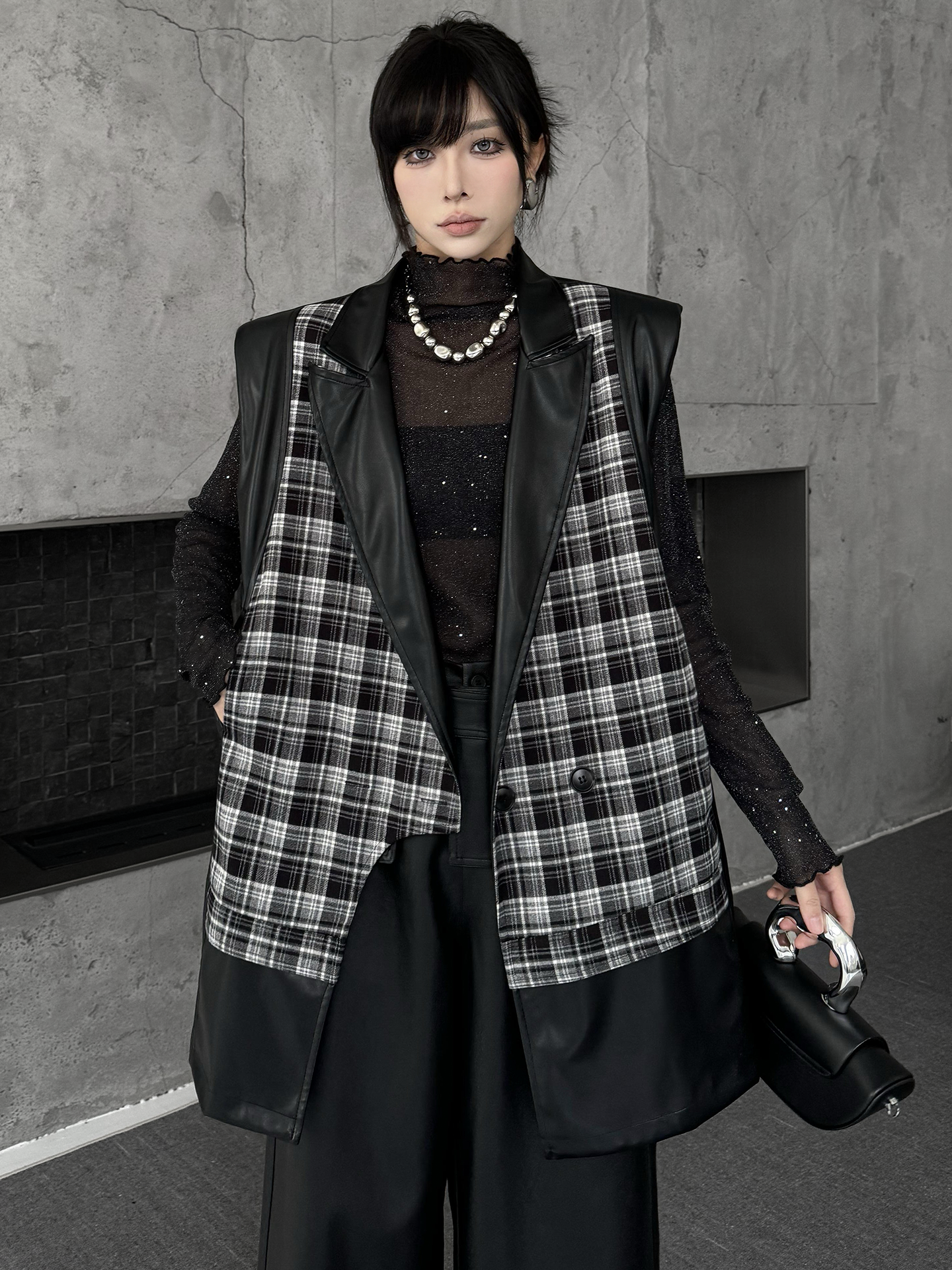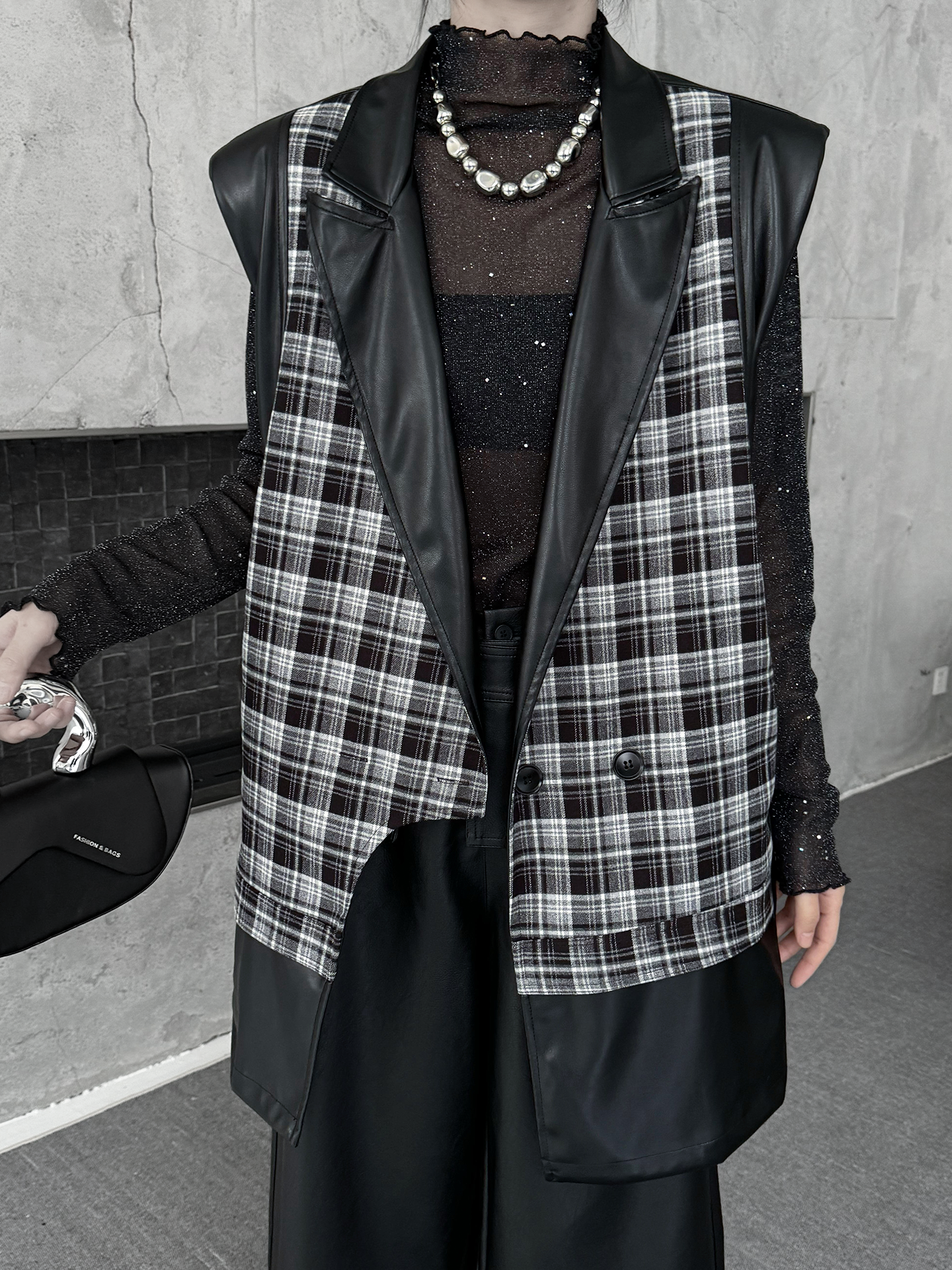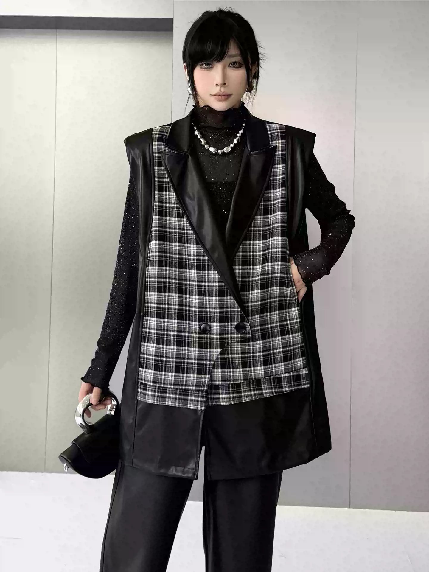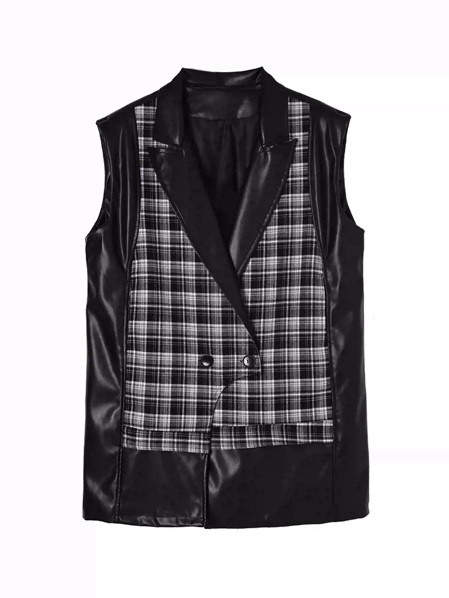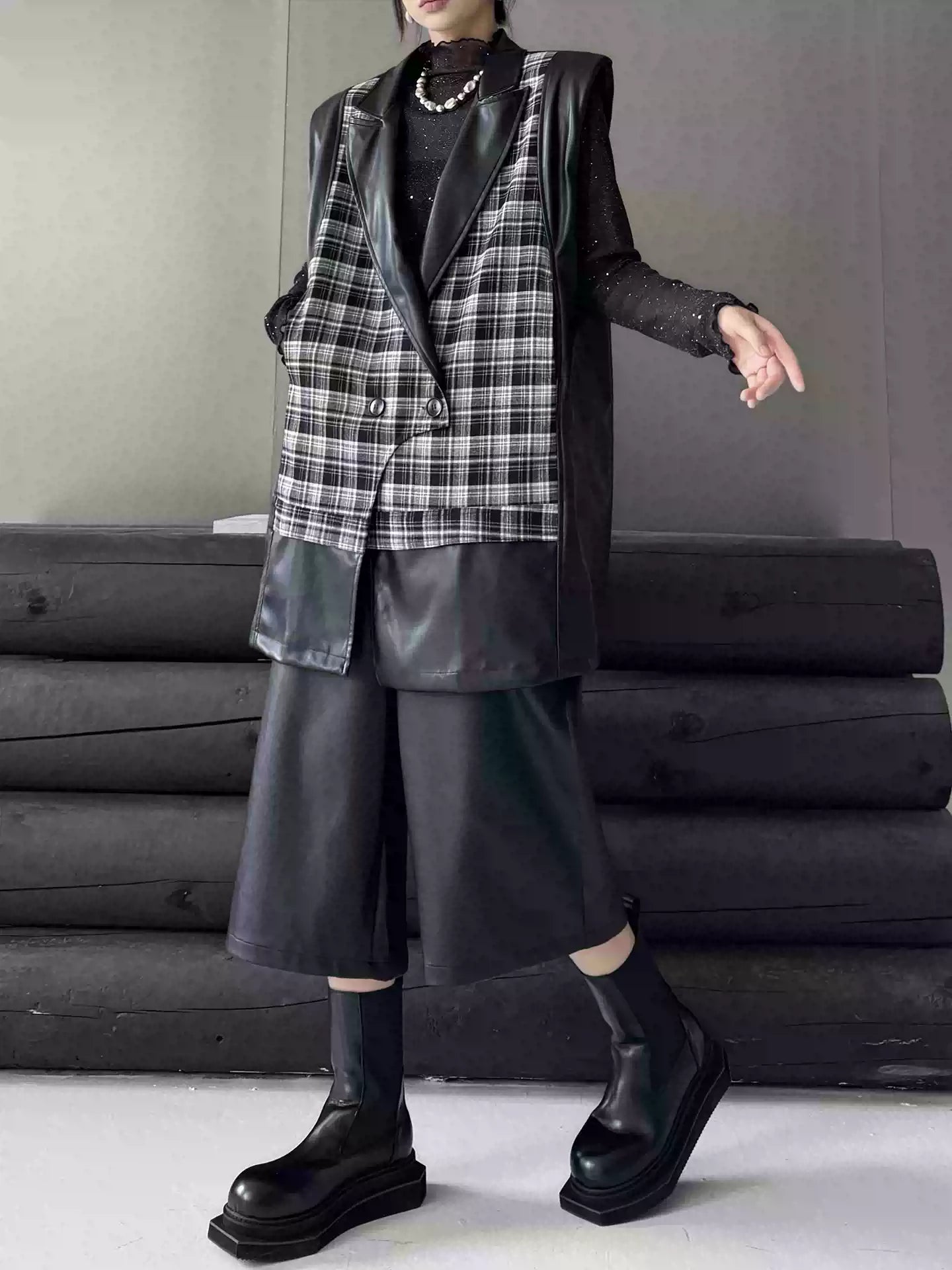 クラシカルなチェック柄と光沢感のある合成素材を組み合わせた構築的なベストジャケット。ラペル付きのフロントはダブルボタン仕様で、きちんと感を備えつつ遊び心あるカッティングで変化を加えている。バックスタイルはすべてPU生地で仕立て、視覚的なコントラストと光の反射による艶感が際立つ。肩周りにボリュームを持たせたシルエットで、レイヤードでも単体でも映える存在感。