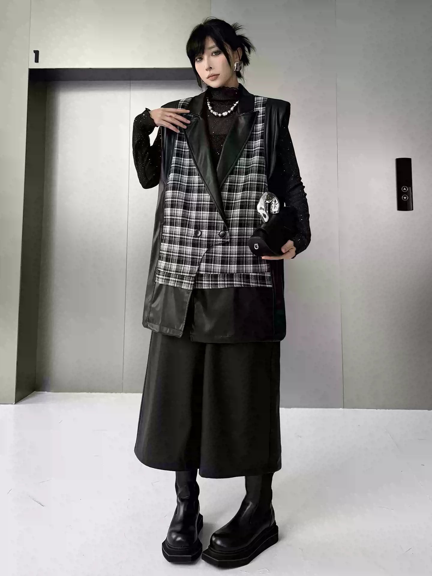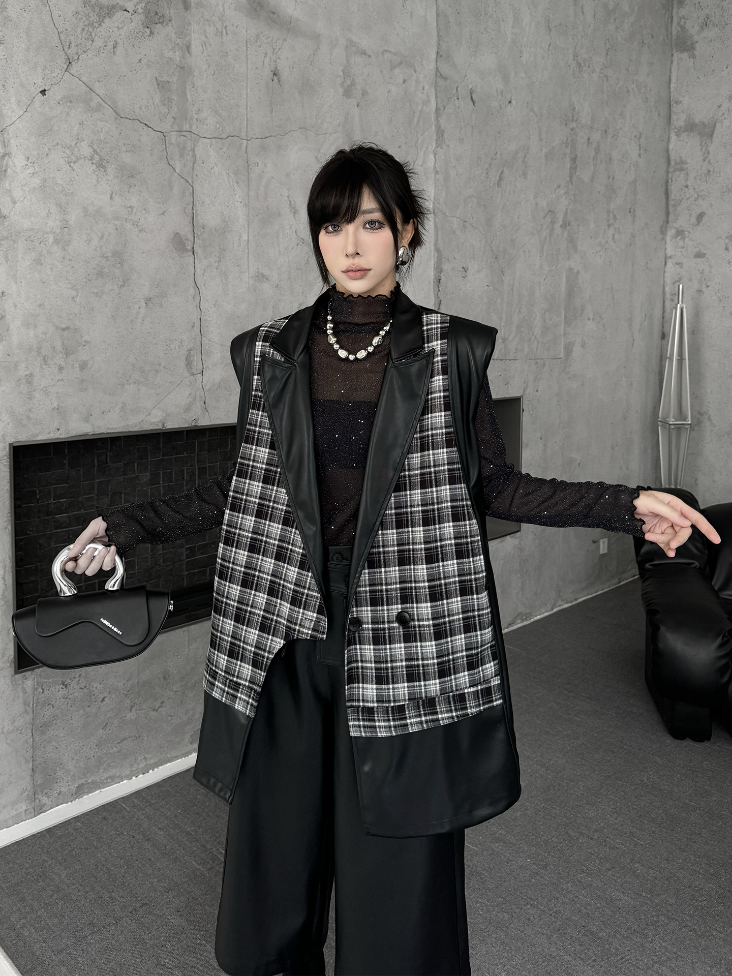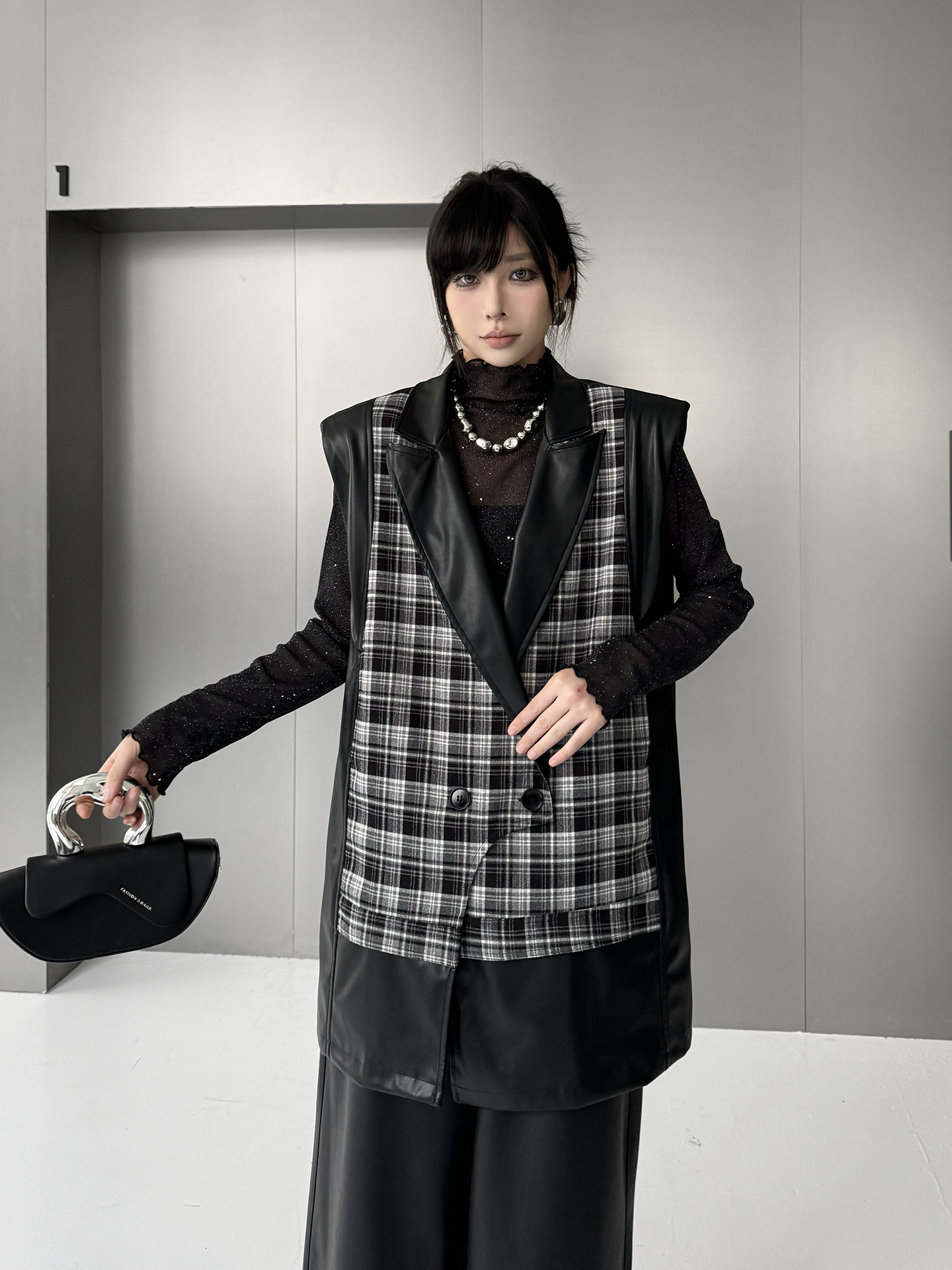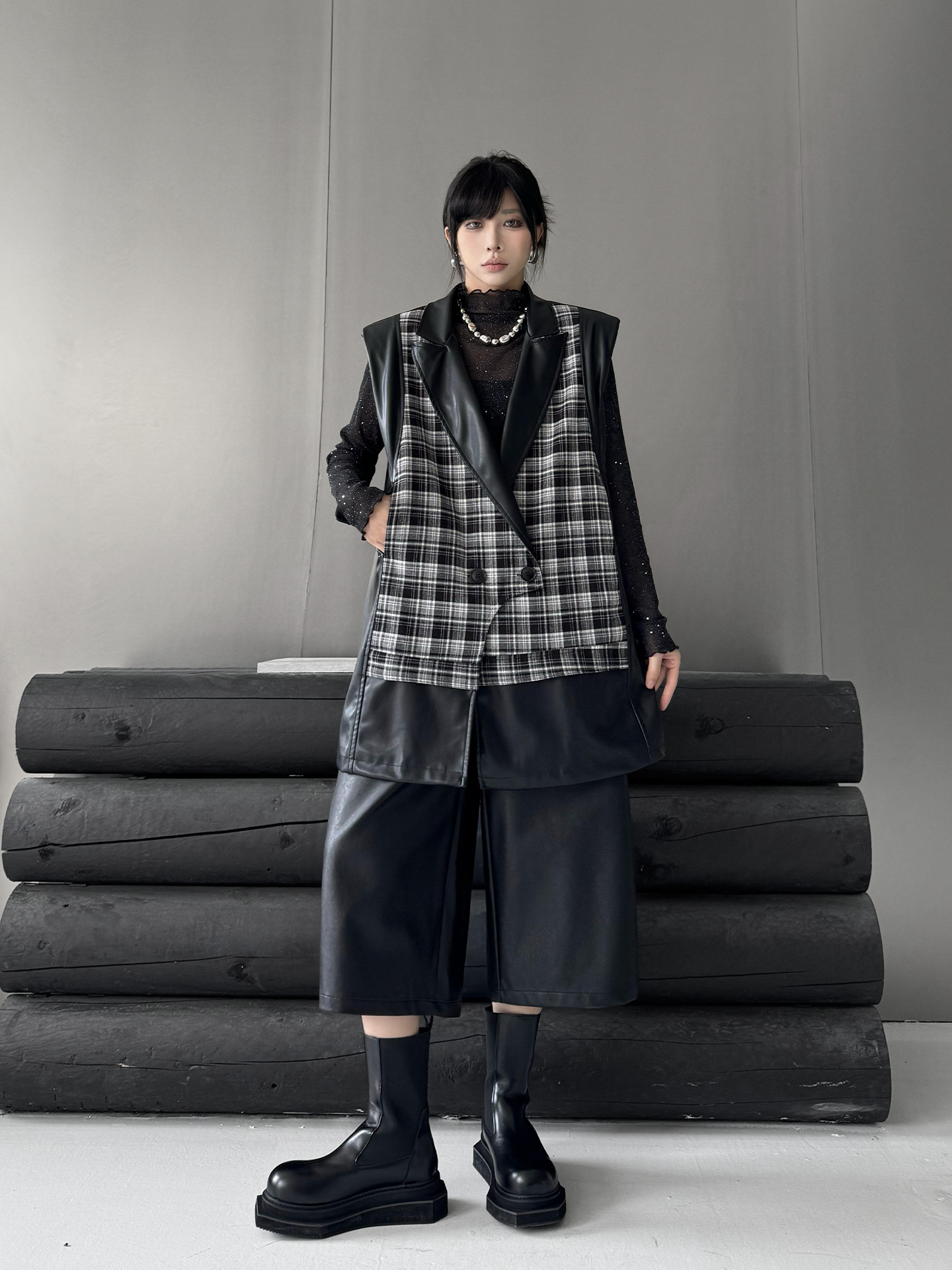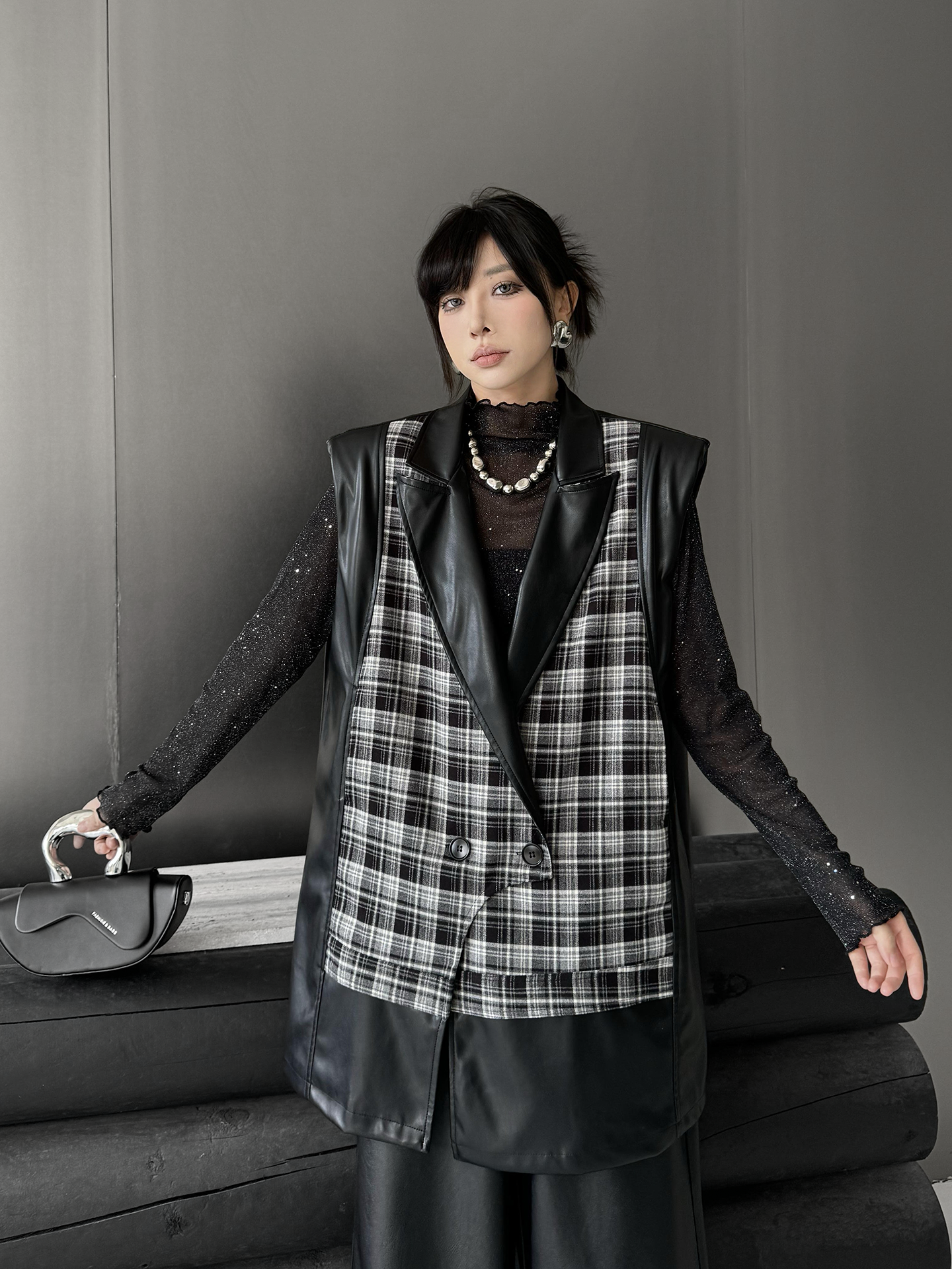 クラシカルなチェック柄と光沢感のある合成素材を組み合わせた構築的なベストジャケット。ラペル付きのフロントはダブルボタン仕様で、きちんと感を備えつつ遊び心あるカッティングで変化を加えている。バックスタイルはすべてPU生地で仕立て、視覚的なコントラストと光の反射による艶感が際立つ。肩周りにボリュームを持たせたシルエットで、レイヤードでも単体でも映える存在感。
