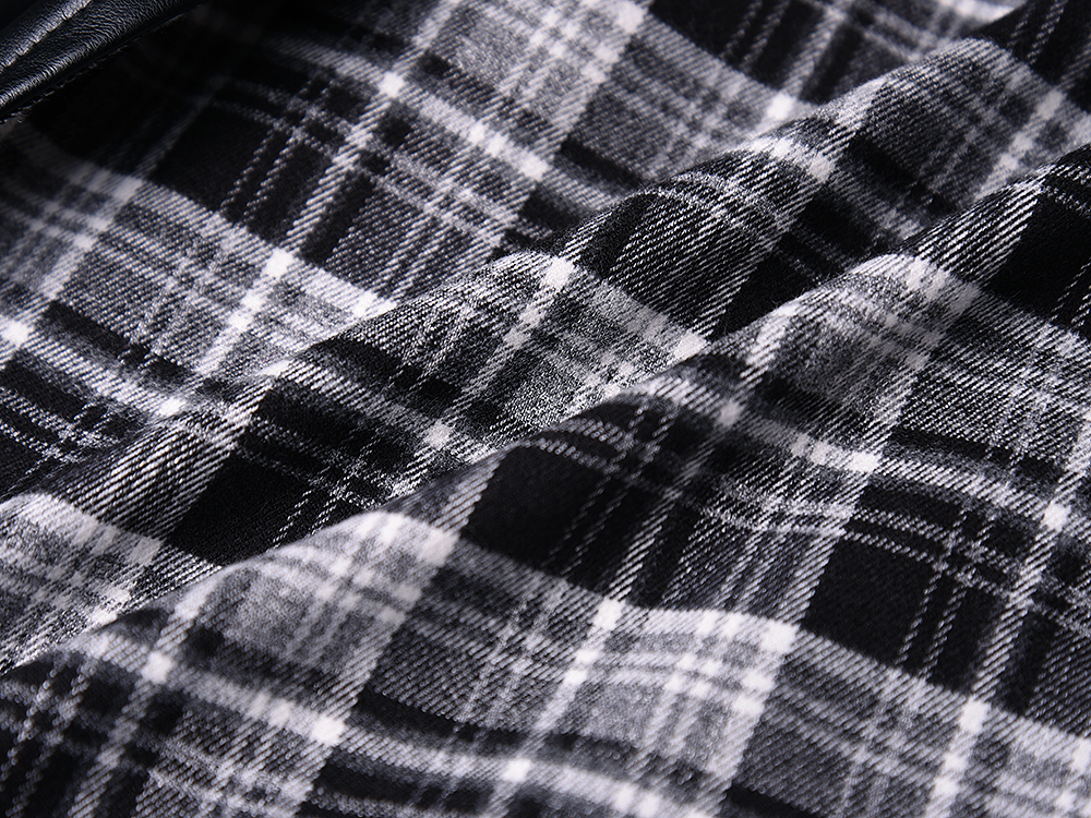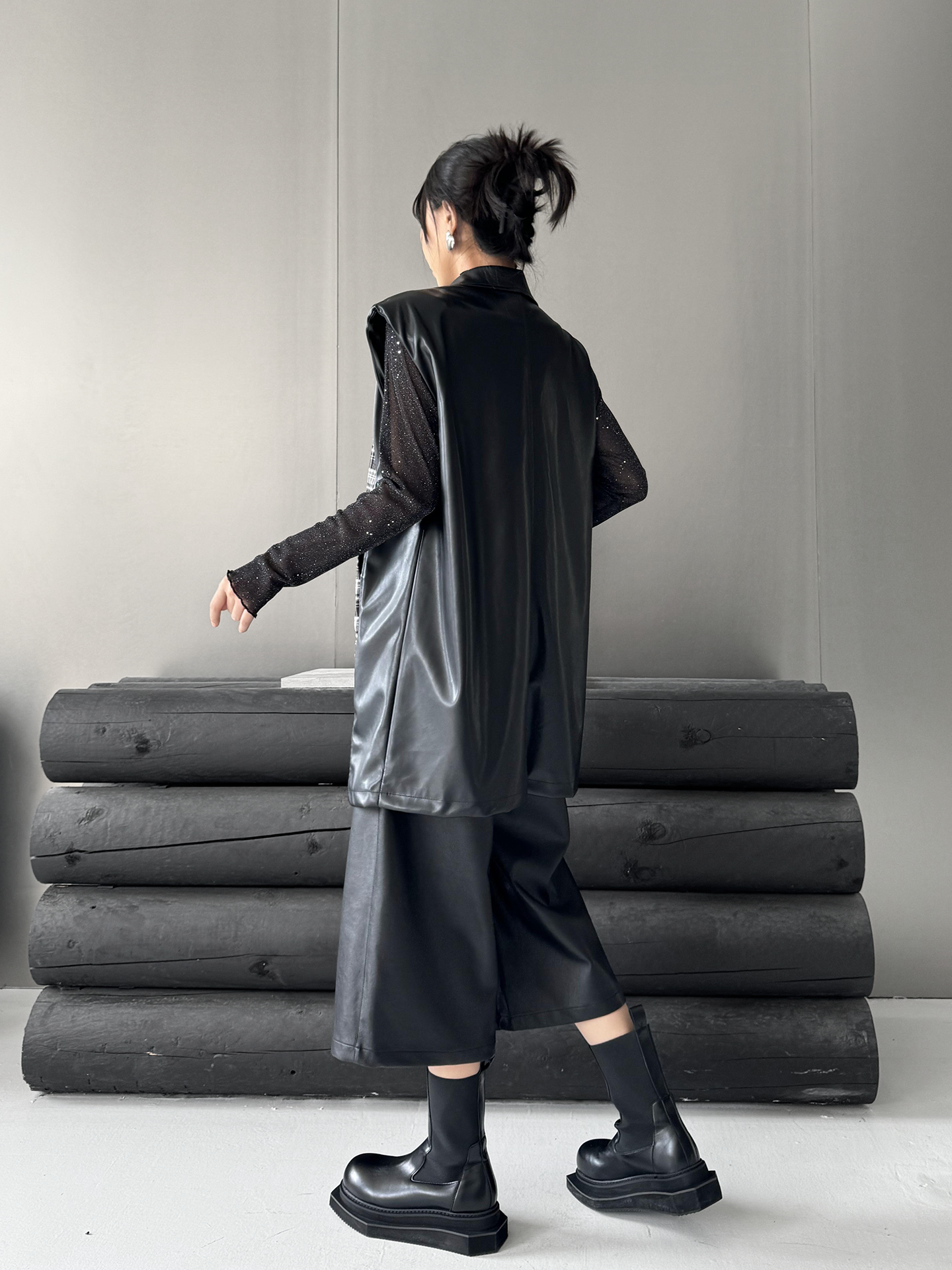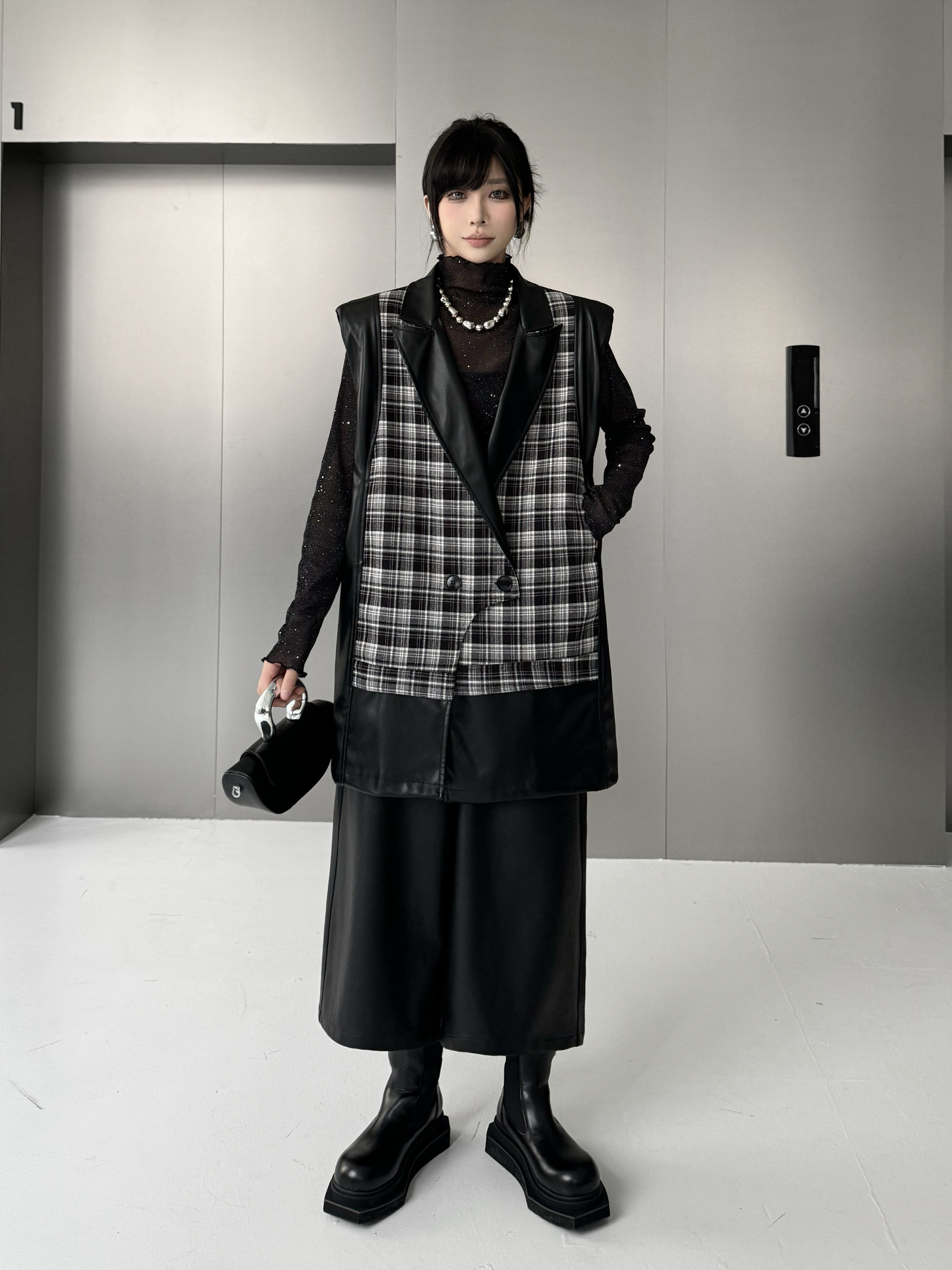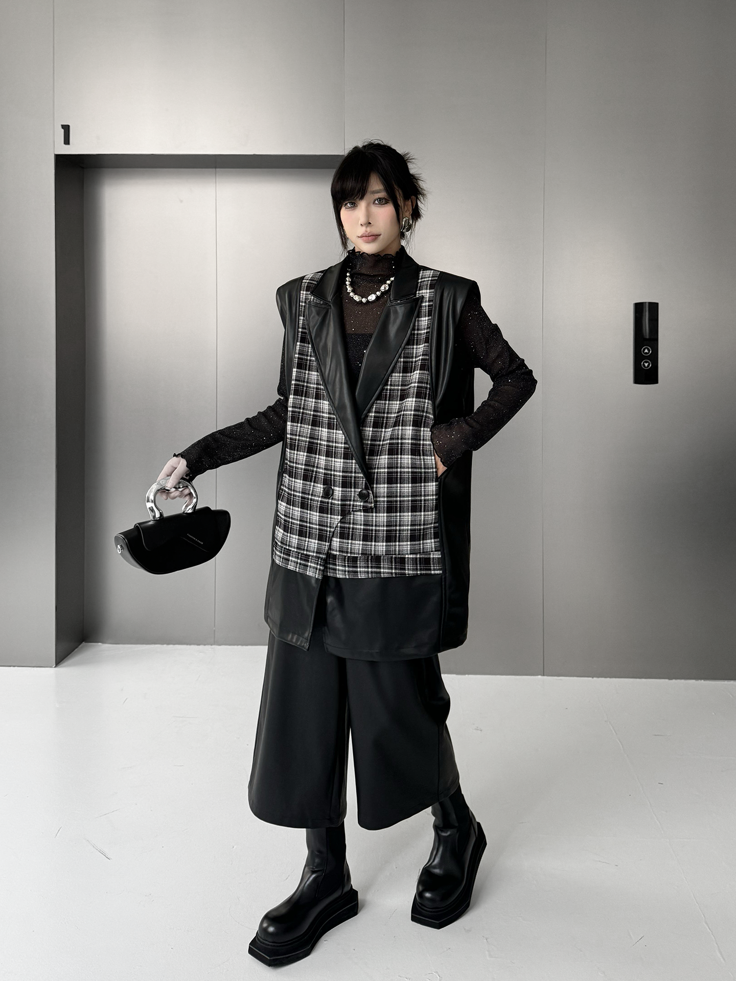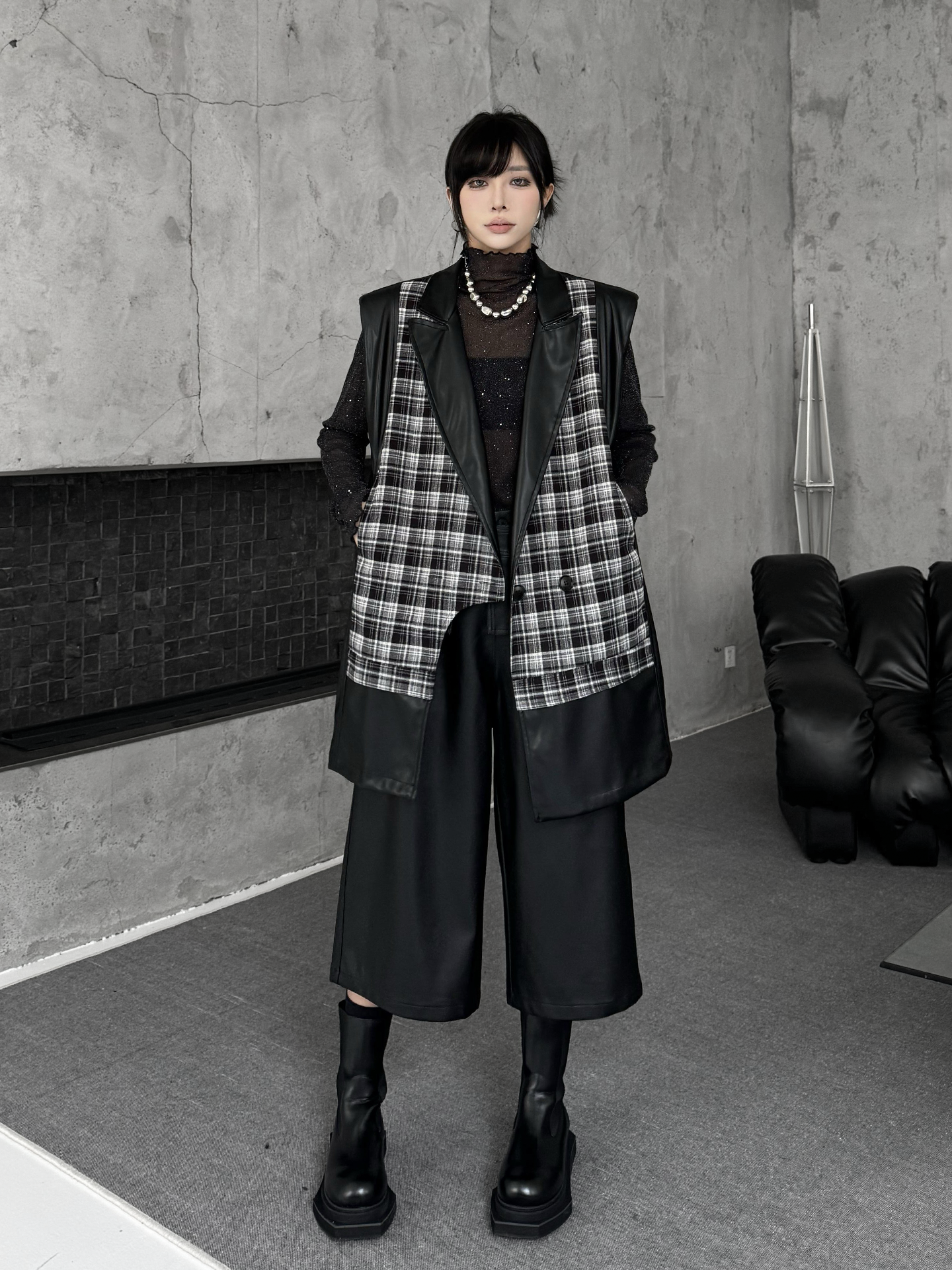 クラシカルなチェック柄と光沢感のある合成素材を組み合わせた構築的なベストジャケット。ラペル付きのフロントはダブルボタン仕様で、きちんと感を備えつつ遊び心あるカッティングで変化を加えている。バックスタイルはすべてPU生地で仕立て、視覚的なコントラストと光の反射による艶感が際立つ。肩周りにボリュームを持たせたシルエットで、レイヤードでも単体でも映える存在感。