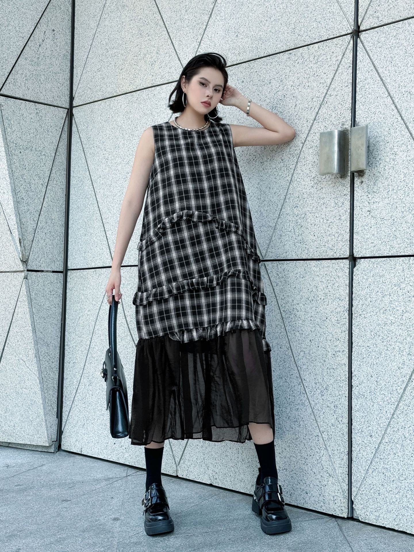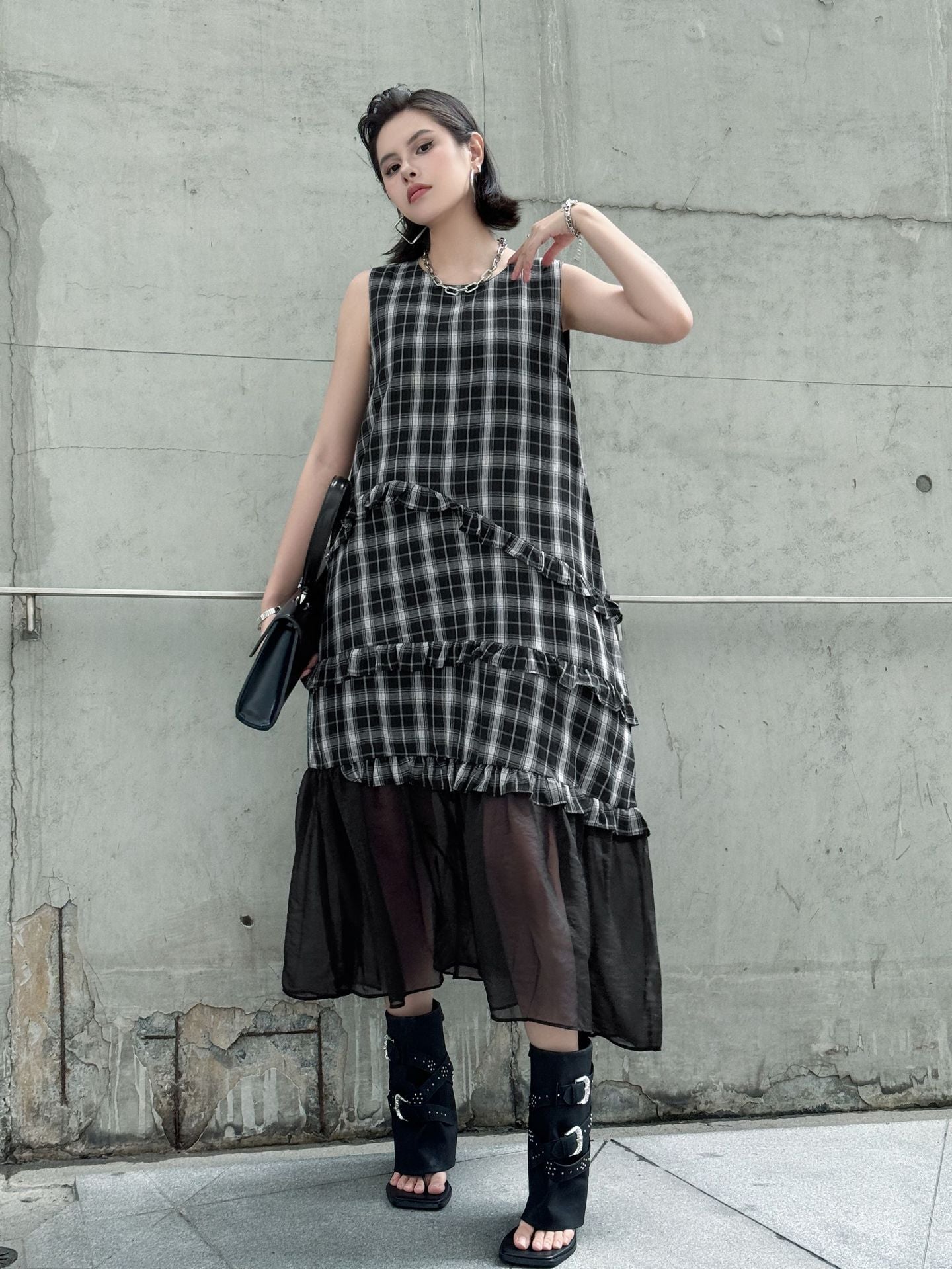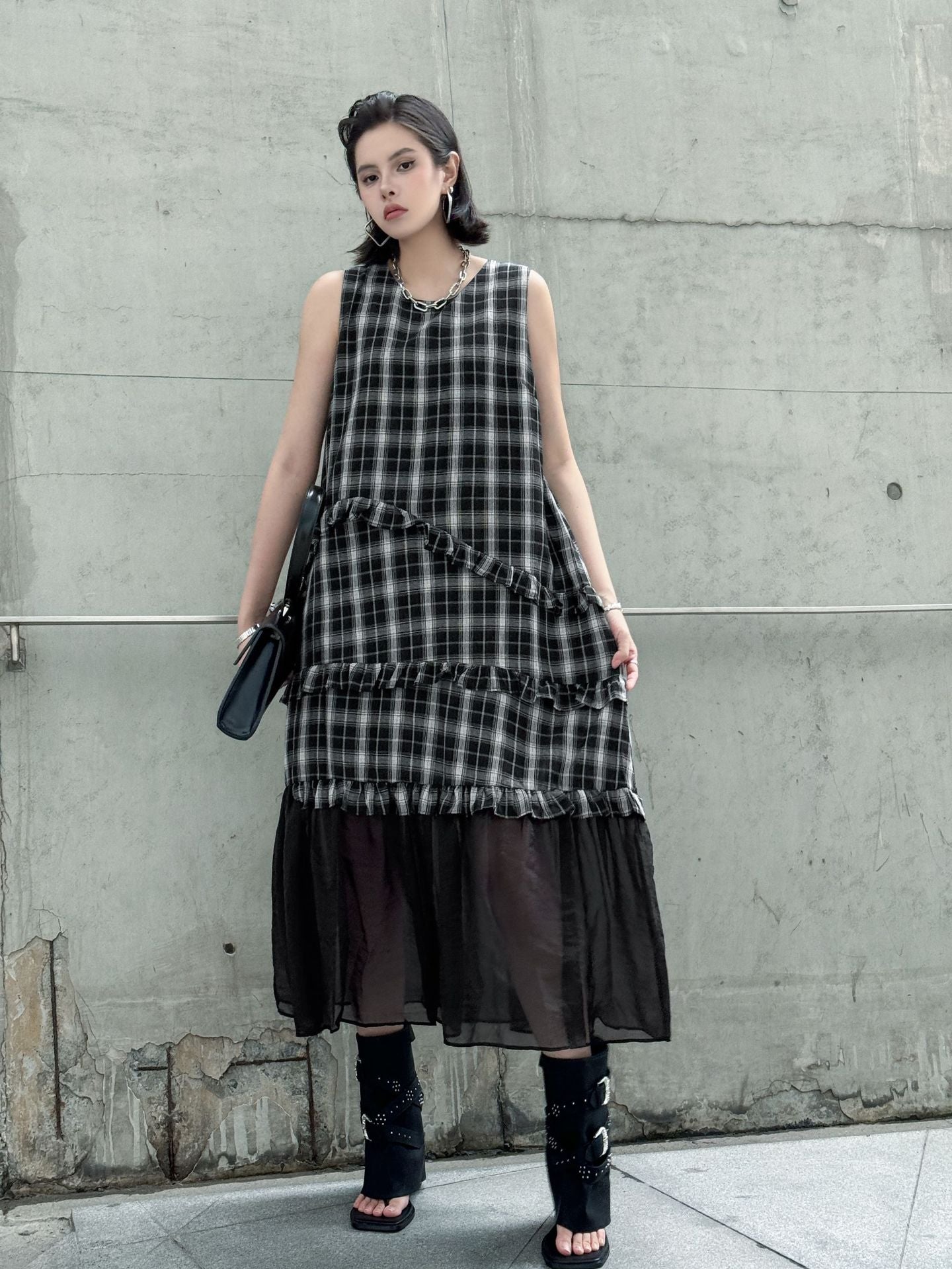 クラシカルなチェック柄と軽やかなブラックチュールを組み合わせたドッキングデザインが魅力。肩の落ちたノースリーブシルエットとストンとしたシルエットで、ゆったりとした着心地を叶える。段差フリルの切り替えが動きに表情を与え、裾の透け感が軽やかさを演出。都会的なモード感を持ちながらも抜け感のある1着に仕上がっている。