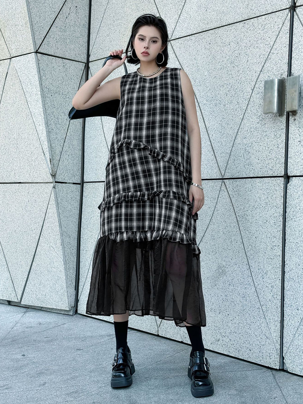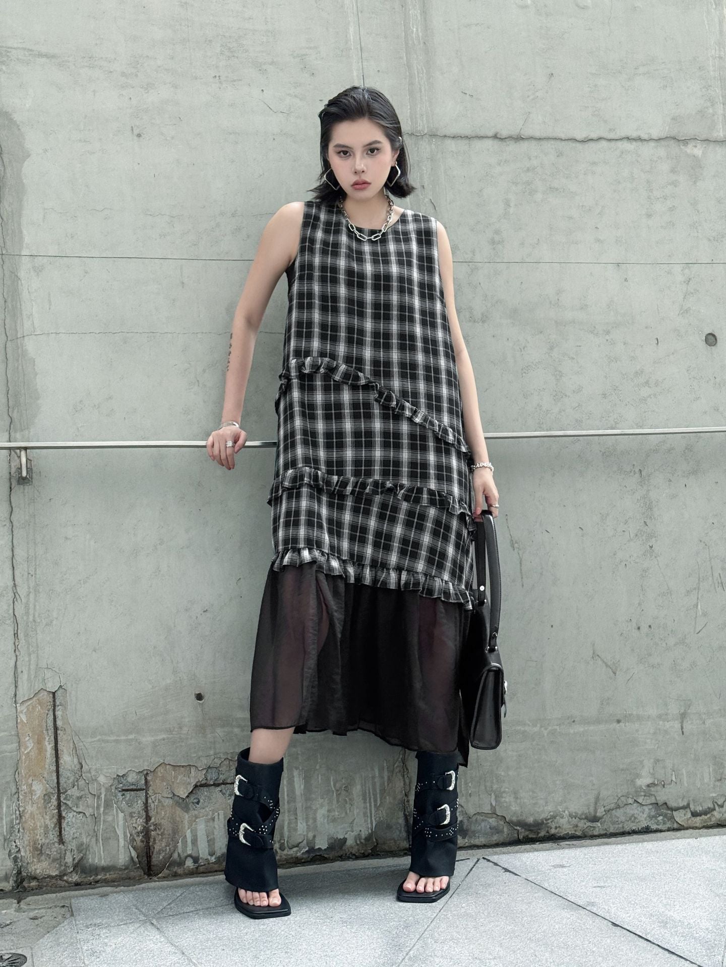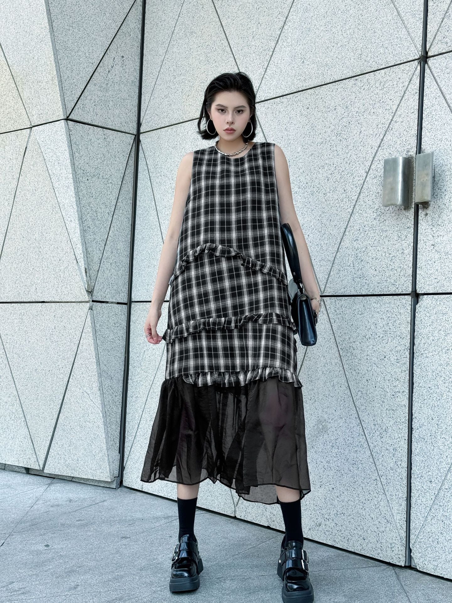 クラシカルなチェック柄と軽やかなブラックチュールを組み合わせたドッキングデザインが魅力。肩の落ちたノースリーブシルエットとストンとしたシルエットで、ゆったりとした着心地を叶える。段差フリルの切り替えが動きに表情を与え、裾の透け感が軽やかさを演出。都会的なモード感を持ちながらも抜け感のある1着に仕上がっている。