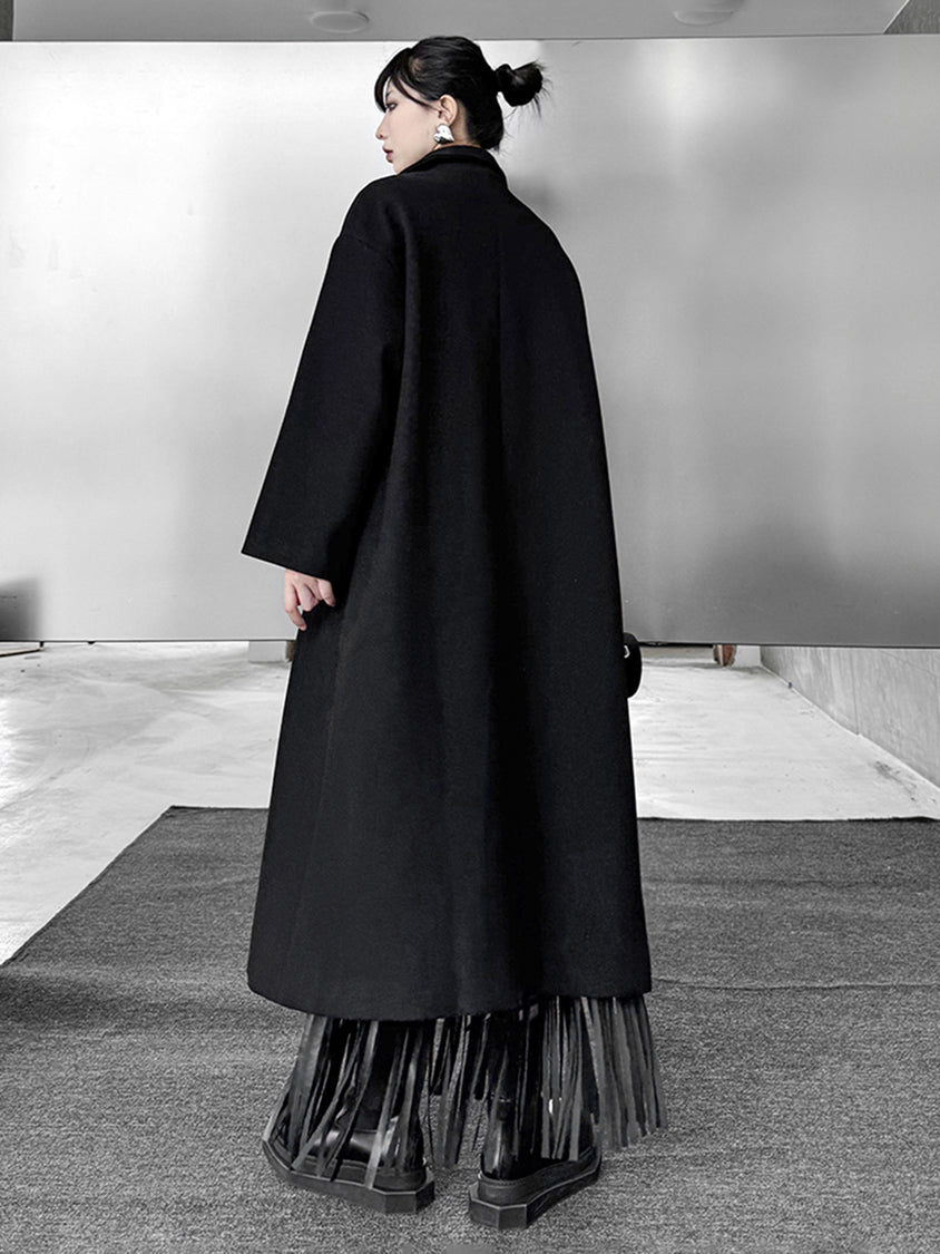 大胆な切り替えを前面に施し、色面の対比が立体感を引き出す構成。テーラードカラーが首元に影をつくり、シルエット全体に落ち着いた重心を与える。肩を深く落としたラインが余白を生み、動きに合わせて生地が流れるような表情を描く。ボタン位置は視線を縦へ導く配置とし、長い着丈と相まって伸びやかな印象へと繋がる。軽やかさと量感が同居したバランスで、内側に合わせる構成次第で表情が変化する。
