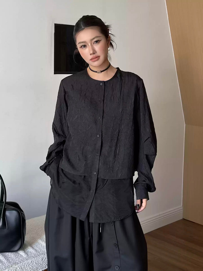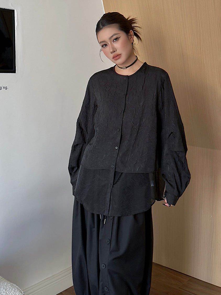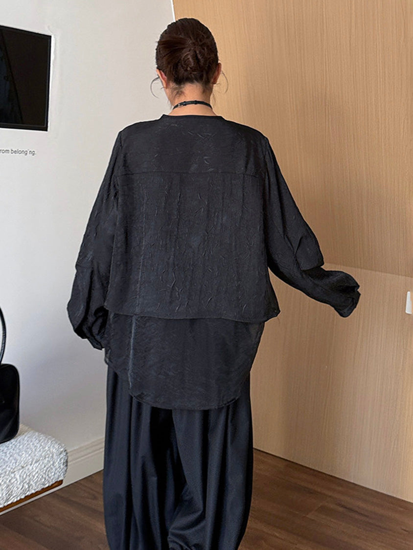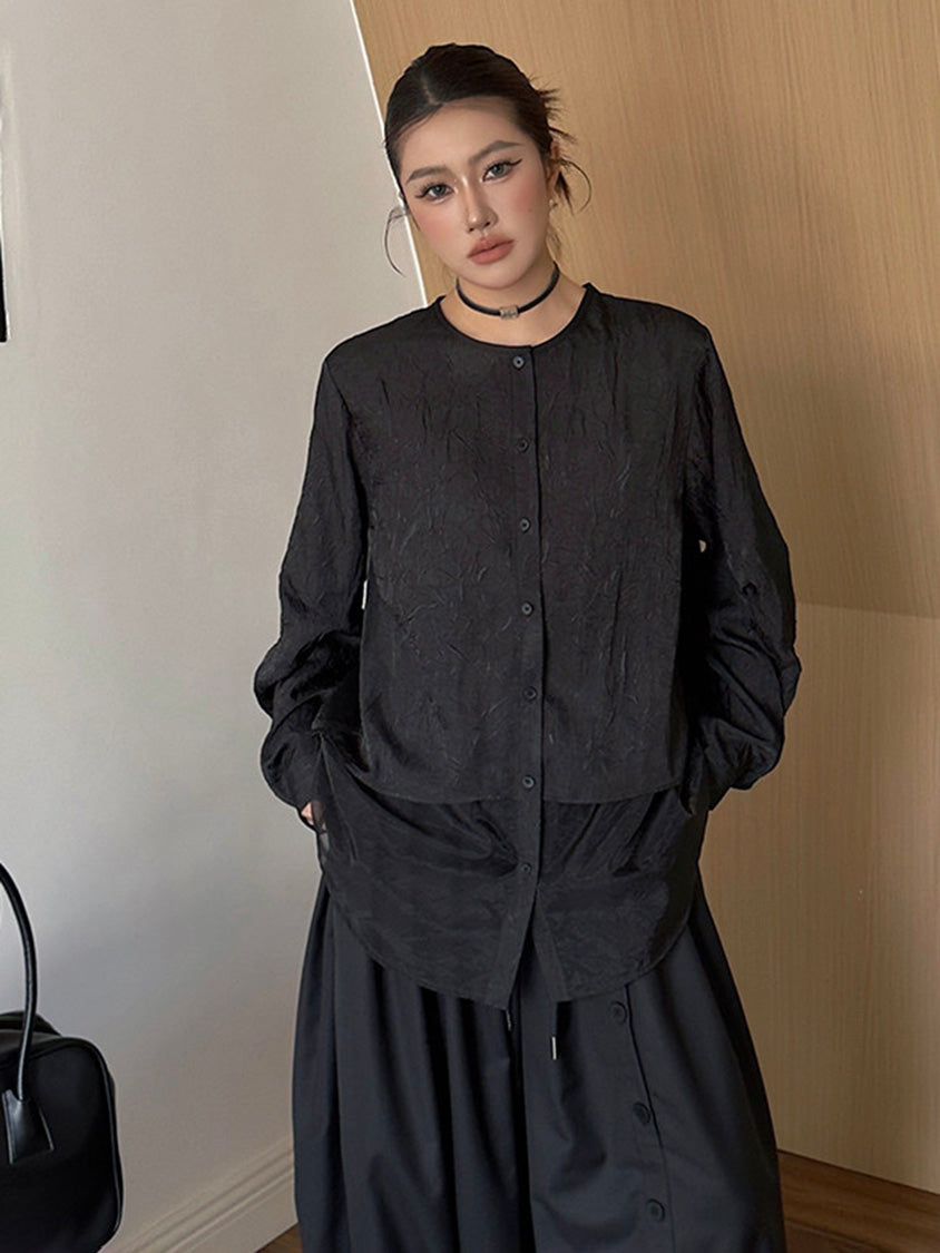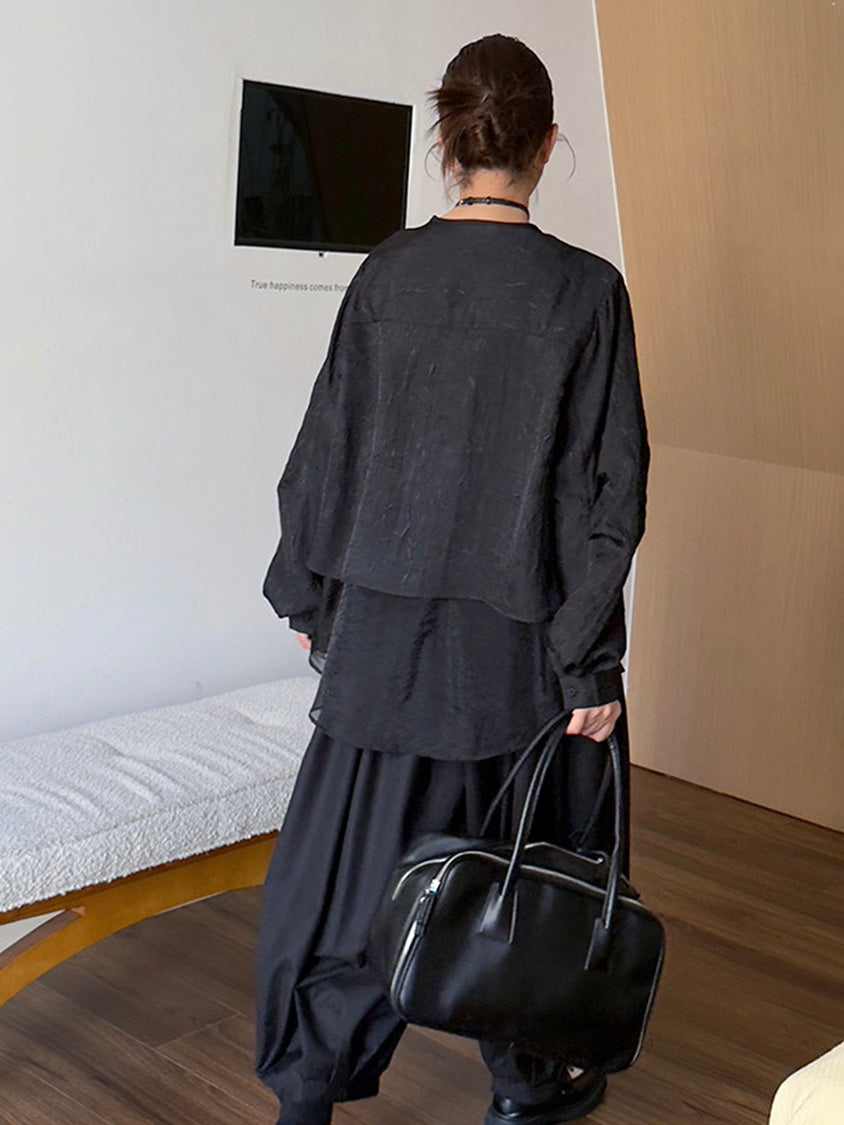 表層には細かなクラッシュ表情を持つシルク混コットン生地を用い、内側には透過性のある軽量レイヤーを重ねた二層構造。前立ては縦方向へ視線を導く直線ラインで構成され、ラウンドカットの下層が揺らぎを添える。肩まわりは落ち感を保ちながら、袖には緩やかな分量を持たせ、動作に合わせて陰影が生まれる設計。全体は静かな張りと柔らかさが共存する空気感へ導かれる。