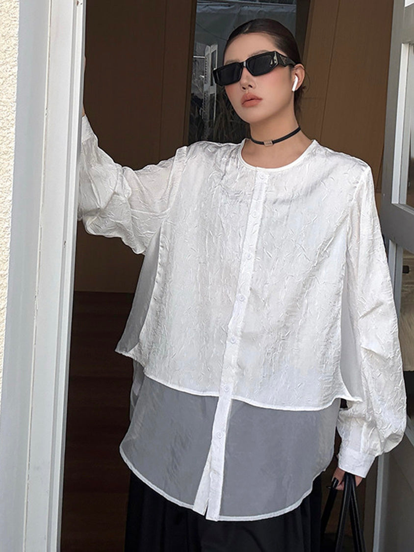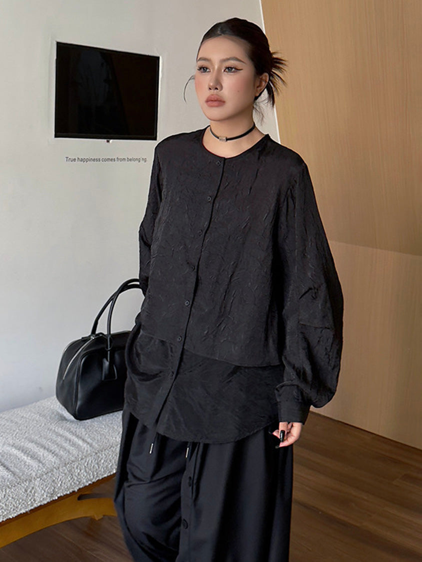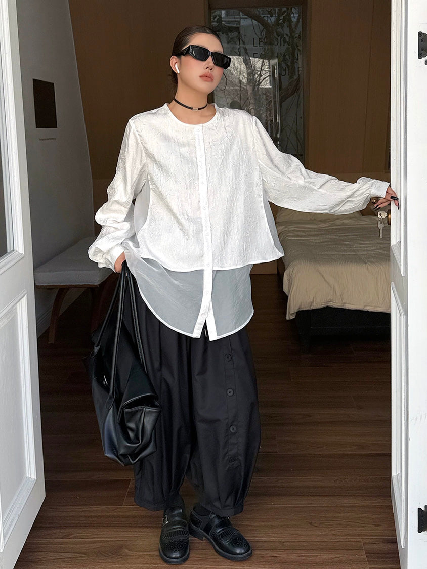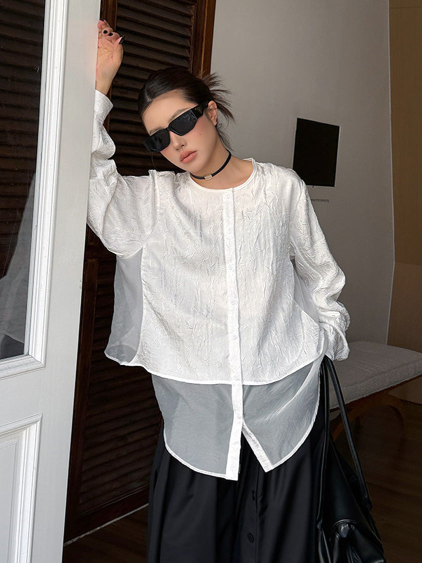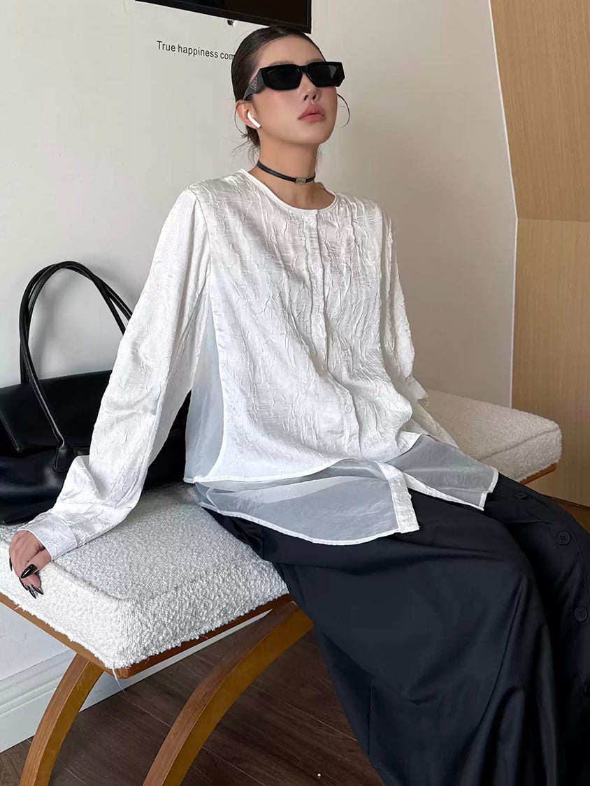 表層には細かなクラッシュ表情を持つシルク混コットン生地を用い、内側には透過性のある軽量レイヤーを重ねた二層構造。前立ては縦方向へ視線を導く直線ラインで構成され、ラウンドカットの下層が揺らぎを添える。肩まわりは落ち感を保ちながら、袖には緩やかな分量を持たせ、動作に合わせて陰影が生まれる設計。全体は静かな張りと柔らかさが共存する空気感へ導かれる。