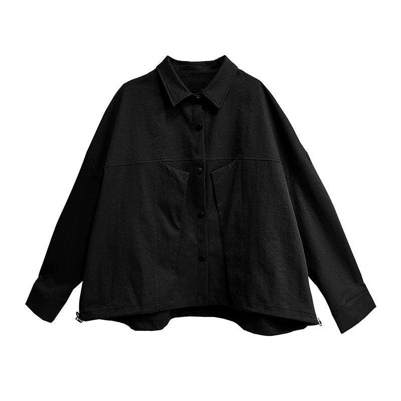 シャツは身頃のクロスヘム構造と立体パターンによって、シンプルながらも建築的なフォルムを演出。やや落ちた肩とワイドスリーブが抜け感を加え、裾のサイドファスナーでシルエットの調整も可能。スカートは大きく重なるラップ風フロントと深めのドレープが特徴で、ウエストはゴム仕様のため着脱しやすい。セットでの着用はもちろん、それぞれ単品でも使いやすく、都市的でクールな印象を与えるシリーズ