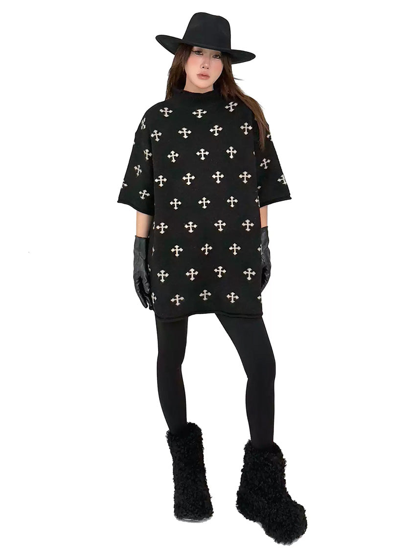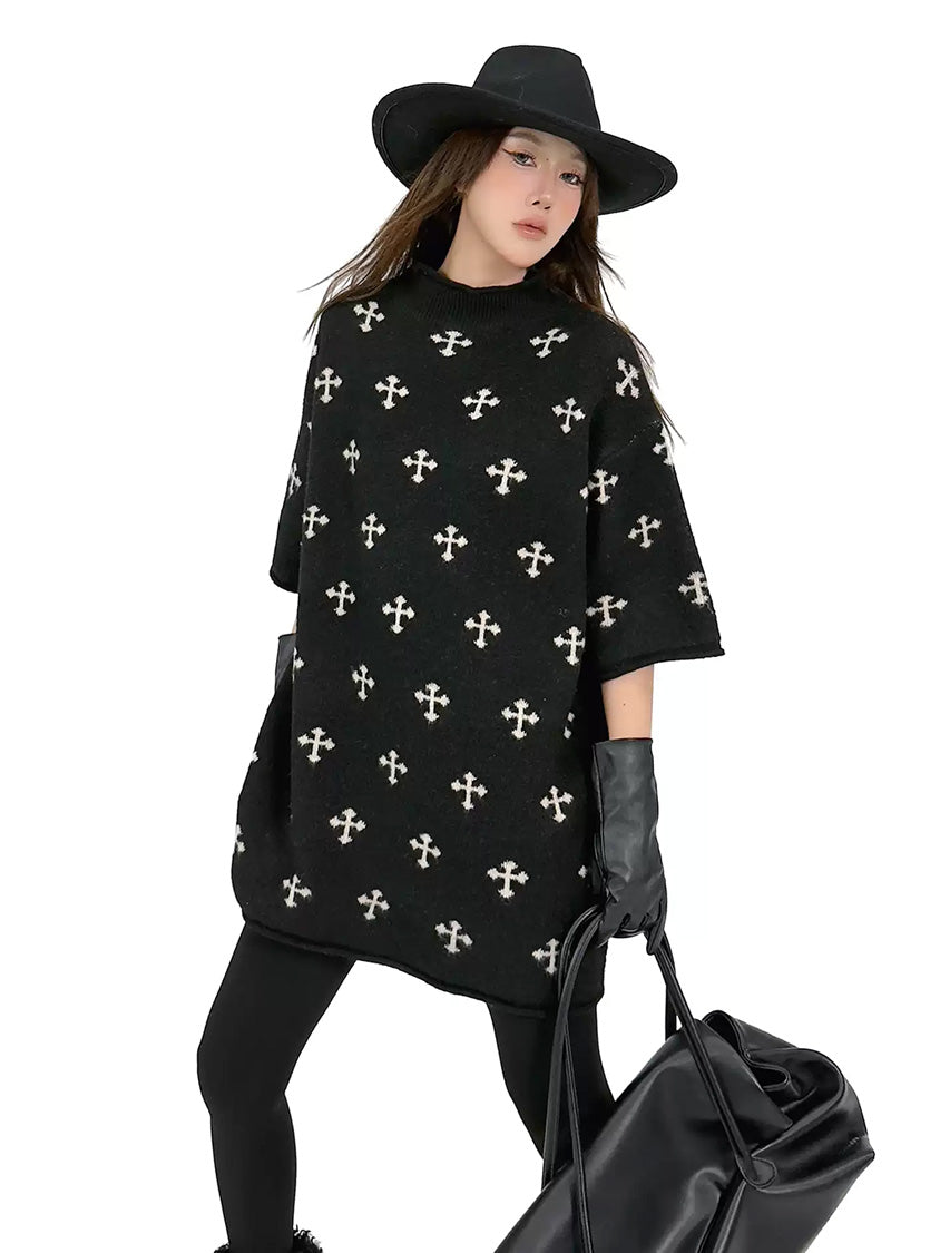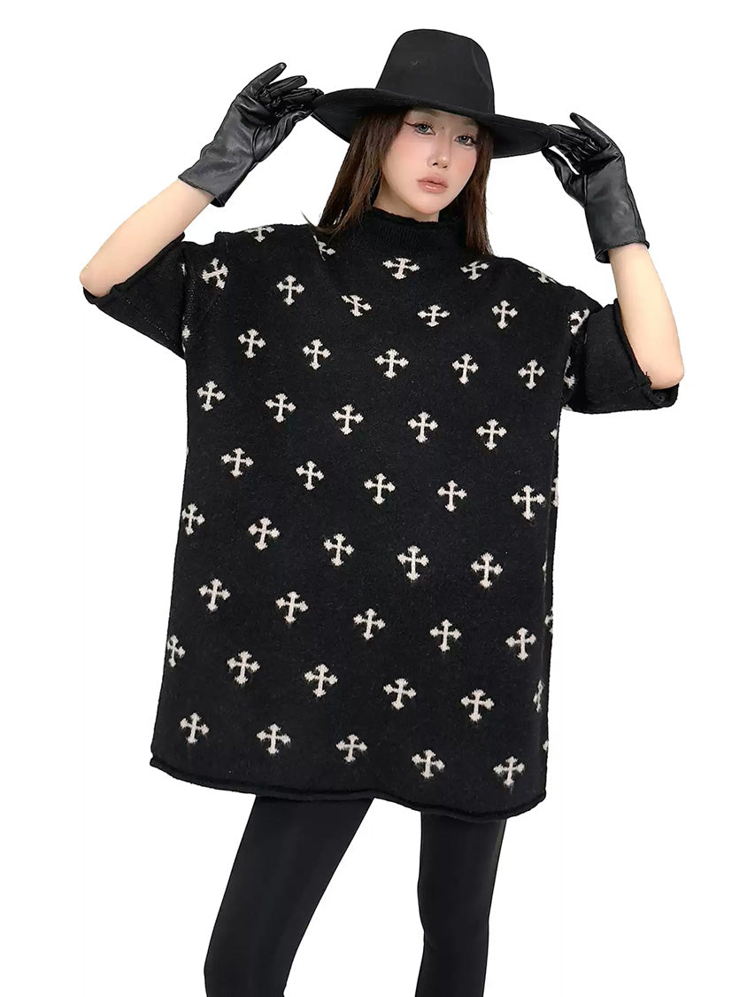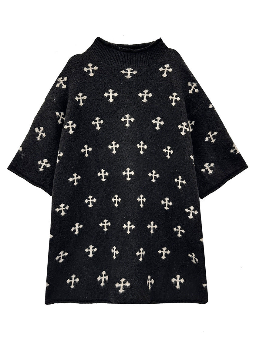 全体に散りばめられたクロスパターンが印象を形成するニットトップ。やや高さのあるネックラインと肩幅に余白を持たせた設計により、直線的で落ち着いた輪郭を描く。身頃から裾まで均一な分量感を保ち、動きに合わせて柔らかな表情が生まれる構成。単調になりやすい装いにリズムを与え、モード寄りの空気を引き寄せるトップ