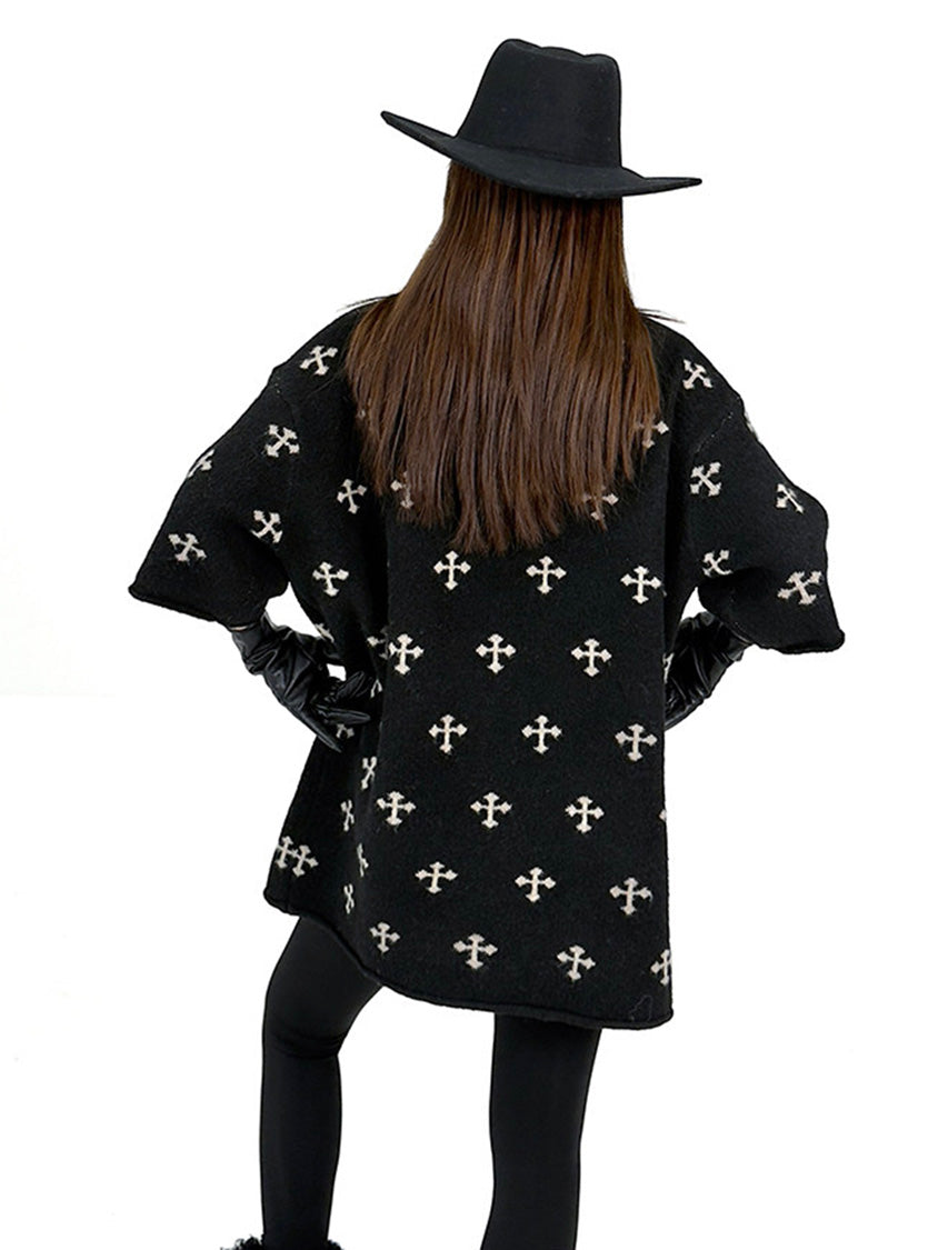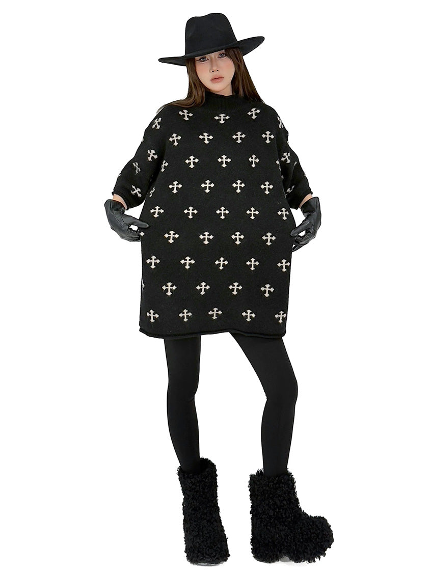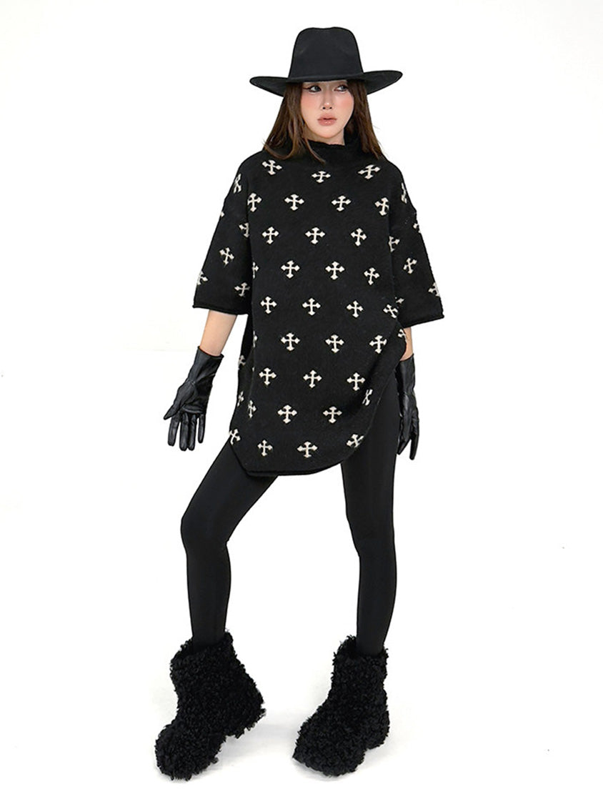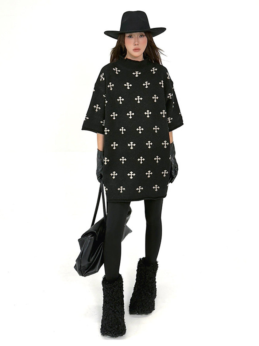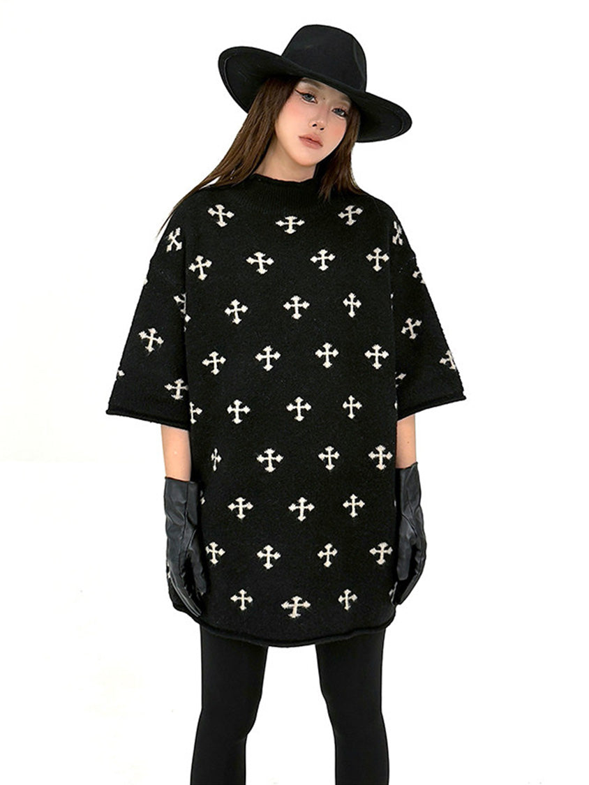 全体に散りばめられたクロスパターンが印象を形成するニットトップ。やや高さのあるネックラインと肩幅に余白を持たせた設計により、直線的で落ち着いた輪郭を描く。身頃から裾まで均一な分量感を保ち、動きに合わせて柔らかな表情が生まれる構成。単調になりやすい装いにリズムを与え、モード寄りの空気を引き寄せるトップ
