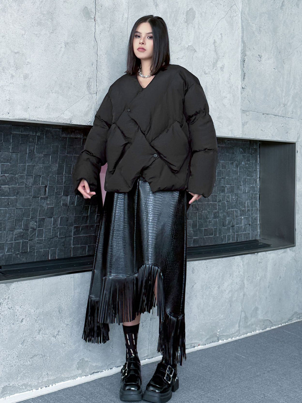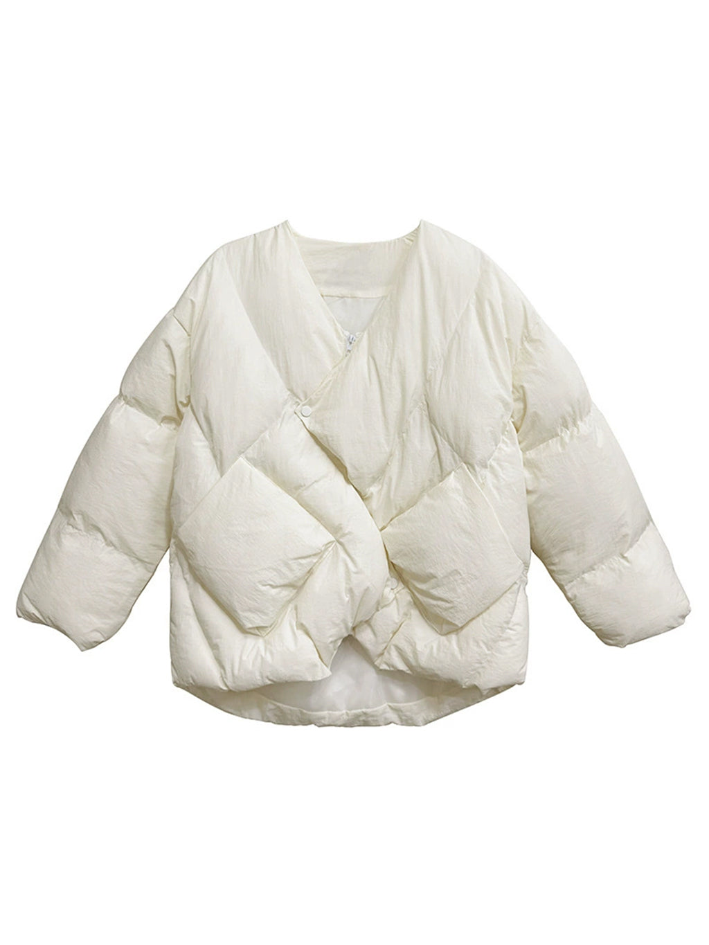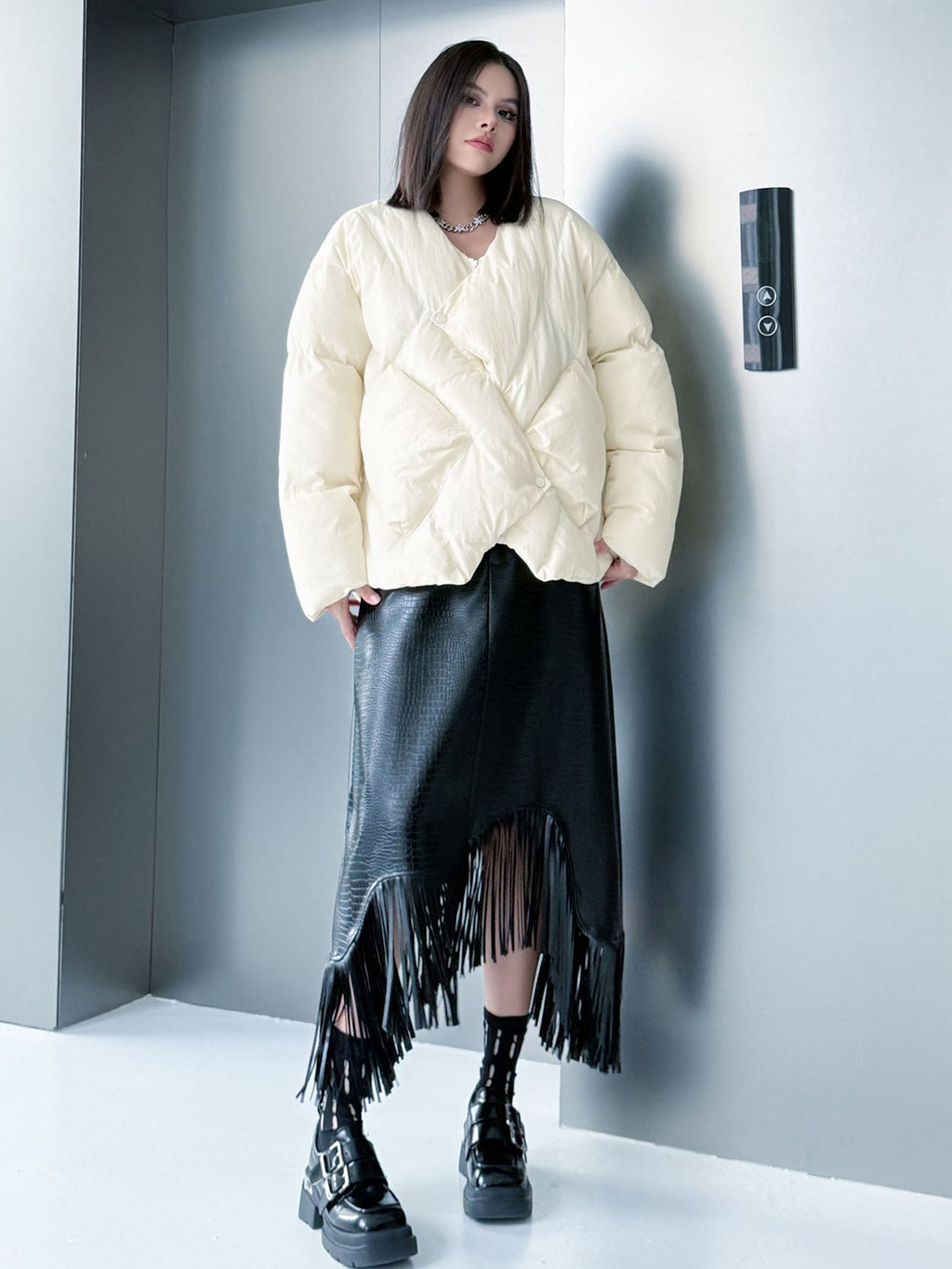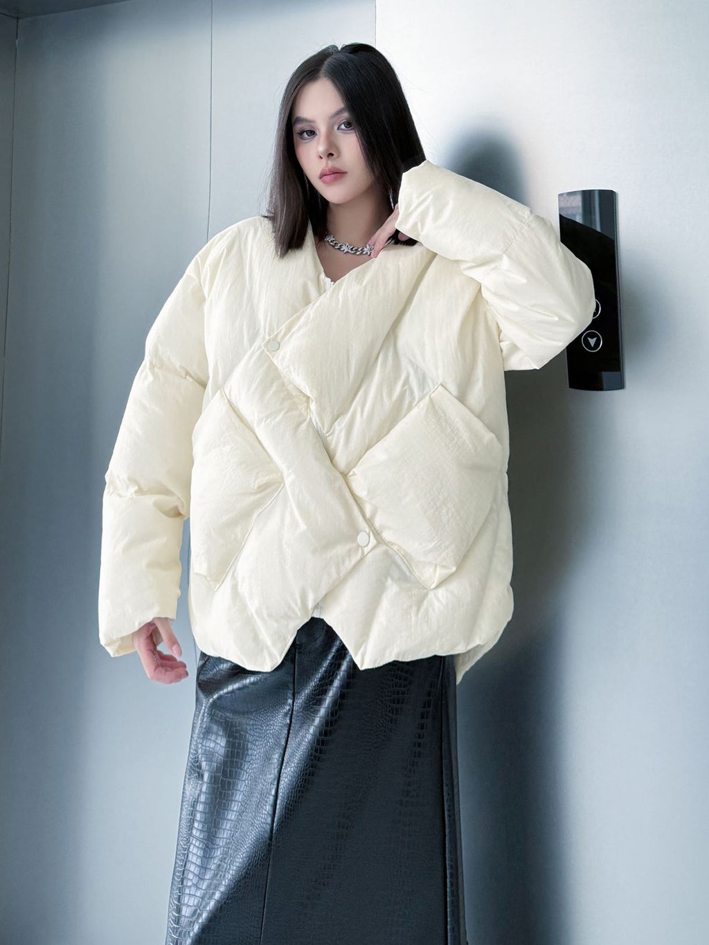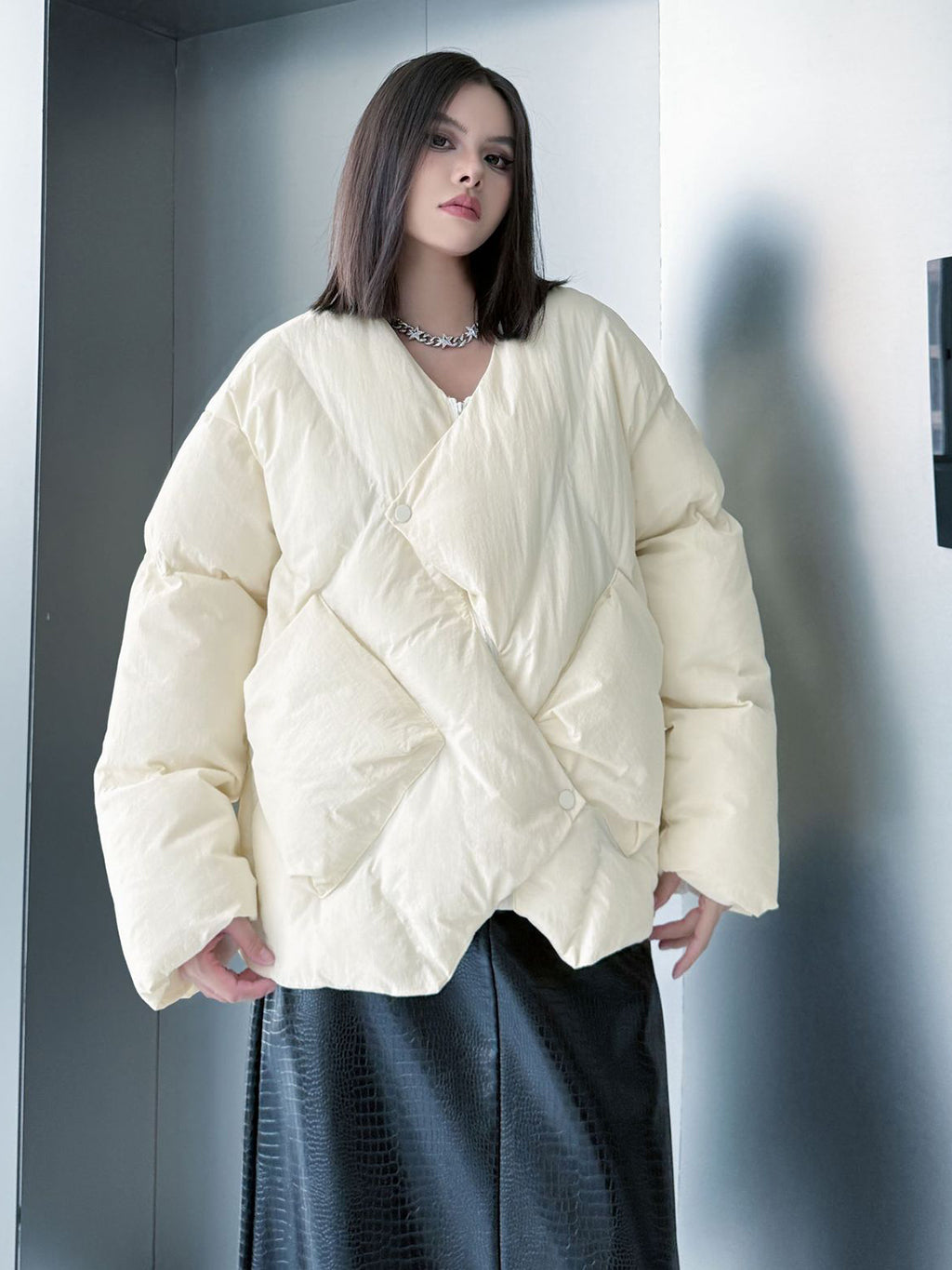 クロス状に配置されたキルティングラインが立体的な陰影を描くダウンジャケット。深めのVネックが顔まわりをすっきり見せ、ボタンで留めるシンプルな前開き仕様。ボリュームのある袖とゆるやかな肩の落ち感がリラックスした印象を生み、構築的なフォルムが全体をモードにまとめている。軽量でふっくらとした質感が暖かさを保ちながら、軽快なスタイリングを実現する。