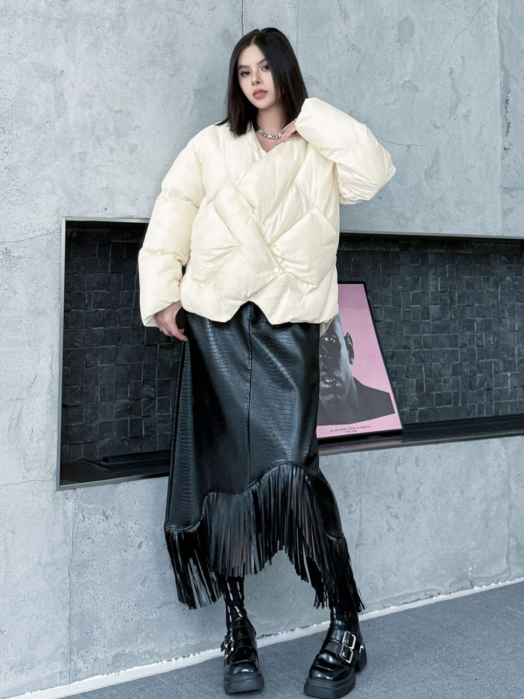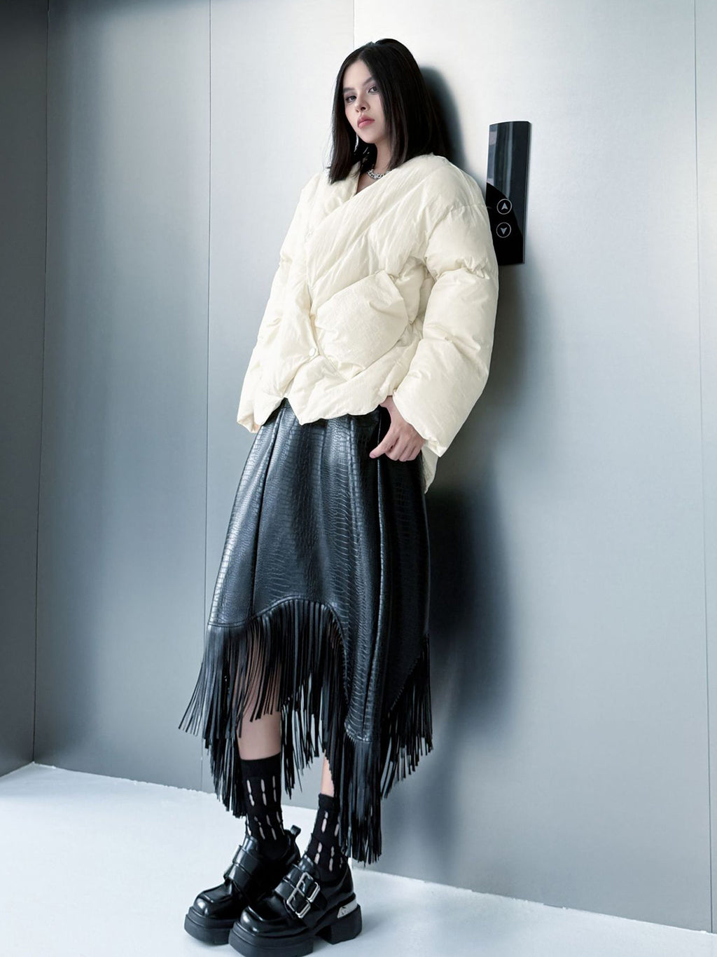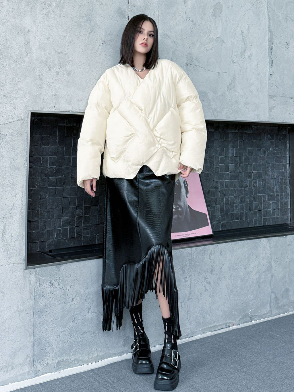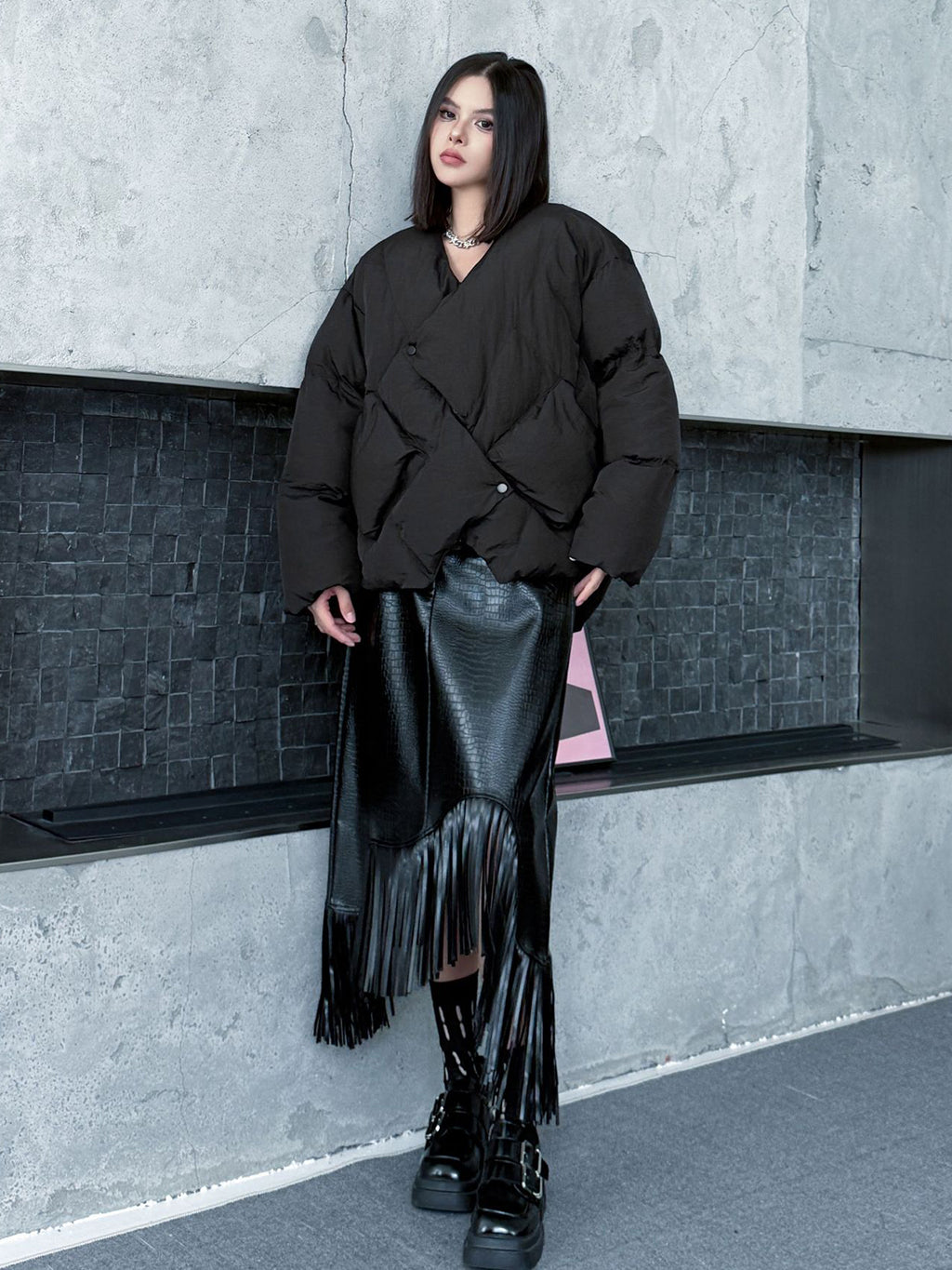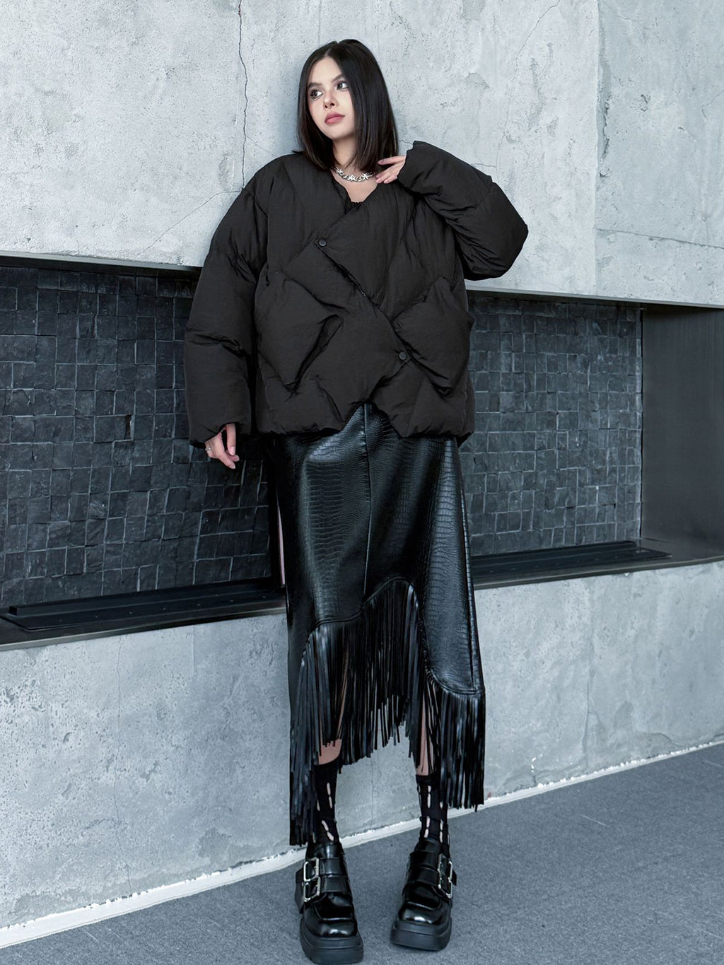 クロス状に配置されたキルティングラインが立体的な陰影を描くダウンジャケット。深めのVネックが顔まわりをすっきり見せ、ボタンで留めるシンプルな前開き仕様。ボリュームのある袖とゆるやかな肩の落ち感がリラックスした印象を生み、構築的なフォルムが全体をモードにまとめている。軽量でふっくらとした質感が暖かさを保ちながら、軽快なスタイリングを実現する。