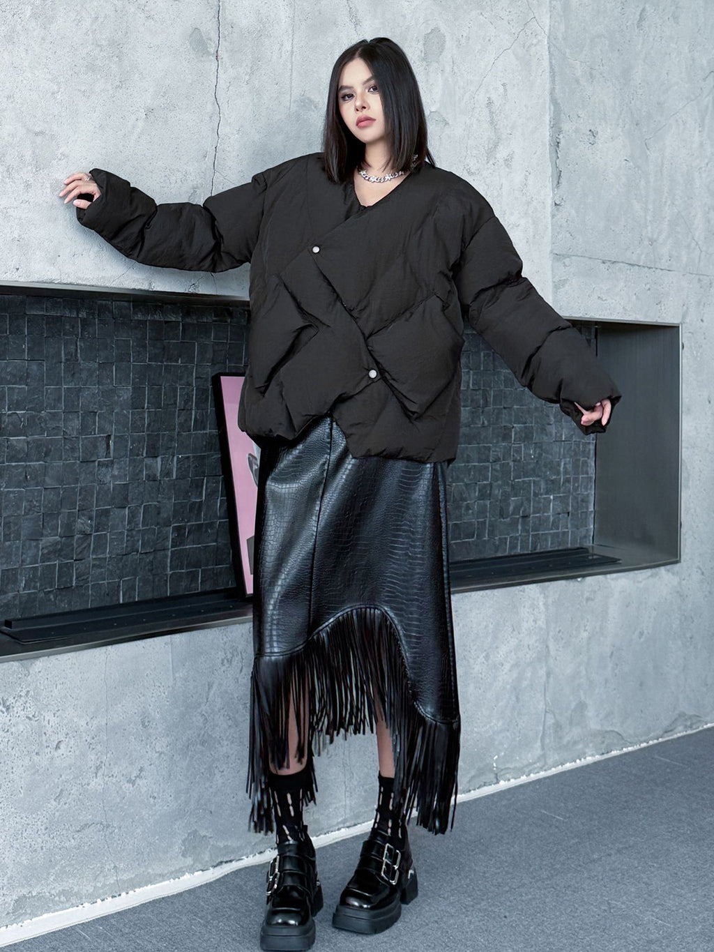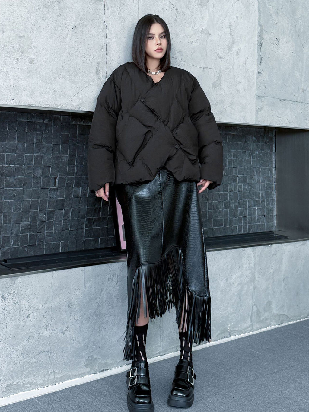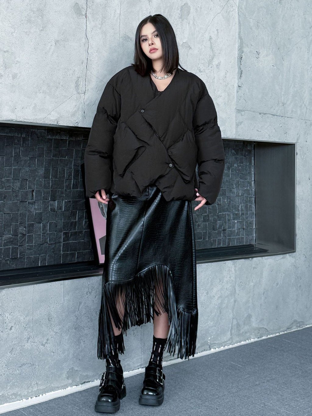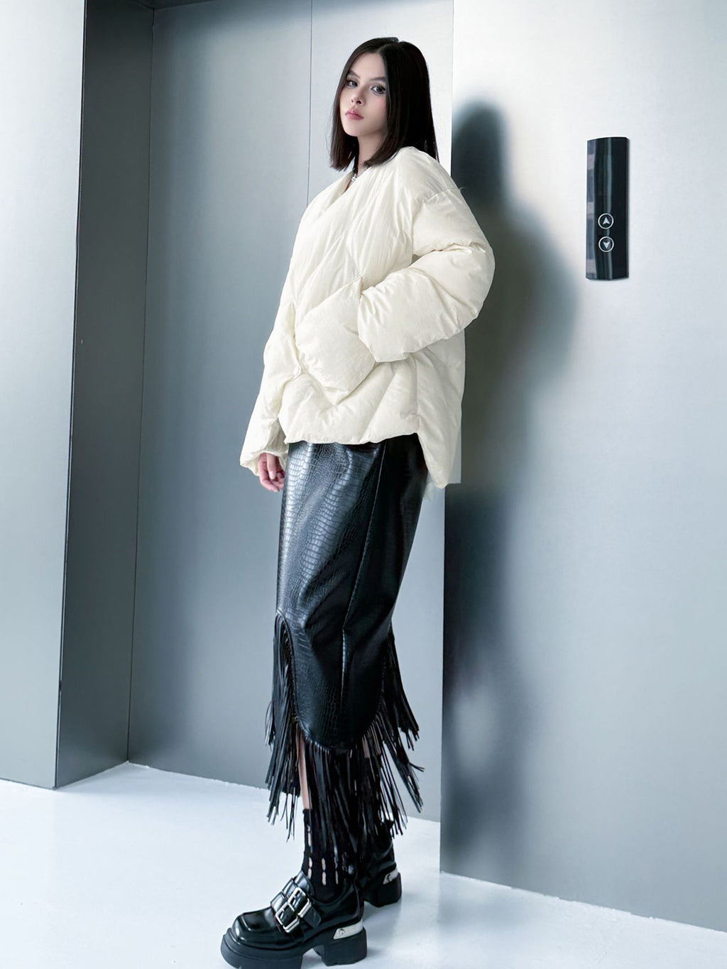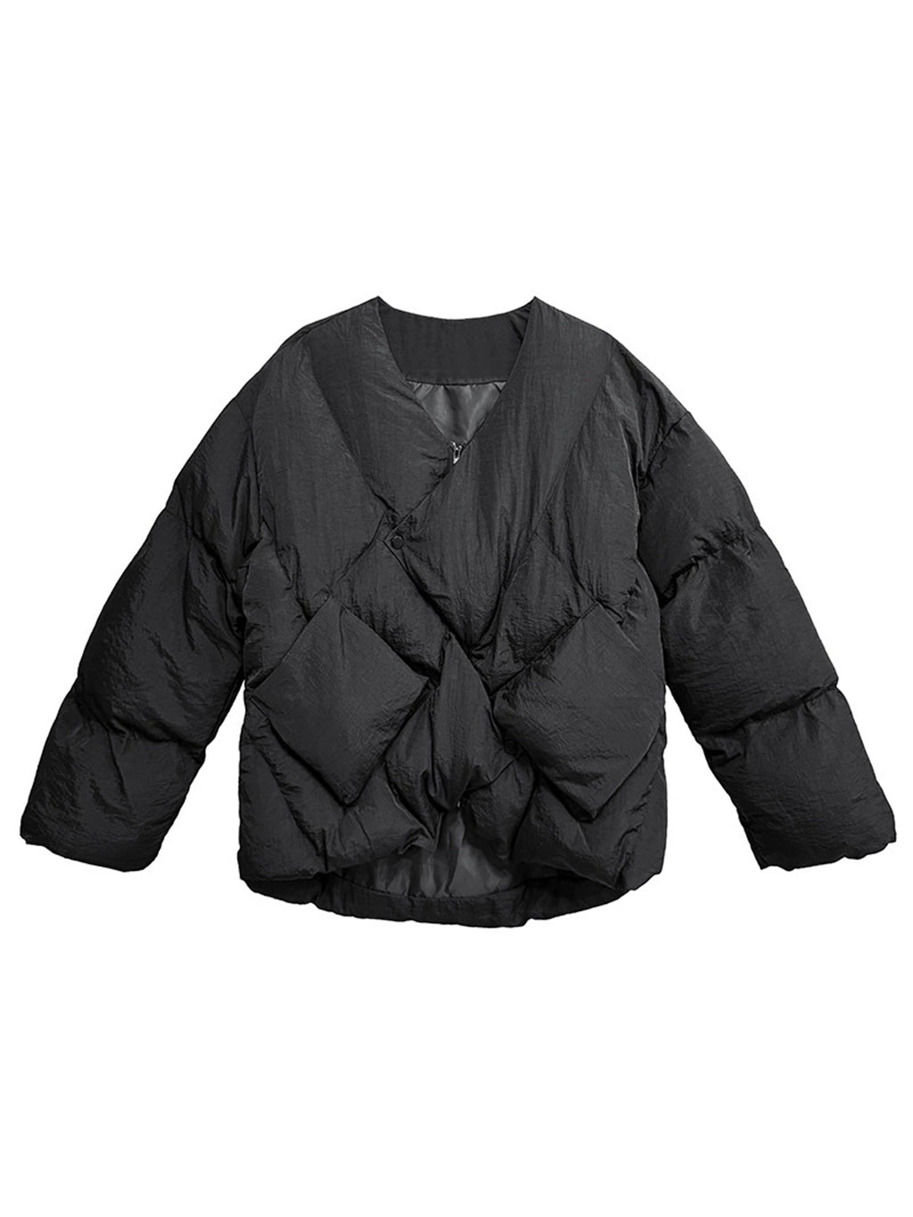 クロス状に配置されたキルティングラインが立体的な陰影を描くダウンジャケット。深めのVネックが顔まわりをすっきり見せ、ボタンで留めるシンプルな前開き仕様。ボリュームのある袖とゆるやかな肩の落ち感がリラックスした印象を生み、構築的なフォルムが全体をモードにまとめている。軽量でふっくらとした質感が暖かさを保ちながら、軽快なスタイリングを実現する。