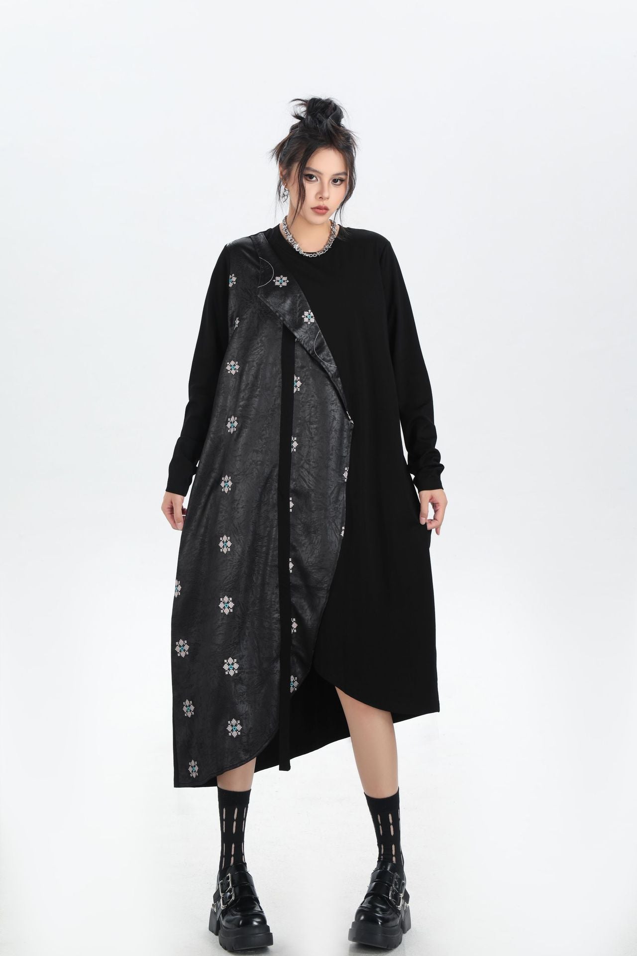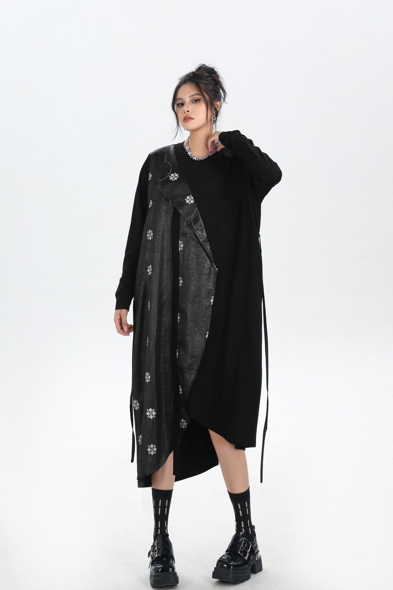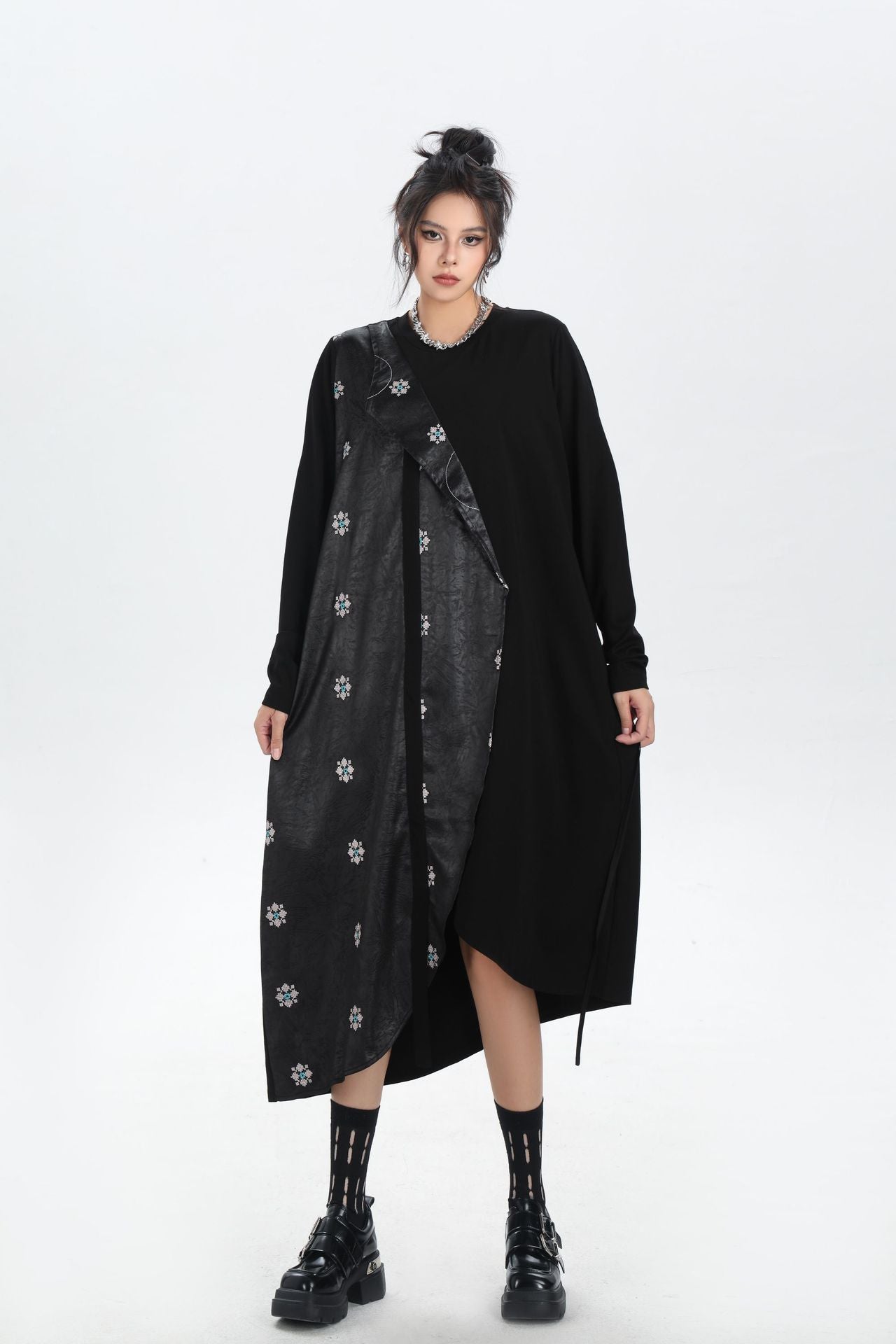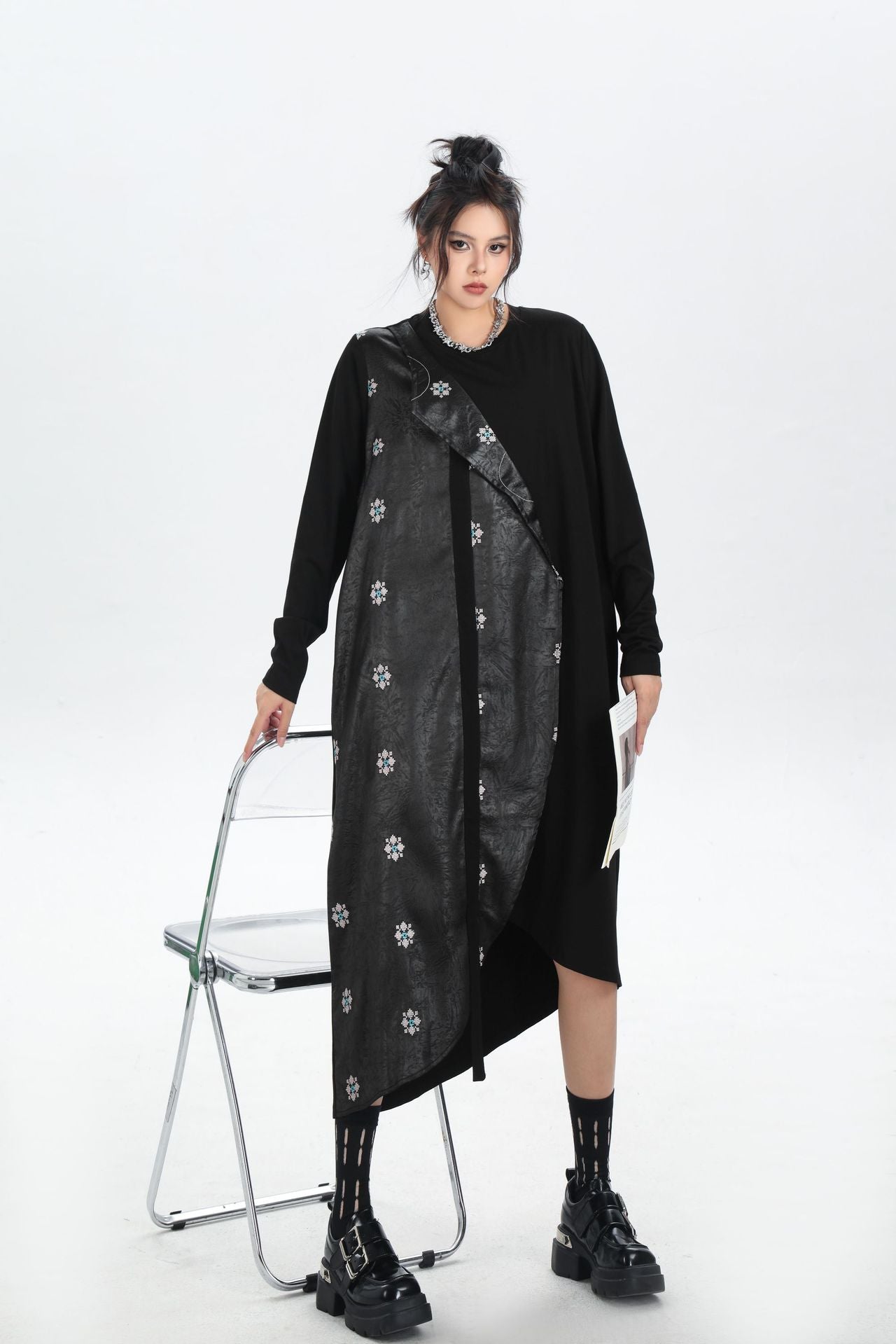 片側に施された艶のあるPU素材のパネルが特徴的なデザインドレス。パネルには小花を思わせる規則的な刺繍模様が施され、立体的な質感が全体に華やかさをプラス。ベースはブラックのカットソー素材で、ストンと落ちるロングシルエットが体のラインを拾わず、美しく着こなせる構造。アシンメトリックに垂れるフロントのデザインはドレープを強調し、洗練された印象を与える。バックにはシンプルなラインが施されており、全体のバランスも秀逸。