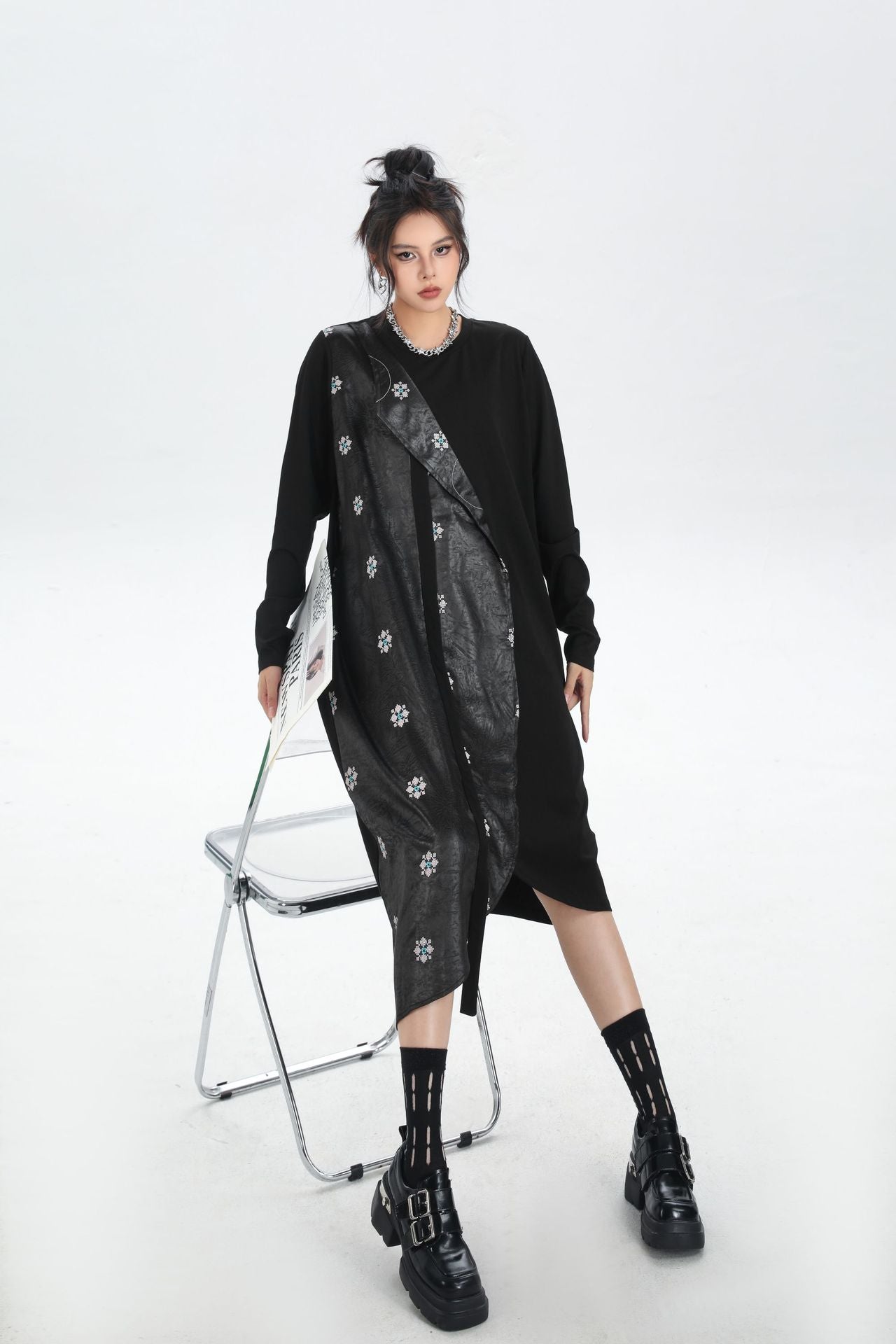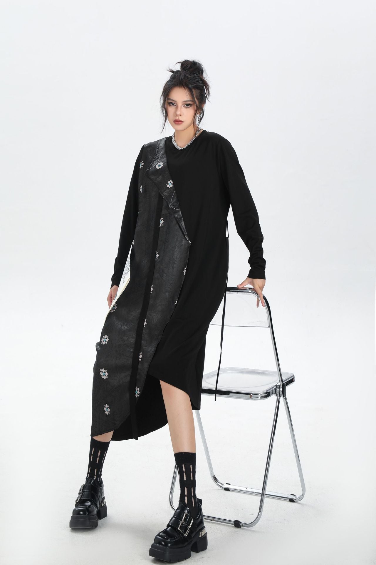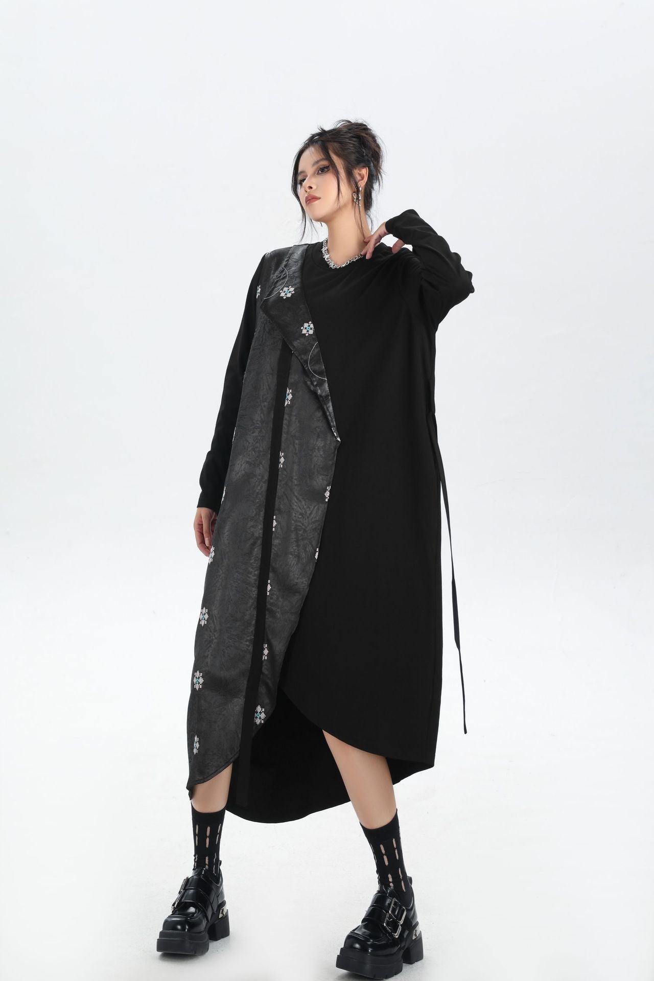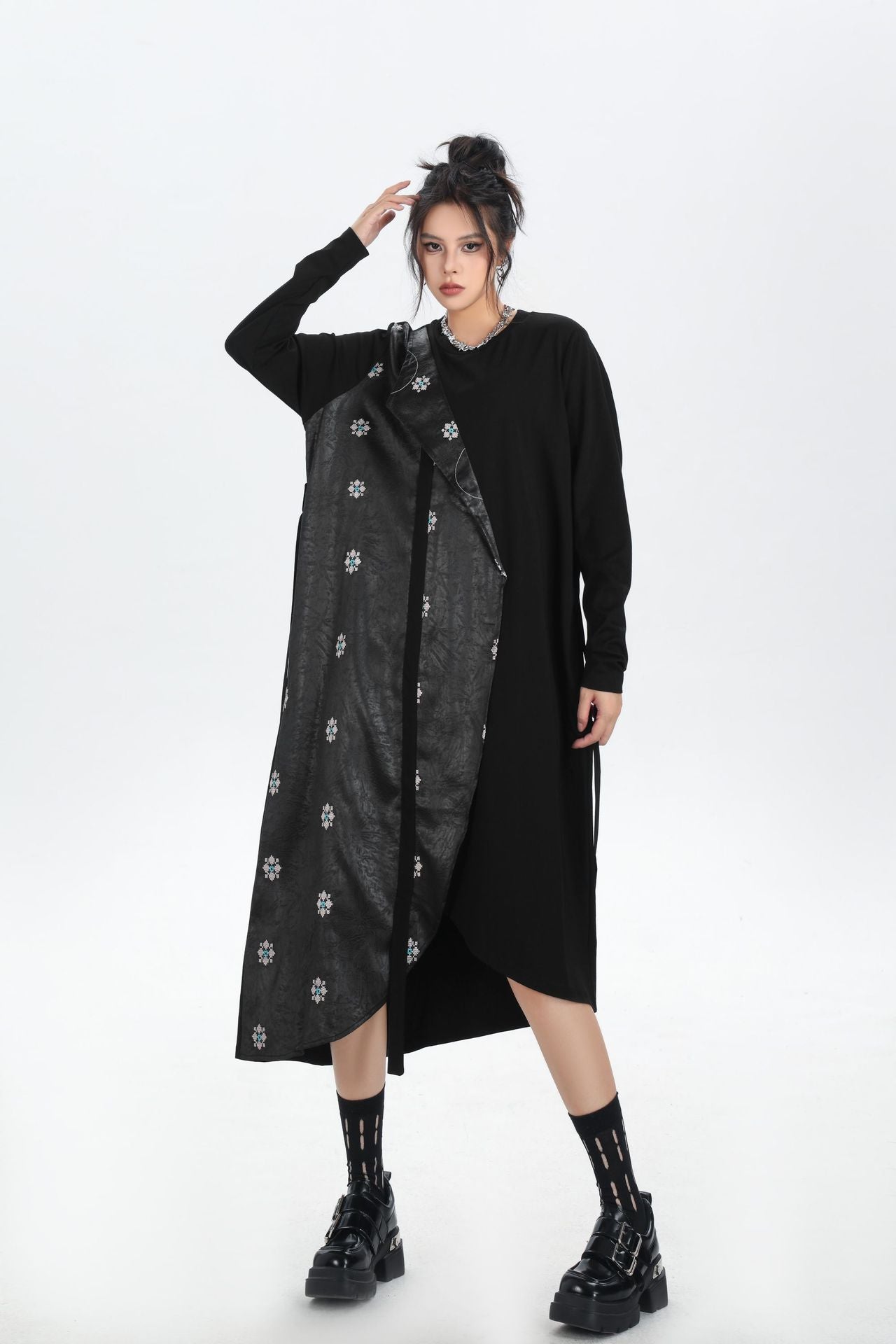 片側に施された艶のあるPU素材のパネルが特徴的なデザインドレス。パネルには小花を思わせる規則的な刺繍模様が施され、立体的な質感が全体に華やかさをプラス。ベースはブラックのカットソー素材で、ストンと落ちるロングシルエットが体のラインを拾わず、美しく着こなせる構造。アシンメトリックに垂れるフロントのデザインはドレープを強調し、洗練された印象を与える。バックにはシンプルなラインが施されており、全体のバランスも秀逸。